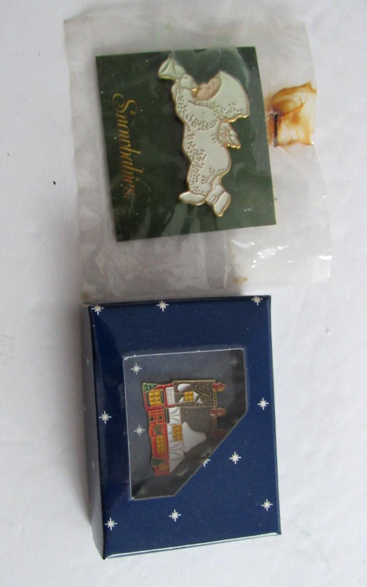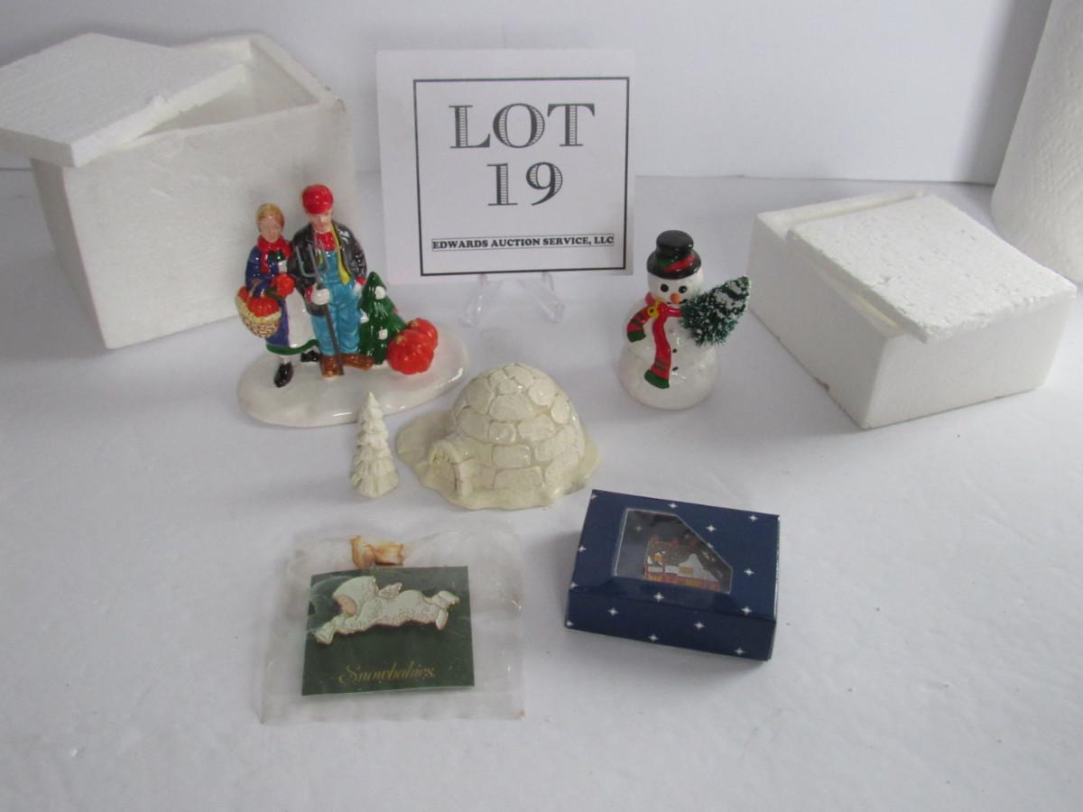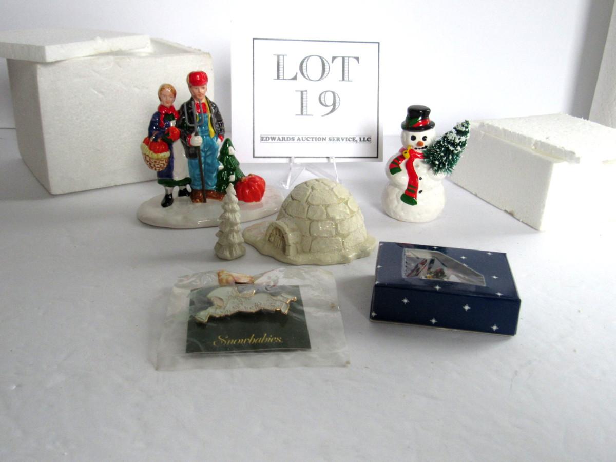 Farmer and wife figurine is mint in styro, no box. The pewter miniature igloo and tree is very nice, box is poor. The two pins are unused in package but one has rust on the plastic bag. The snowman is in nice shape, not sure who made it. Shipping is available at actual cost plus $5 per box handling fee.