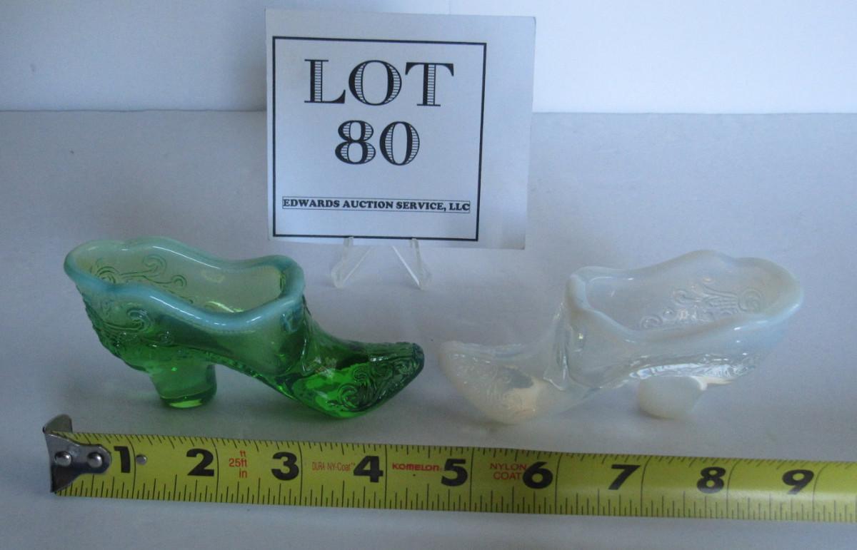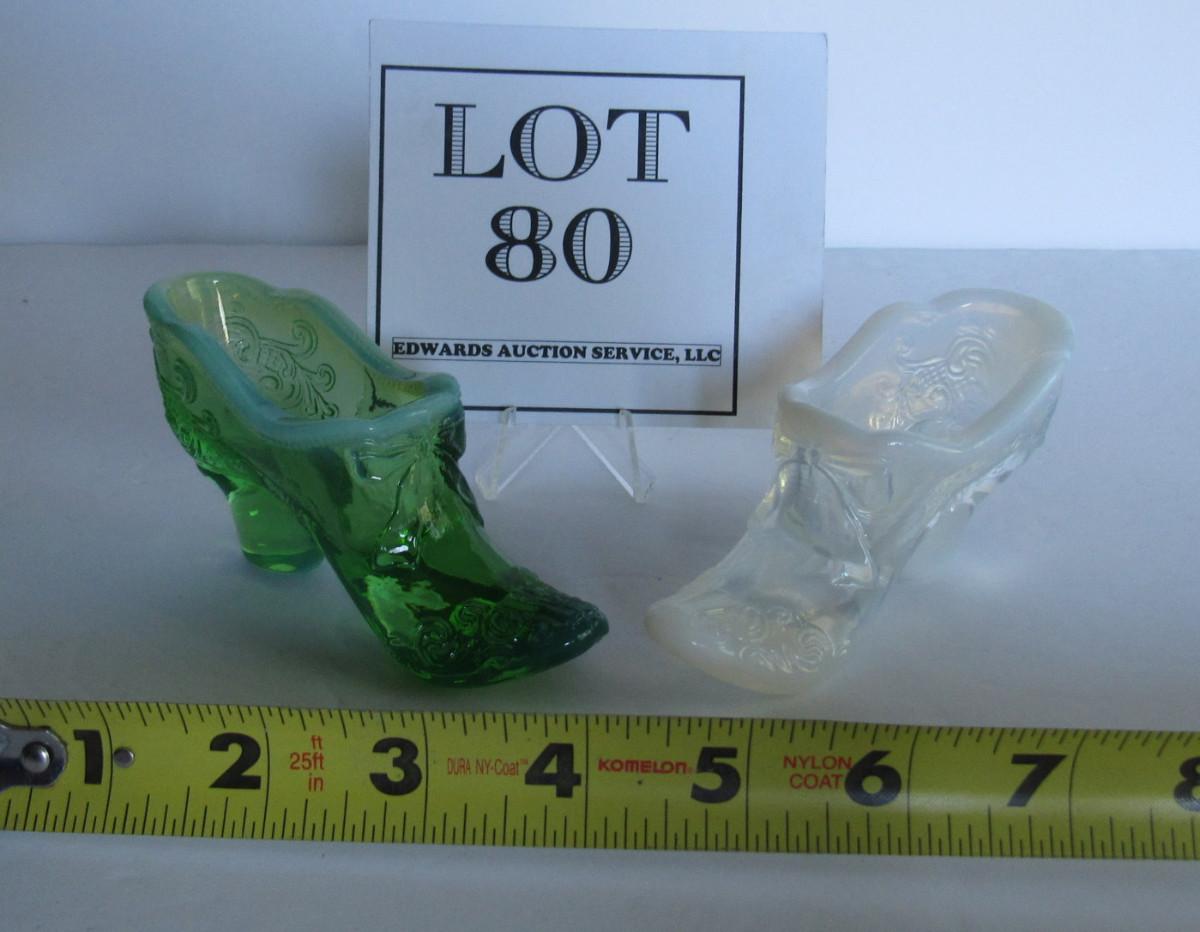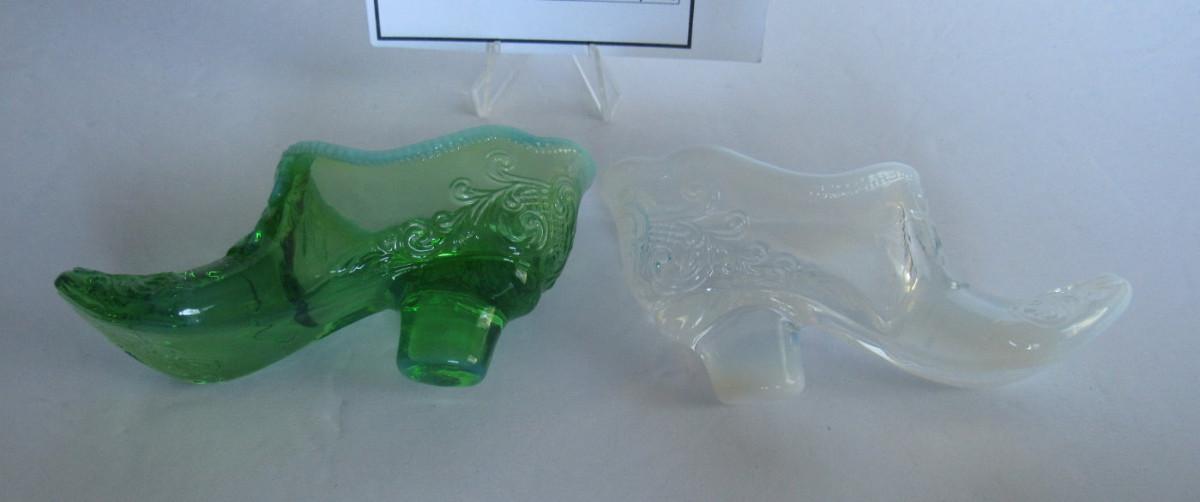 Older Mosser Glass Slippers, Green and Clear Opalescent