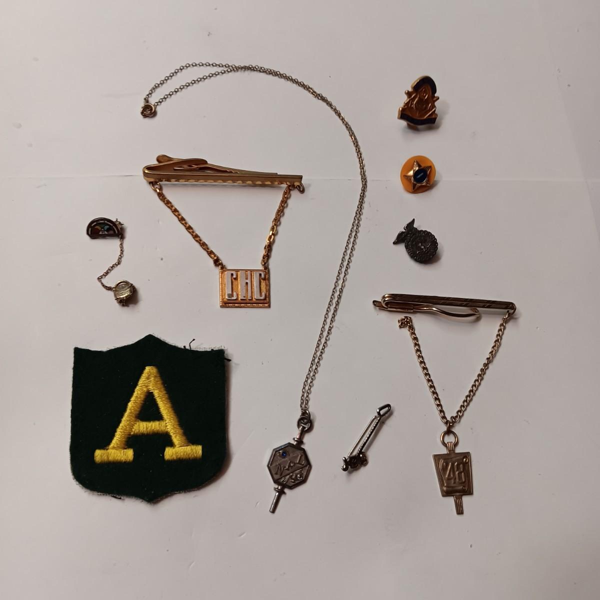 OLDER SCHOOL, WORK AND OTHER PINS, TIE CLIPS AND PENDANT