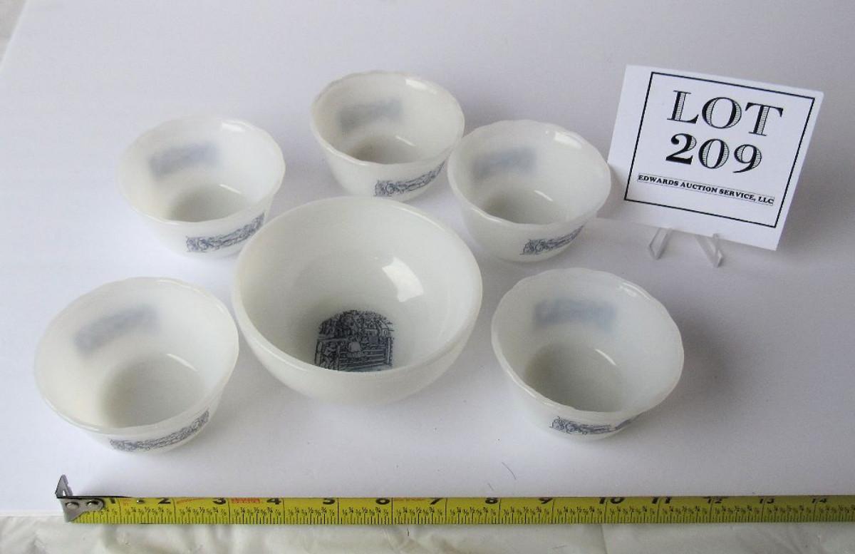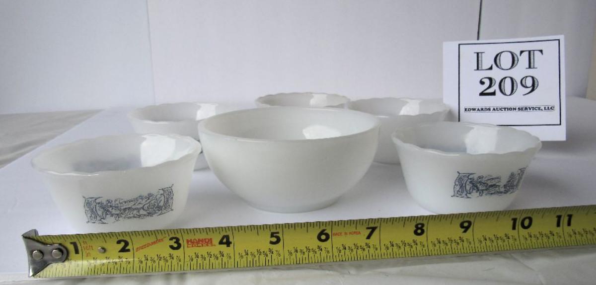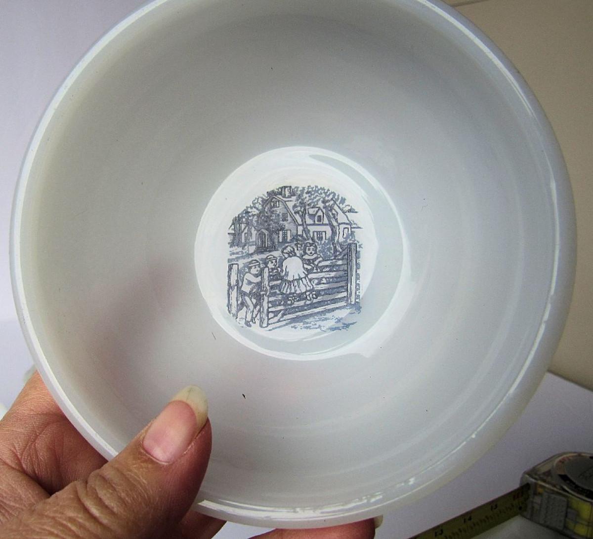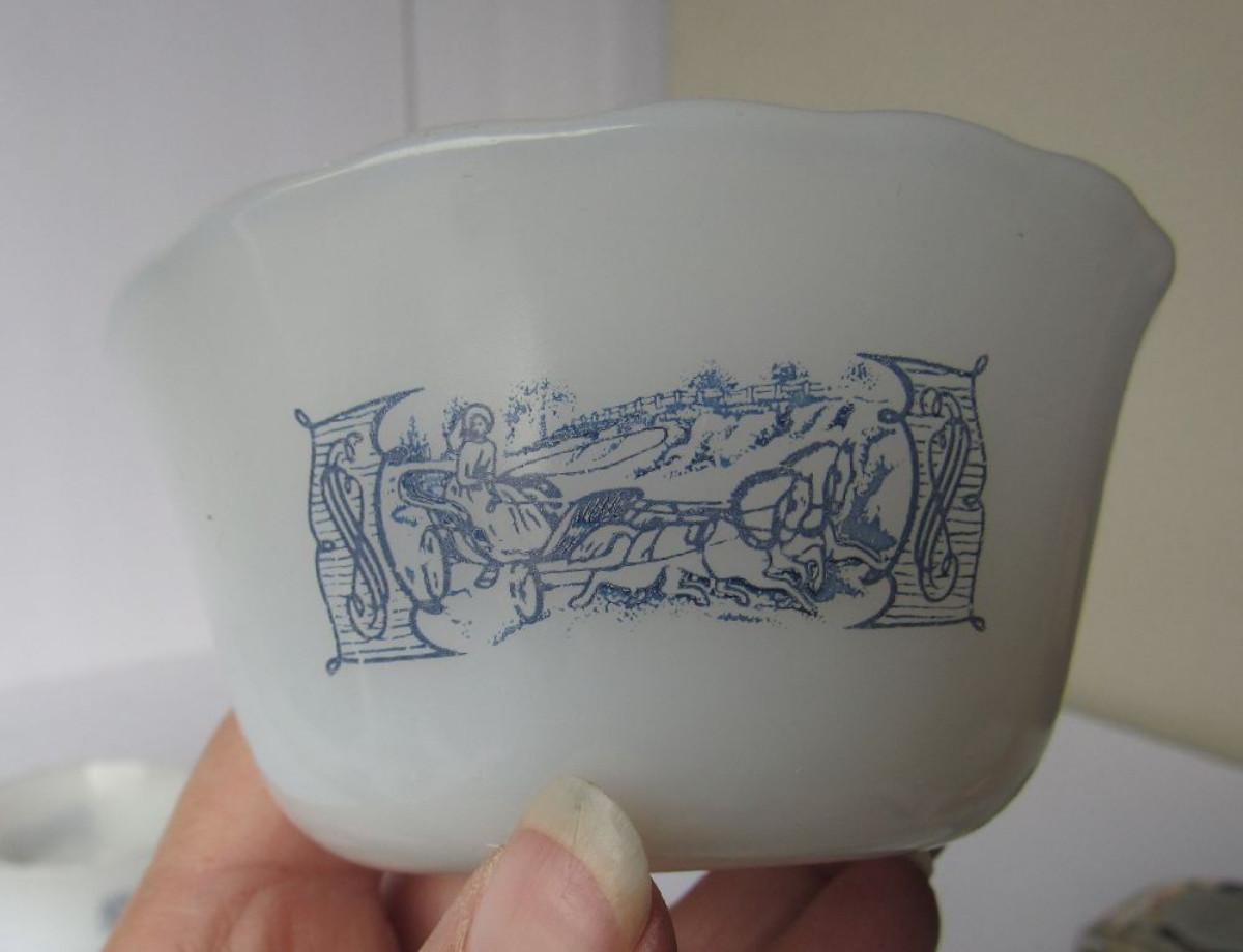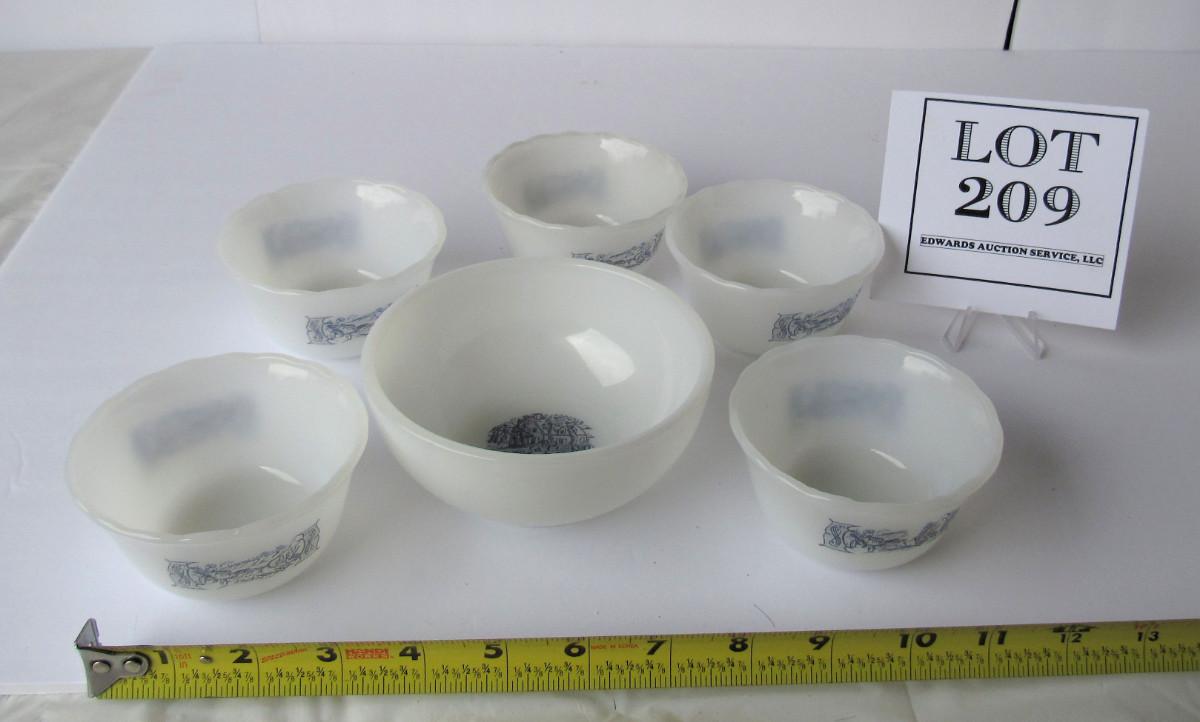 Older White Milk Glass Berry and Cereal Bowls With Blue Design