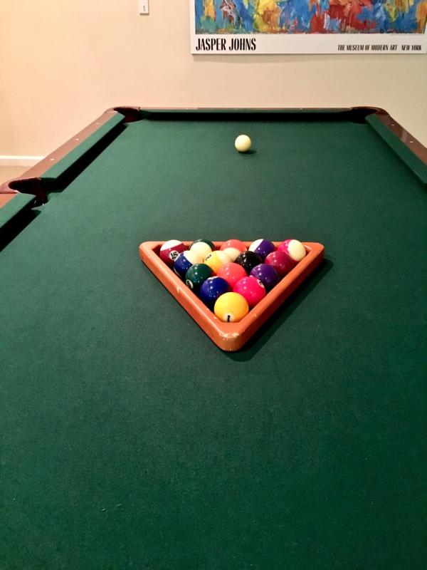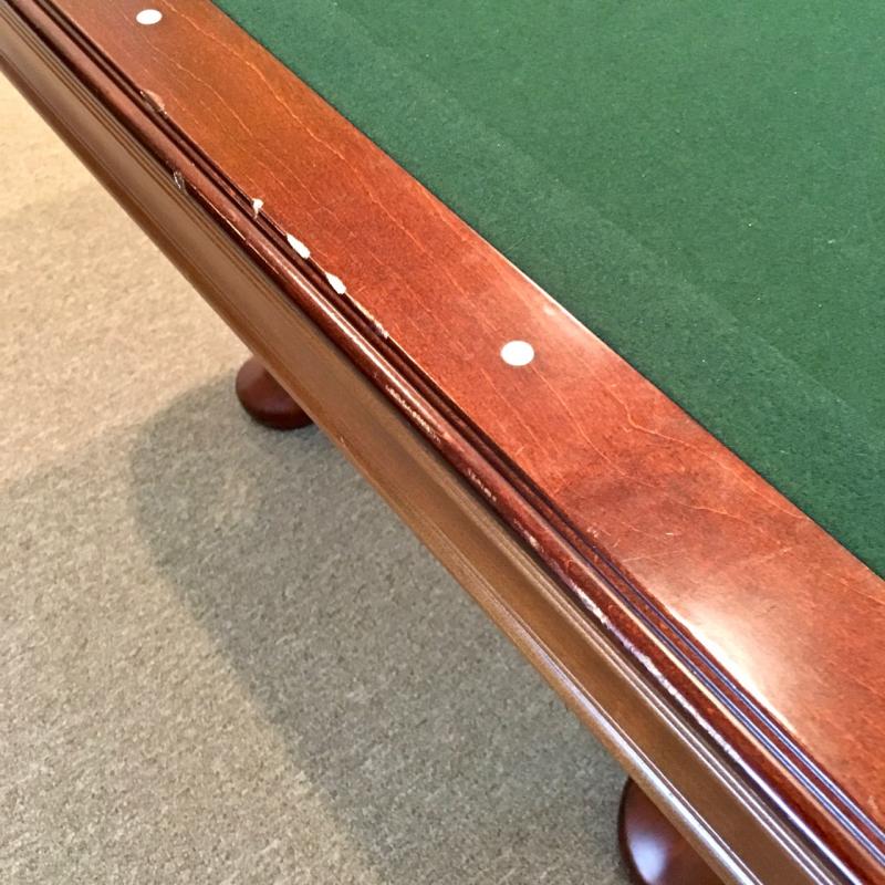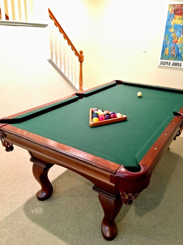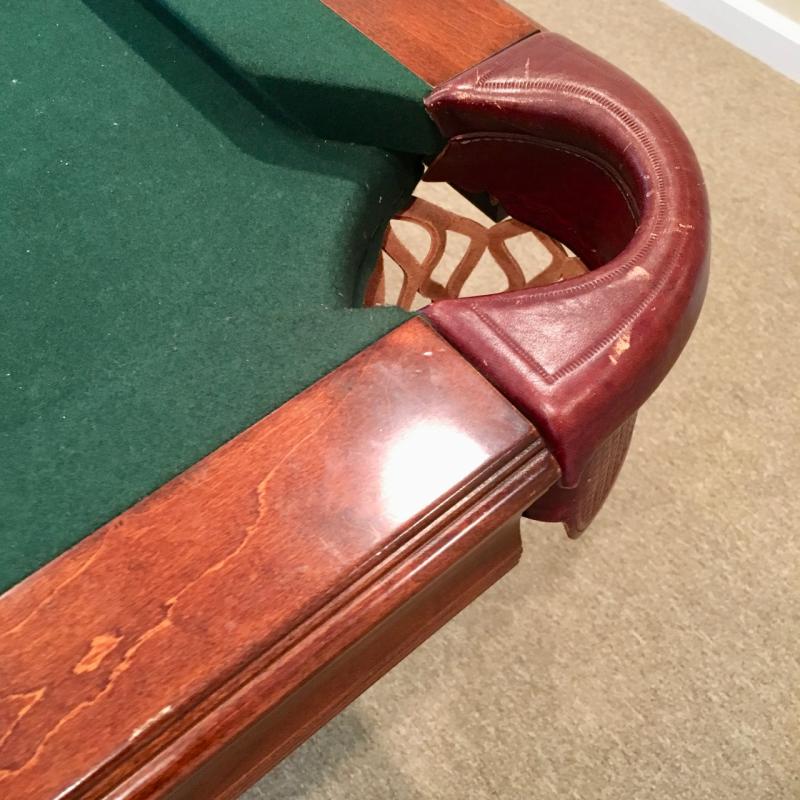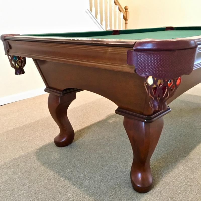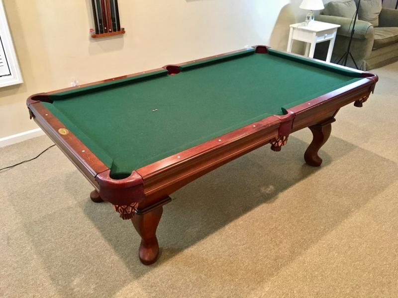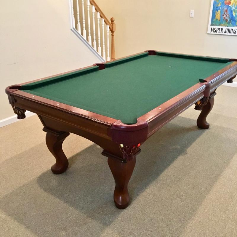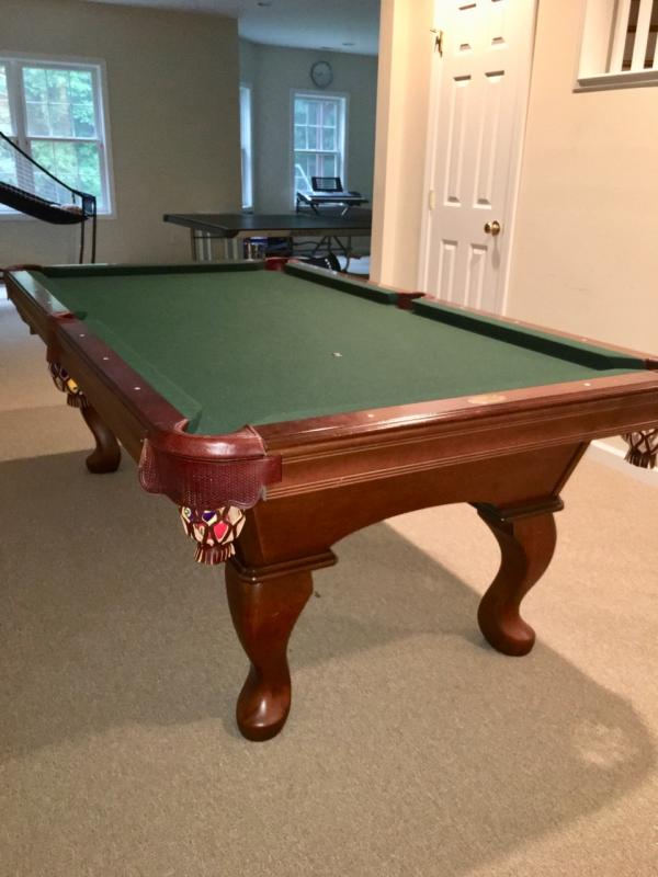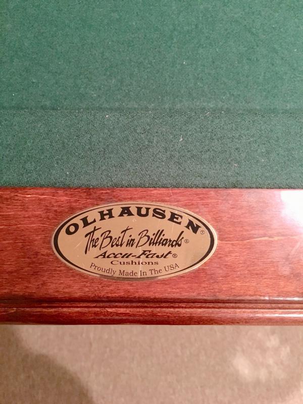 Olhausen Eclipse Accu-Fast 8ft quality pool table with woven leather pockets & green felt, includes wall rack and balls. Maple finish. Also comes with the following cue sticks; (2) Dufferin 19 oz, (2) Cyclone 19 oz, (2) Crest 20 oz. There is some wear on top edge of wood and some scratches on leather pockets, see photos. Original cost $3000 purchased at The Recreation Showroom Brookfield, CT. Pool Table is also being advertised and listed locally. ***CONDITION: Very Good, some scratches on wood and leather*** Local pick up only, Newtown CT ***PAYMENT MUST BE RECEIVED BY PICKUP DATES, POOL TABLE MUST BE MOVED WITHIN 5 BUSINESS DAYS OF CLOSE OF AUCTION***