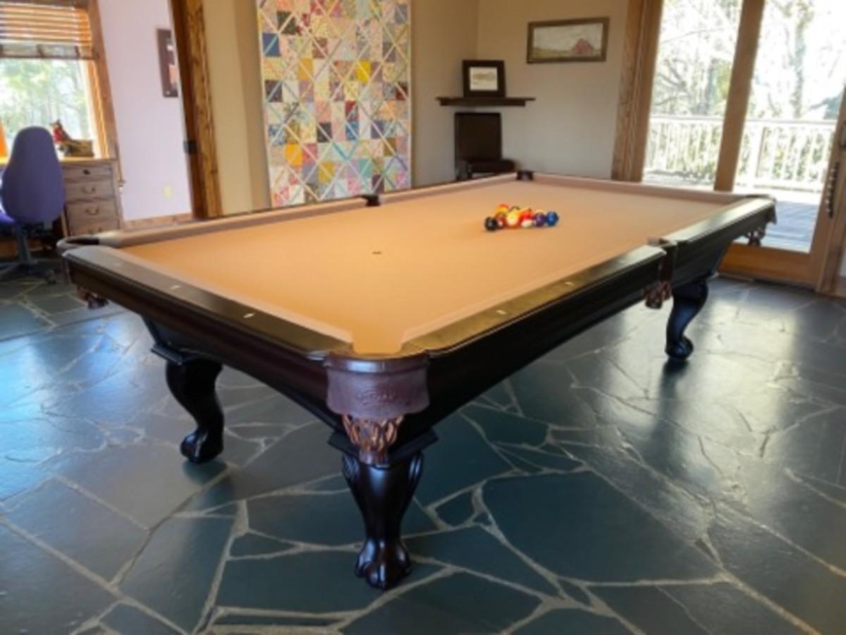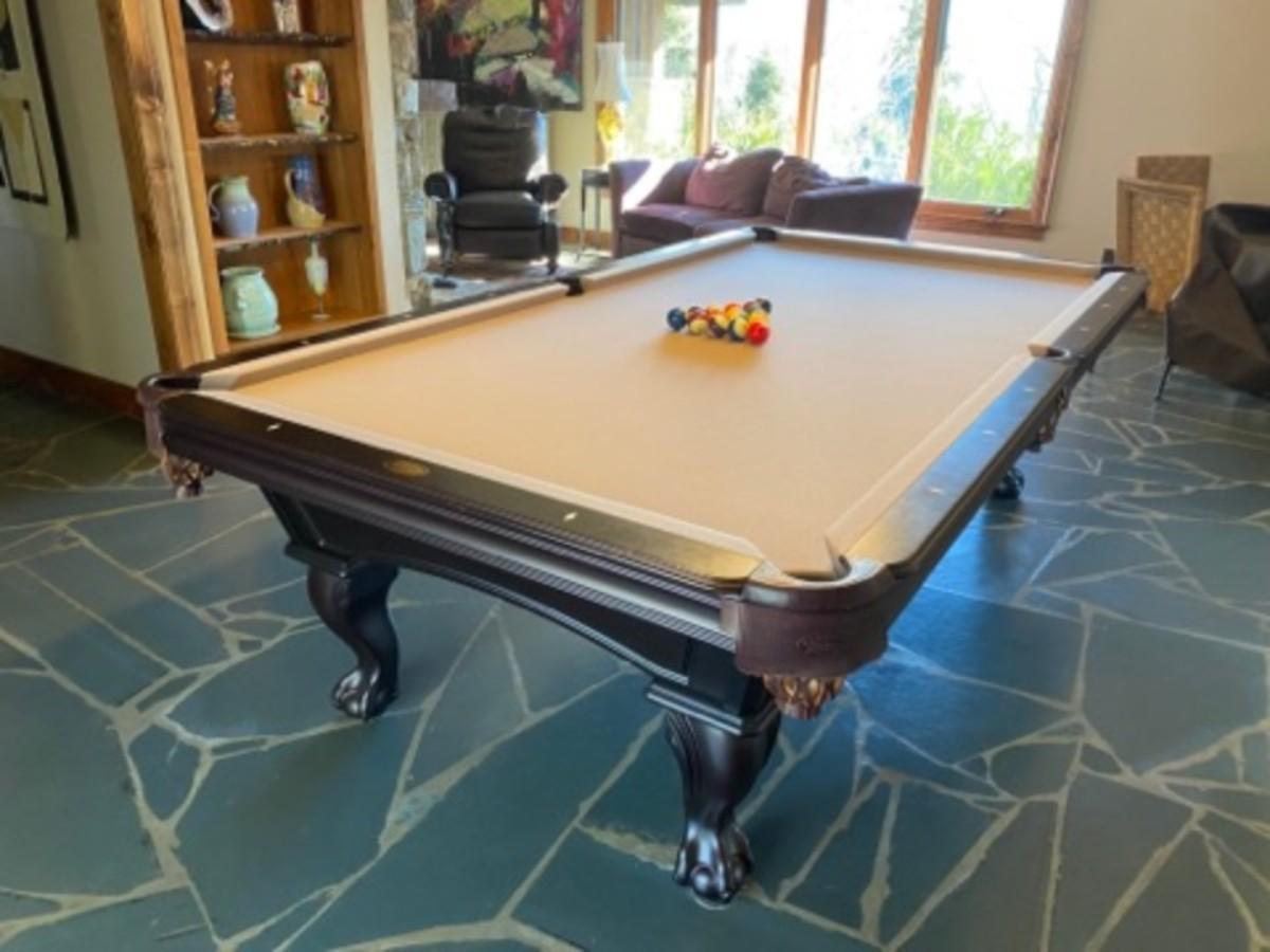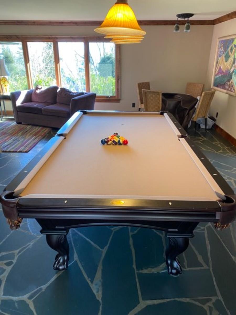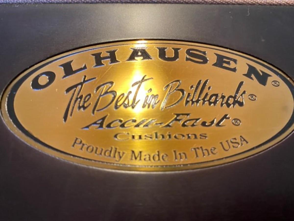 Olhausen Slate Top Billiard Table with Accessories. Balls, ball racks, and cover are included. Approximate Overall Dimensions: 111" x 61 1/2". Approximate Dimensions of Play Area: 102" x 51 1/2".