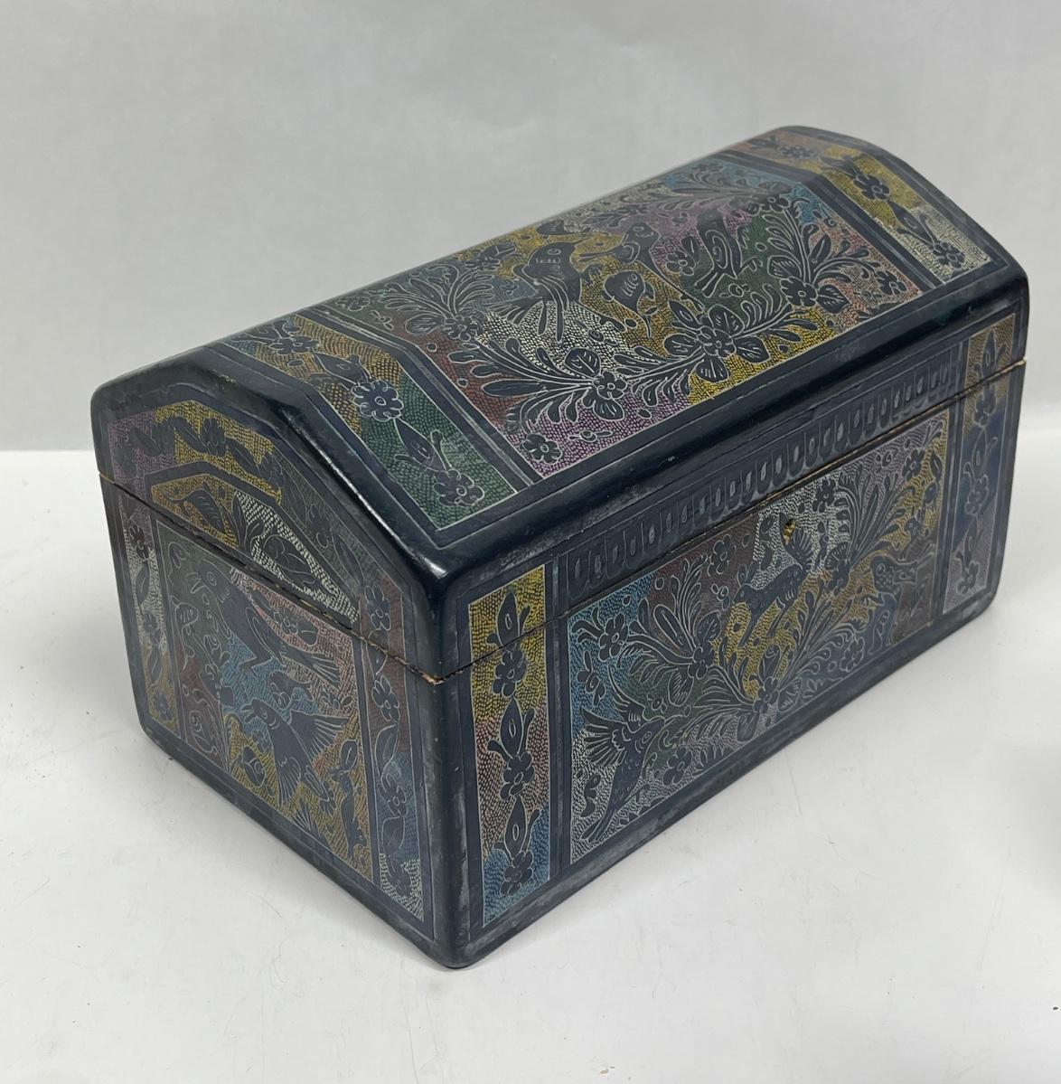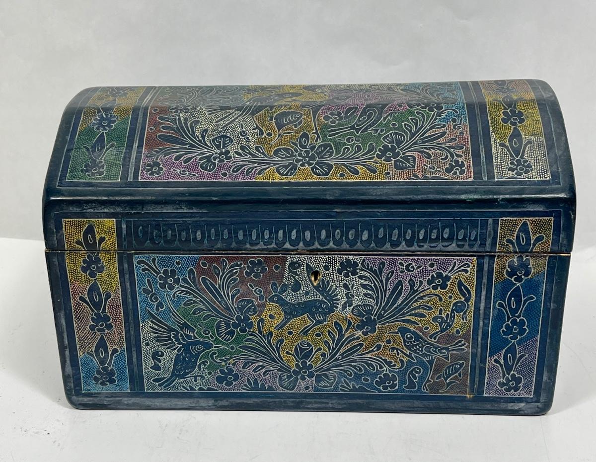 Hand-painted with a traditional stippling technique (dots of various colors, such as red, purple, blue, yellow green and white). Box and hinges are in good condition, box is very clean and unpainted inside. Approx. 10" long, 6" high and 5.75" deep.