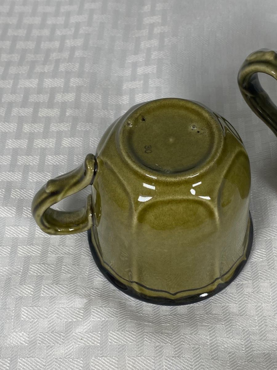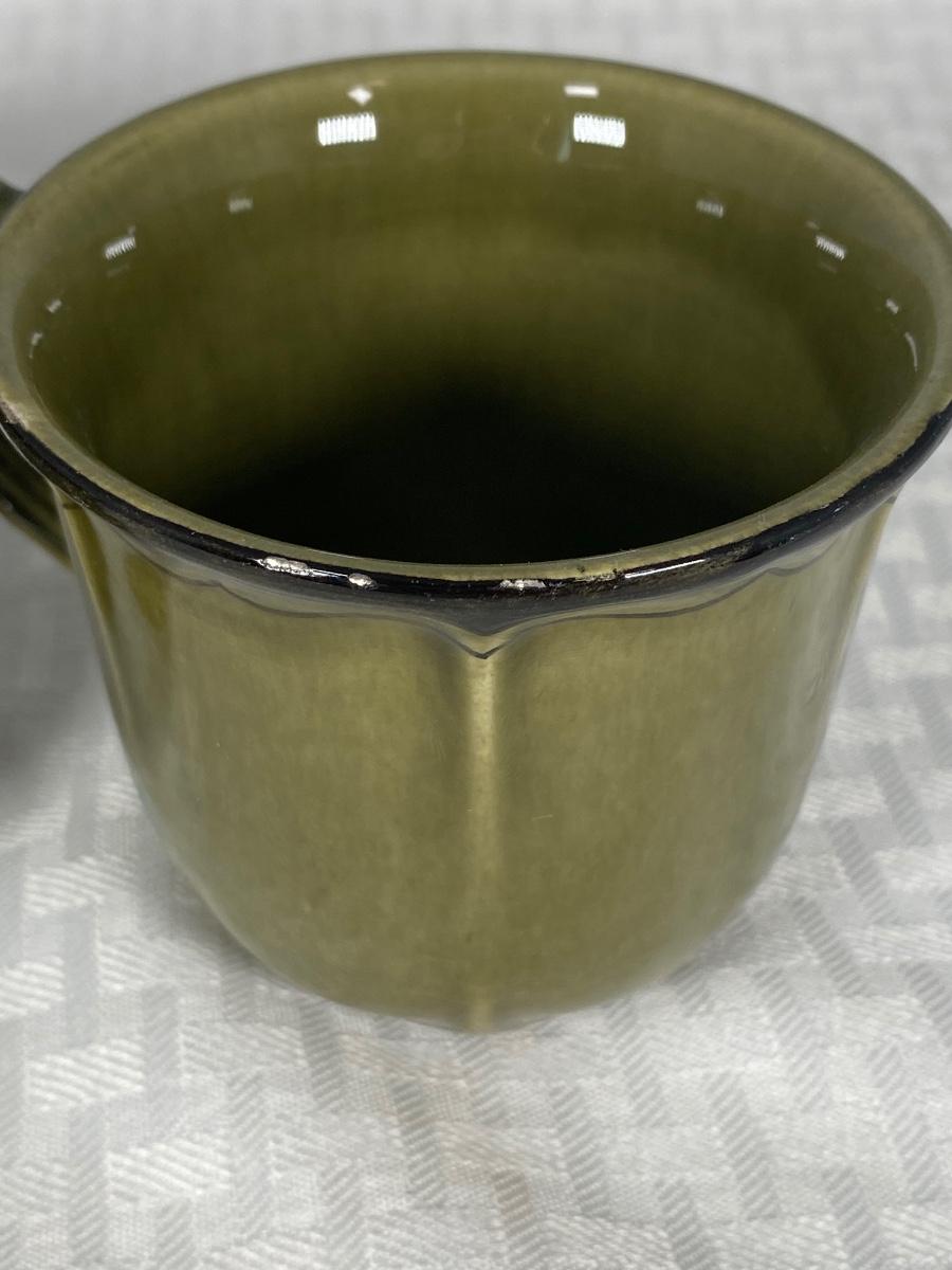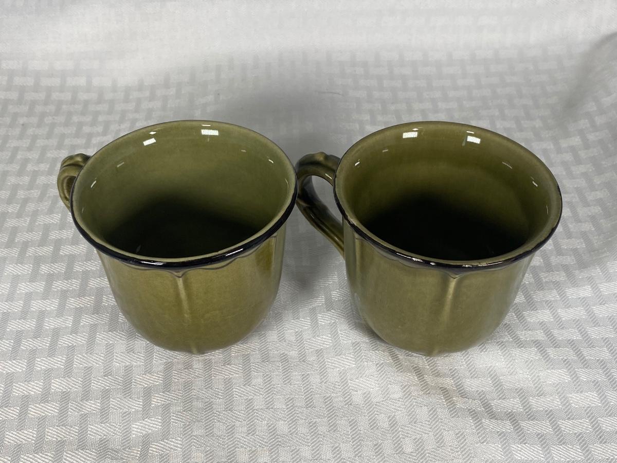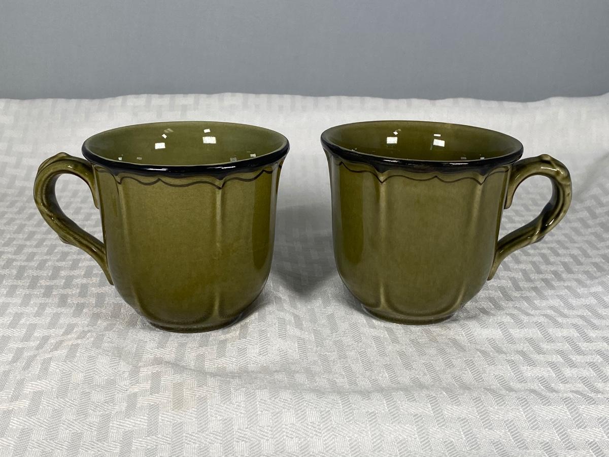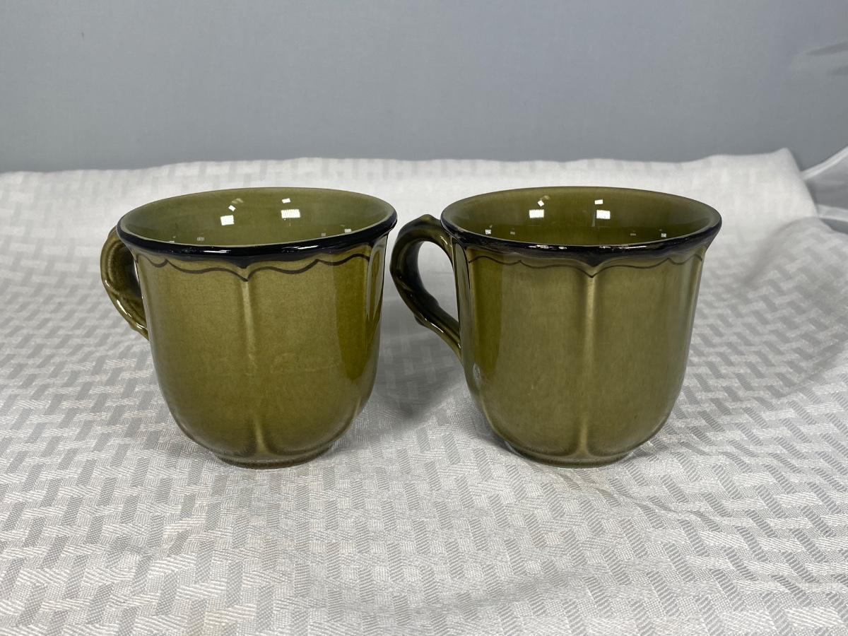 Olive Green and Black Stoneware Coffee Cup Mugs. In good condition, one cup has very light wear along the edge, not chipped but paint wear it looks like.