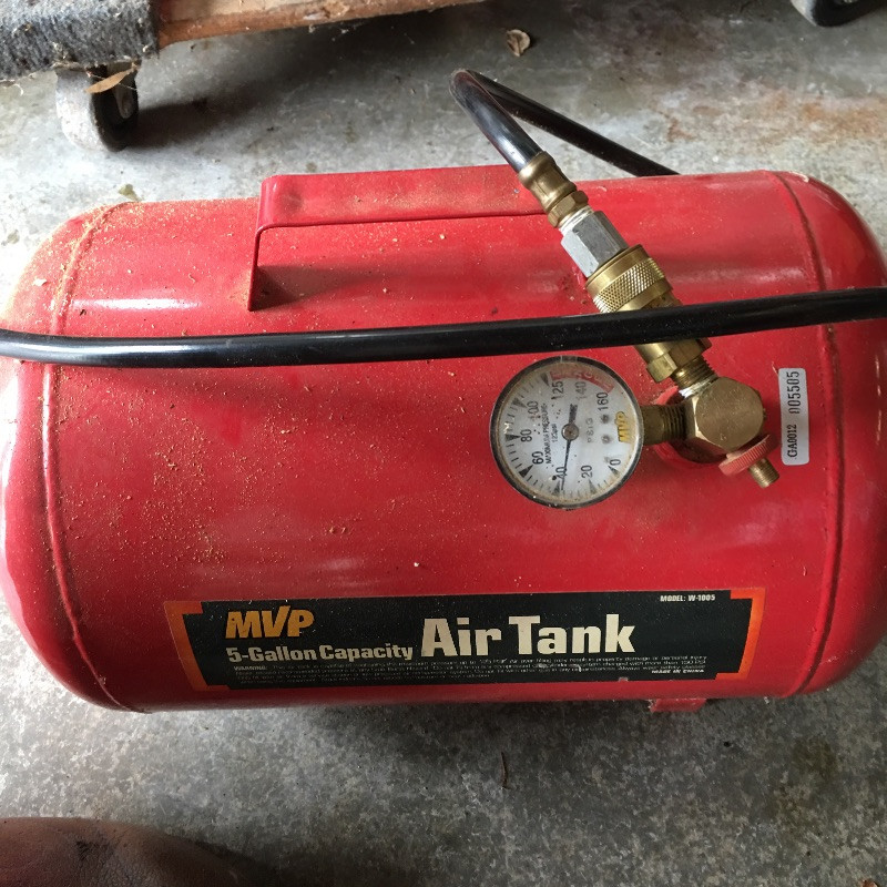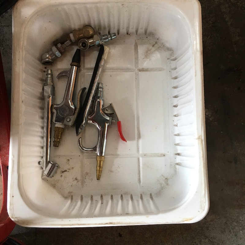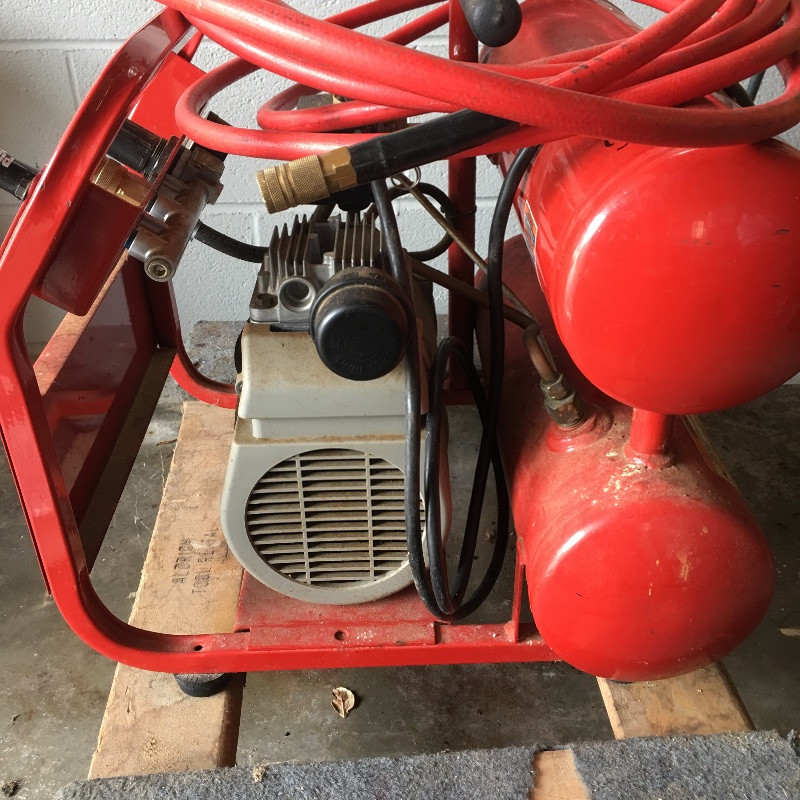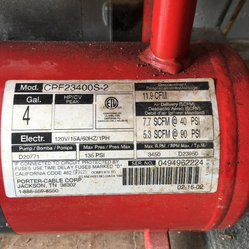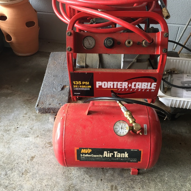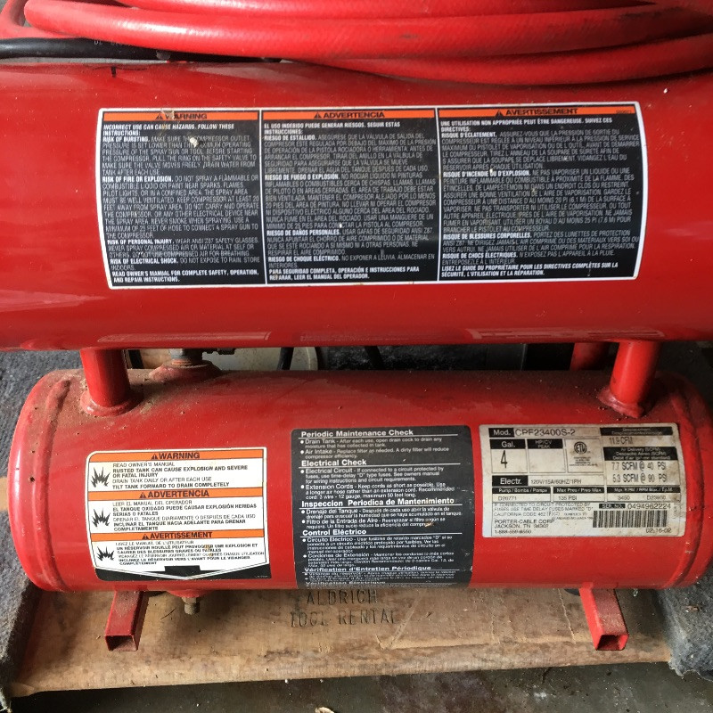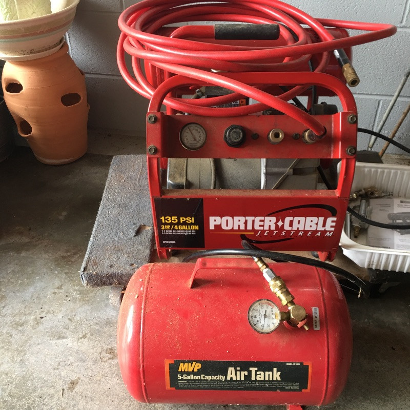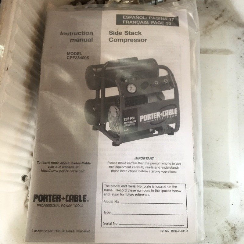 Porter Cable side stack compressor model #CPF23400S and a five gallon air tank and a few chucks and blowers. A great thing to have in your garage. Look at Lot 33 for air hoses and air tools.