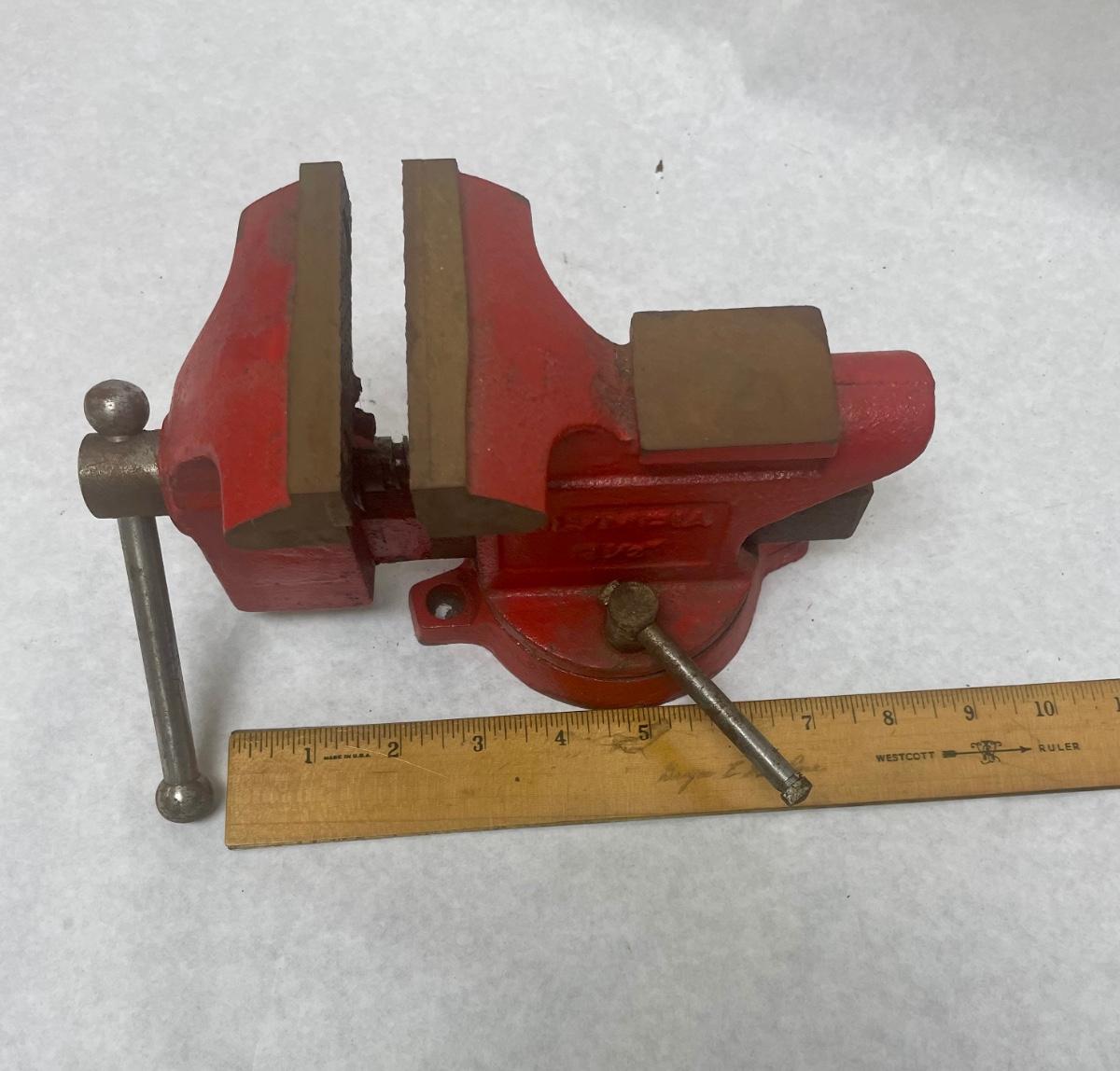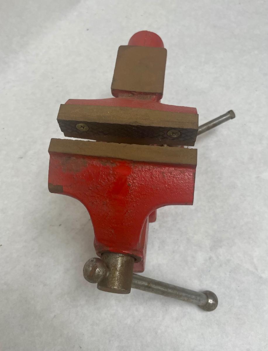 Heavy hardened steel vice. 3 1/2" jaws, swivel base. Slight surface rust but otherwise in very good condition.