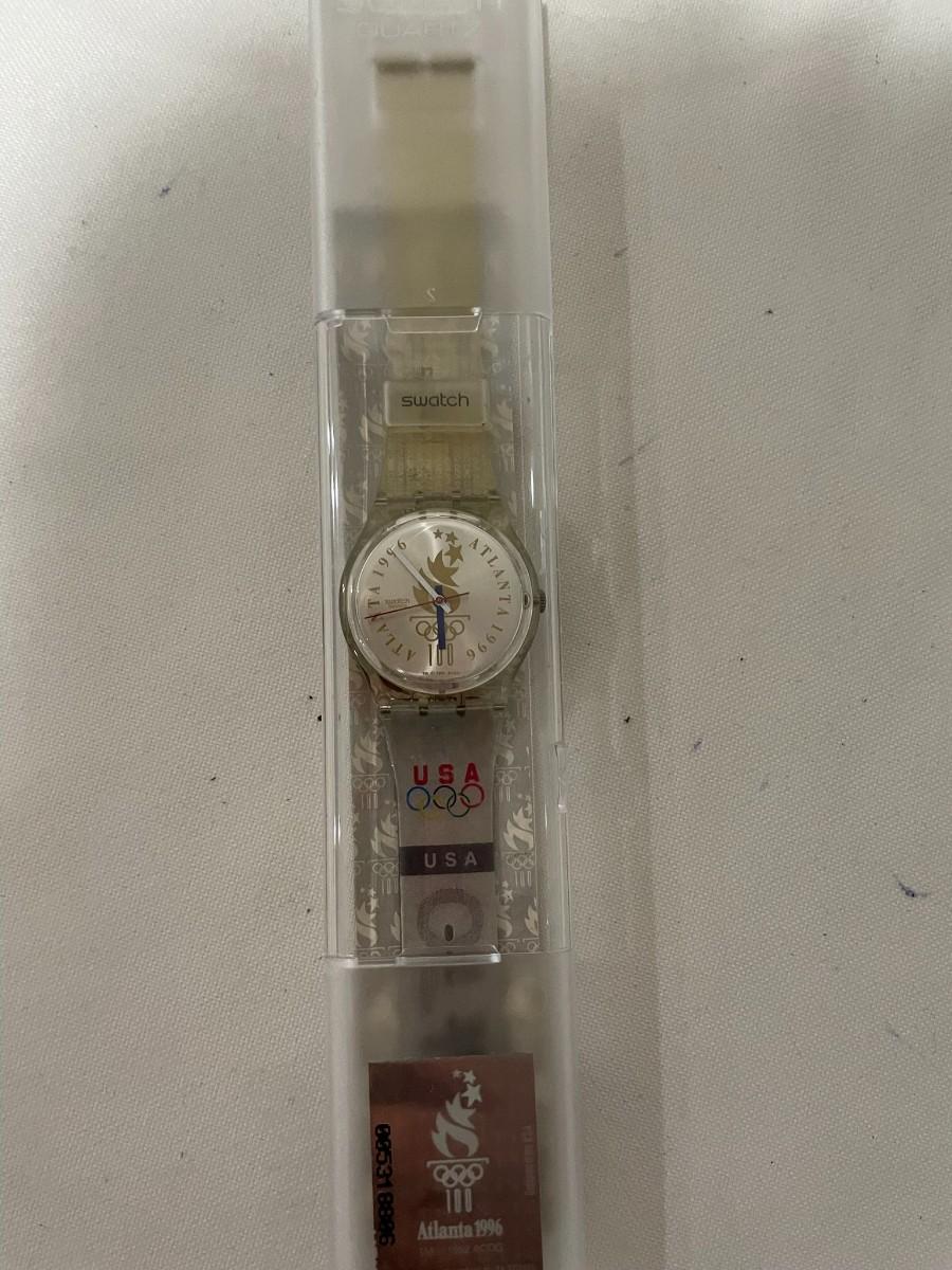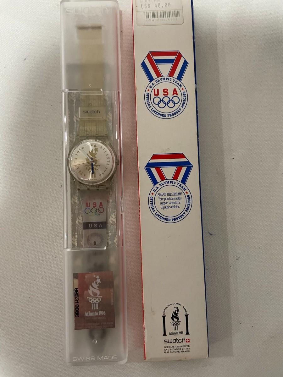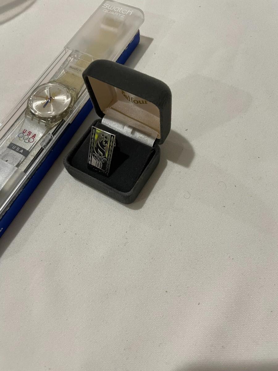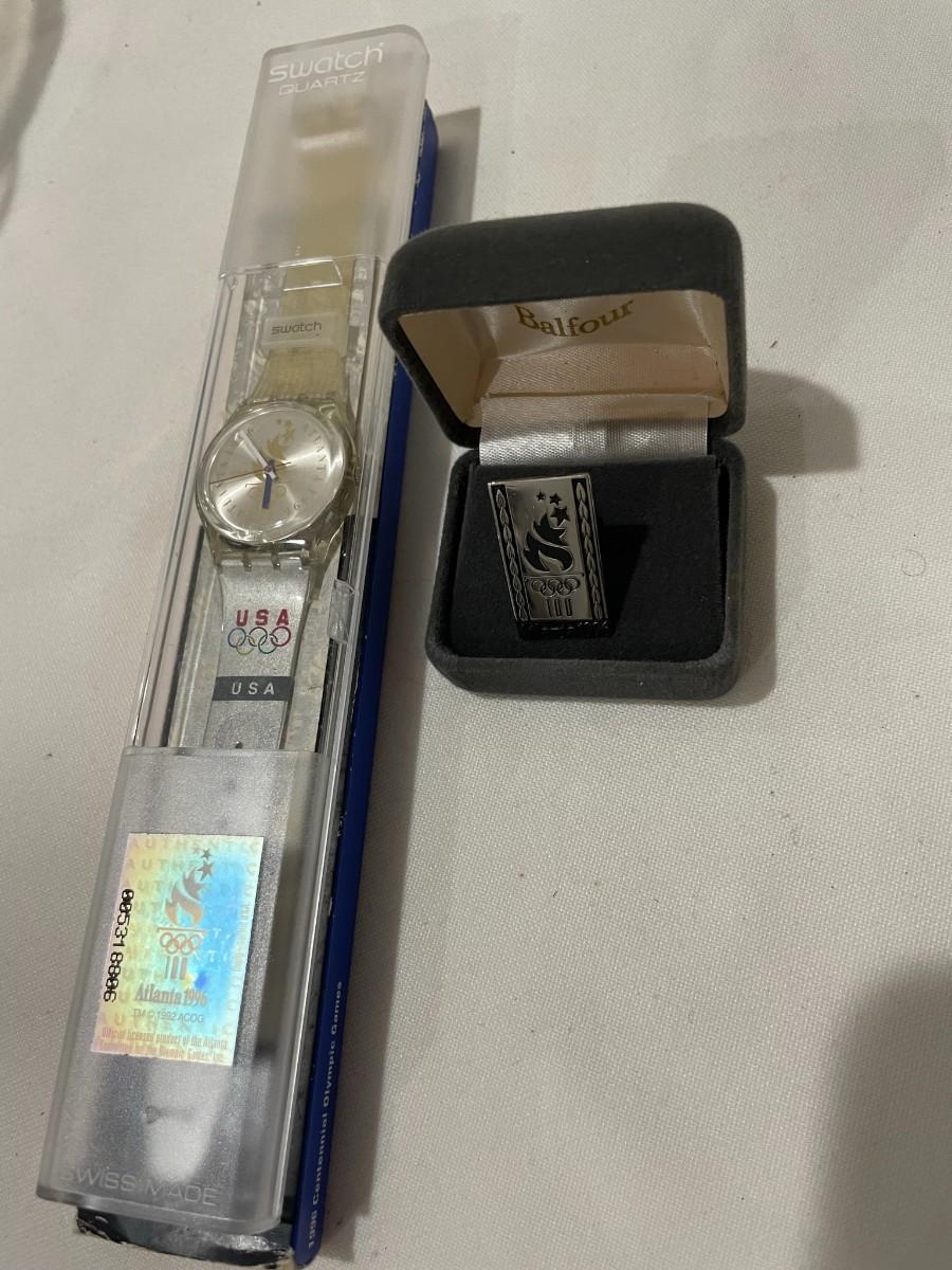 1996 Olympic Swatch Watch - unable to test without batteries, 100 year Balfor Olympic Pin - New in boxes