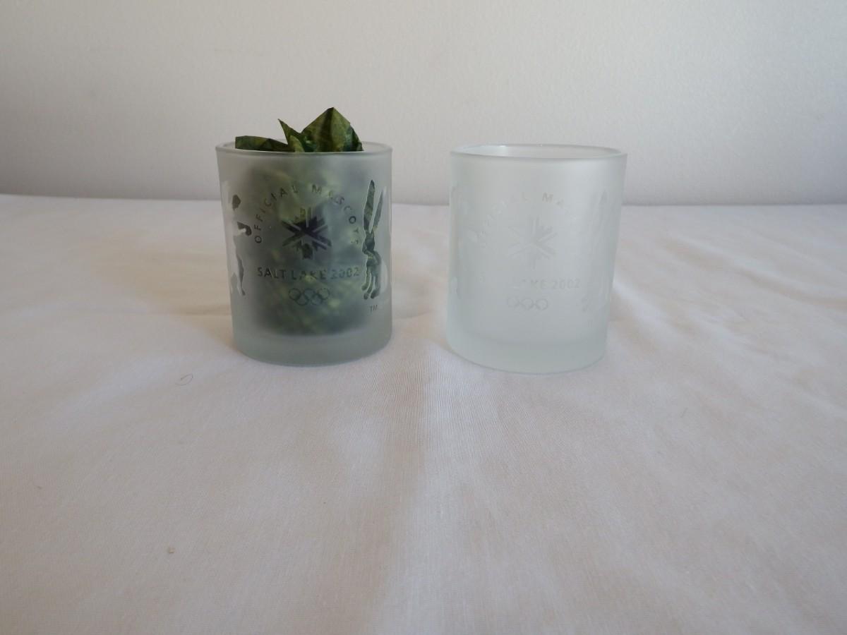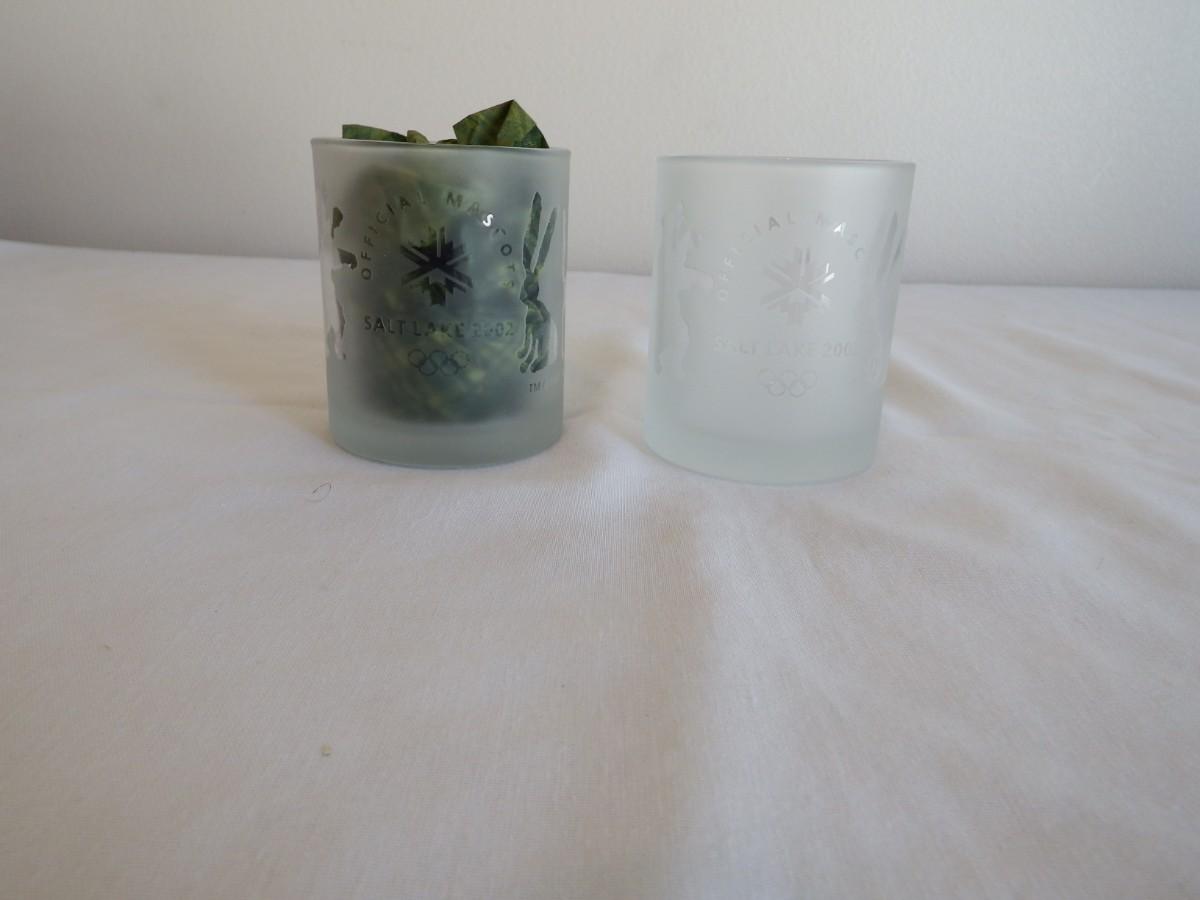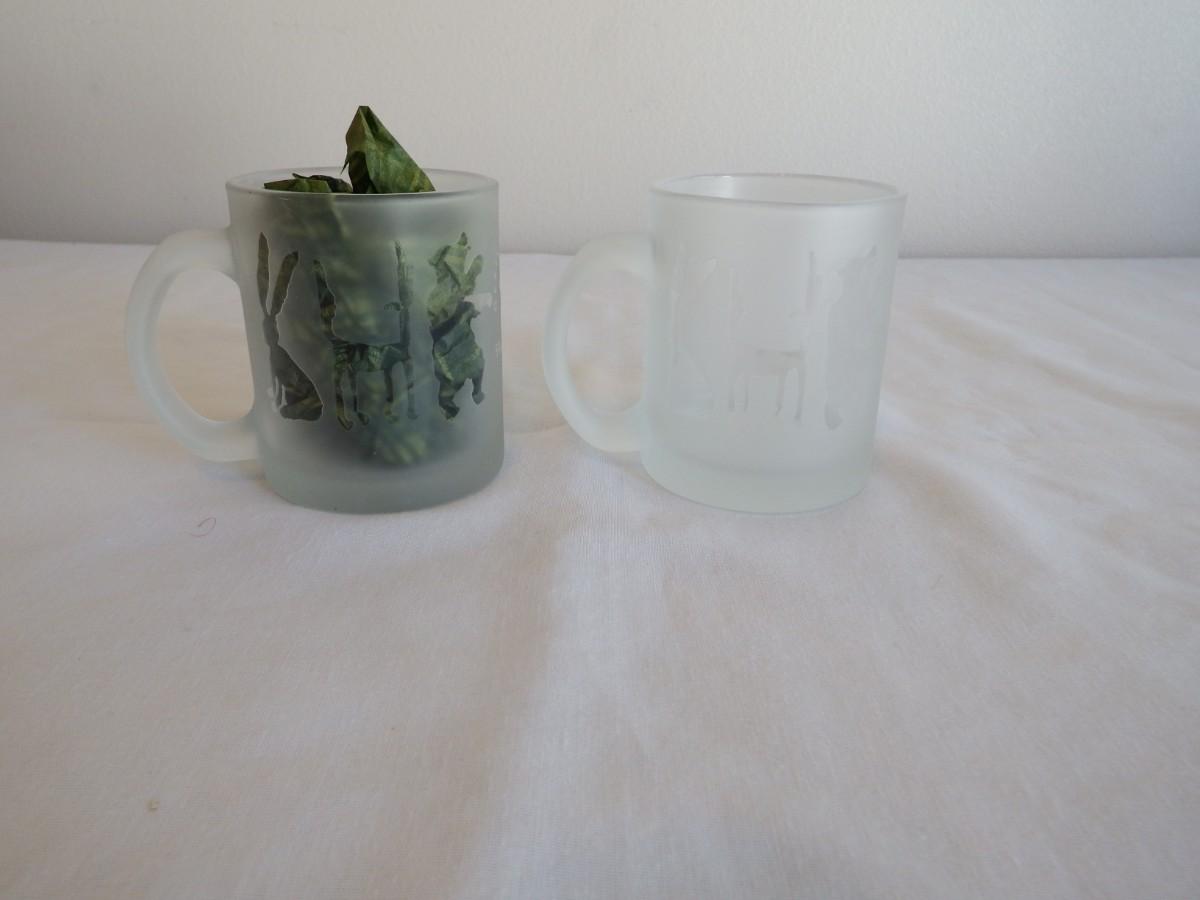 Set of 2, paper in one mug to help design show. The frosted glass designs are cool.