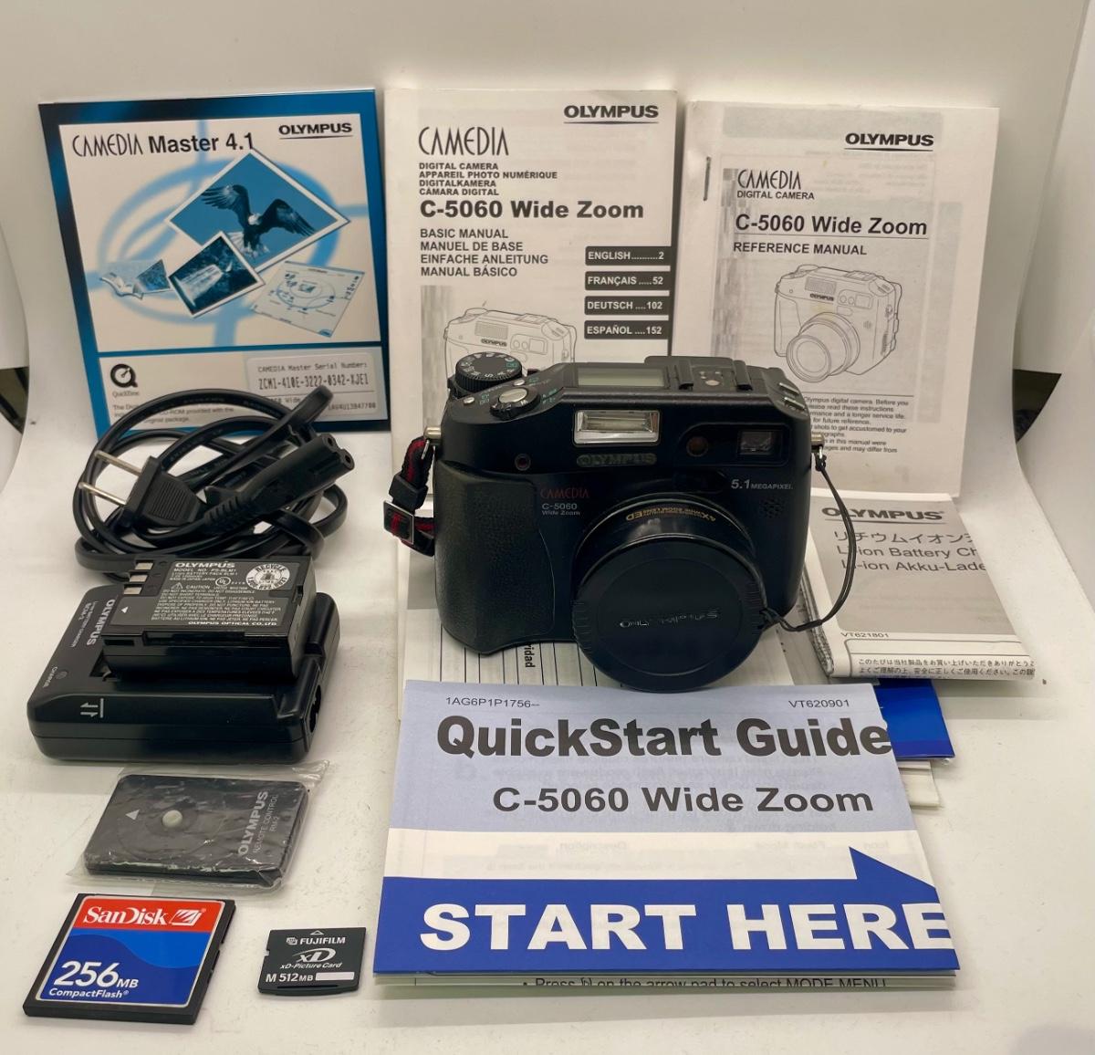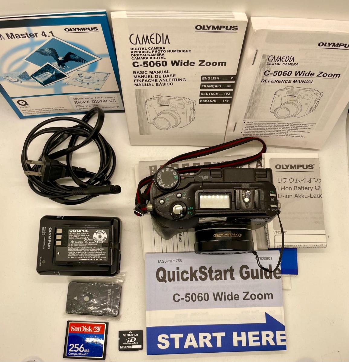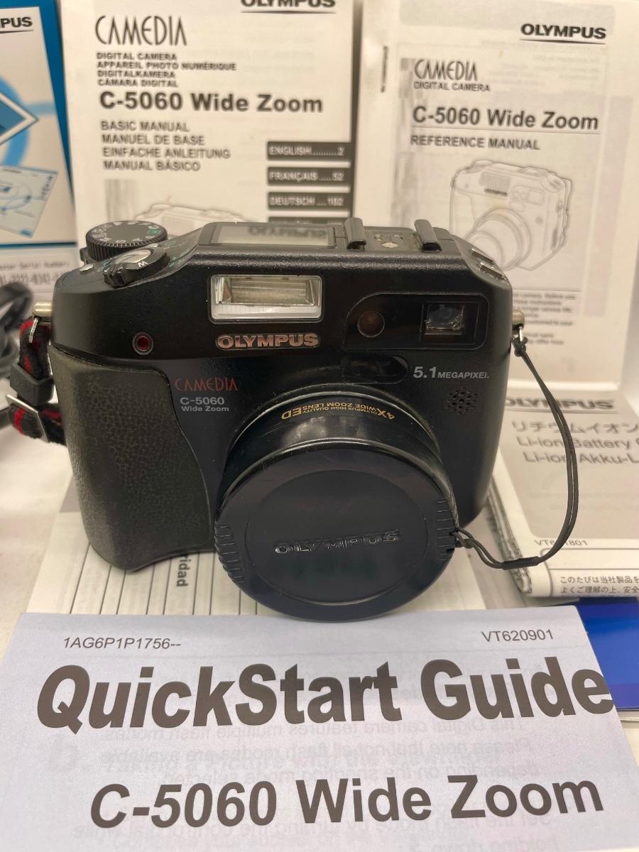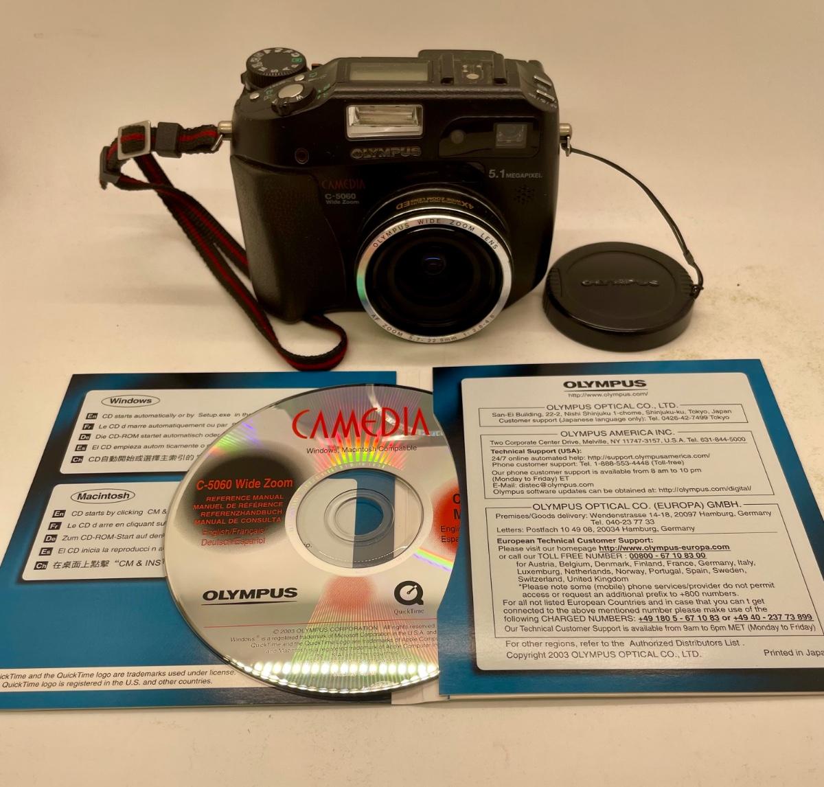 Olympus CAMEDIA C-5060 Wide Zoom 5.1MP Digital Camera with accessories shown: 2 batteries, battery charger, remote control, Cambodia software CD, and all users guides. Tested, works as expected.and