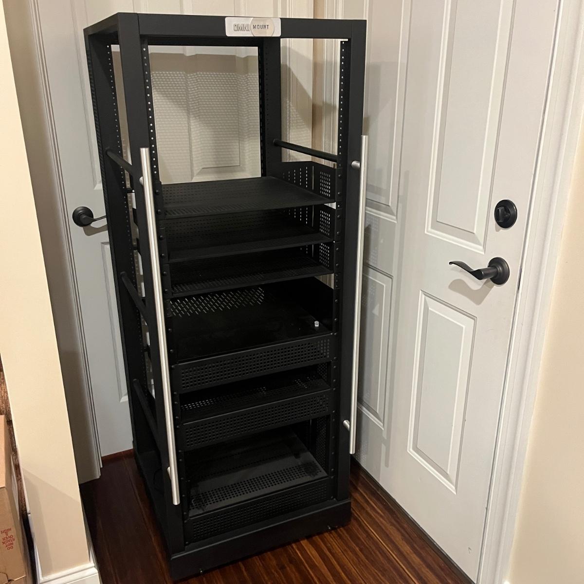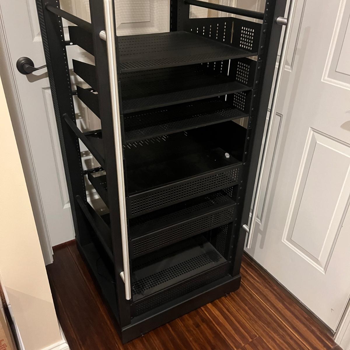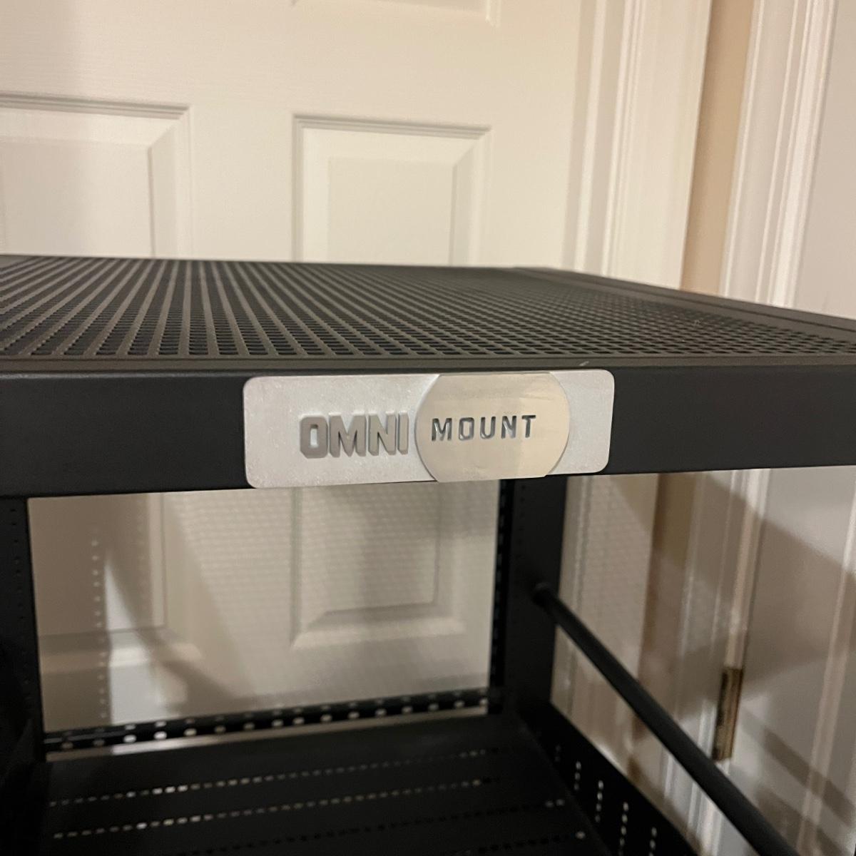 Lot includes a rolling metal Omni Mount A/V Stereo/Server Rack. Rack measures 22” x 25” x 58”H. A scuff mark shown in photo.