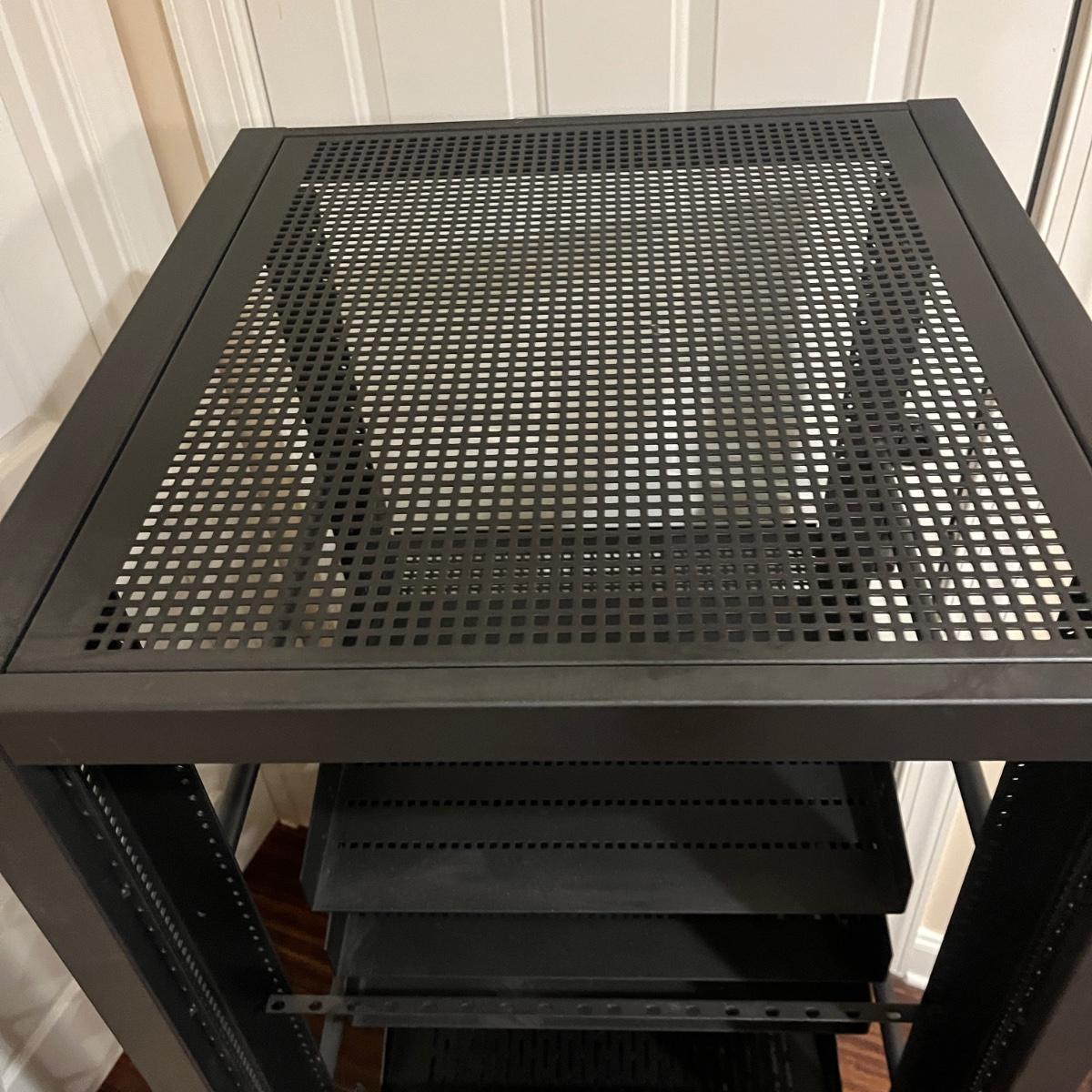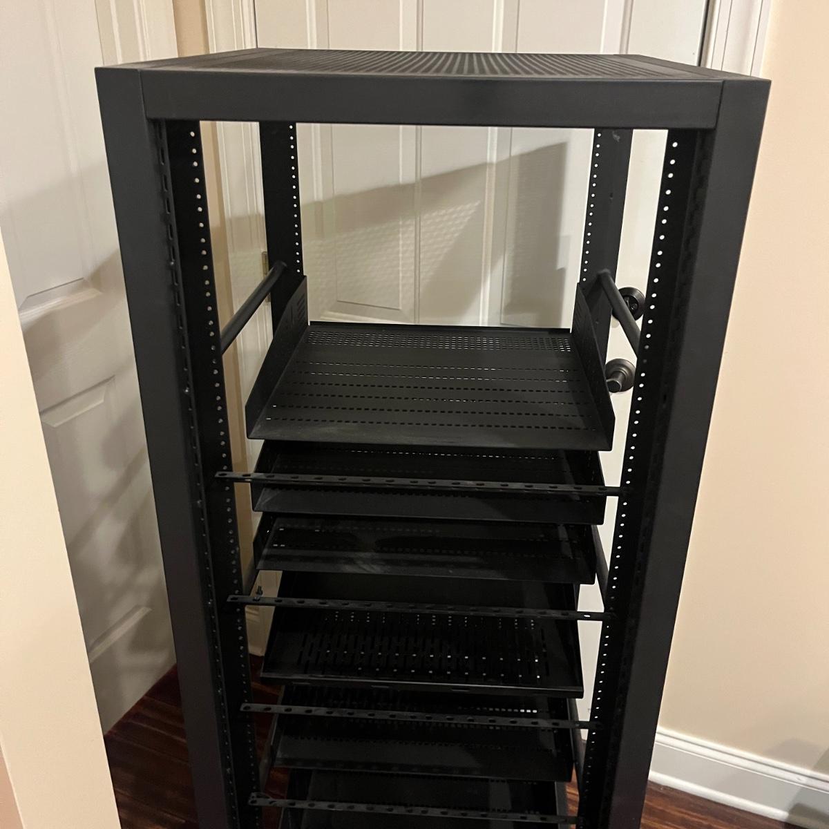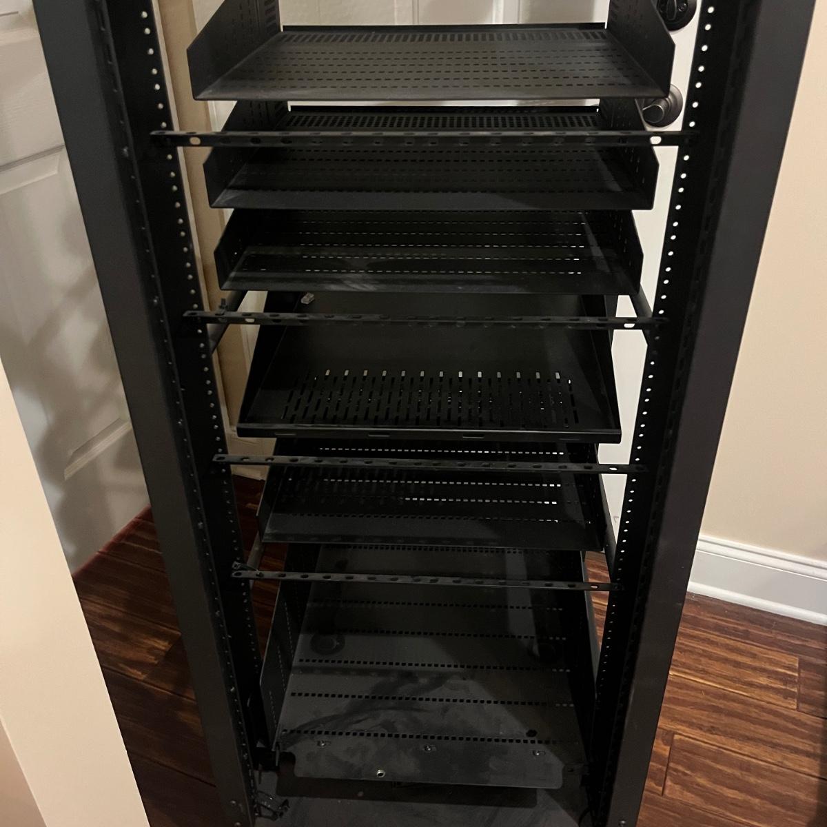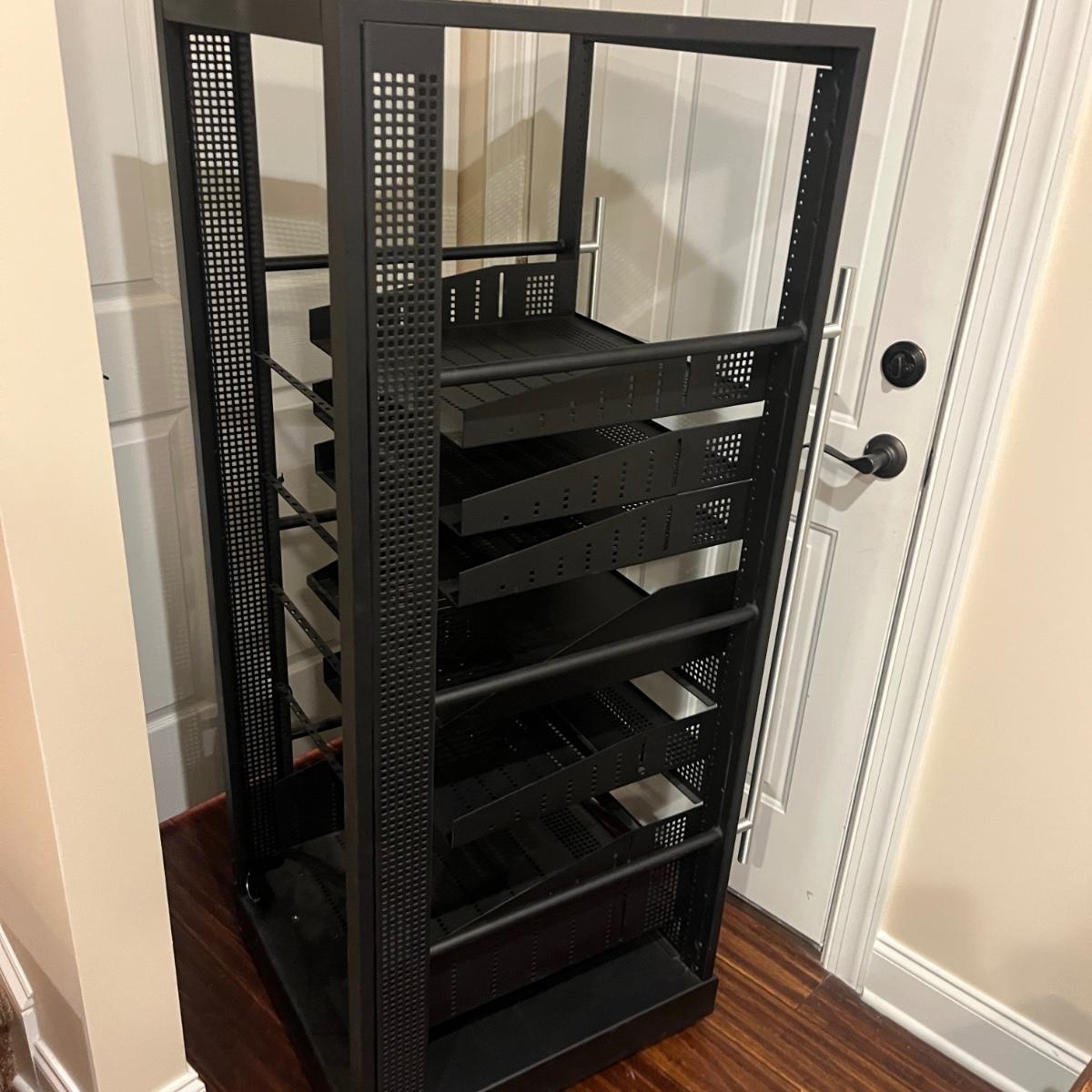 Lot includes a rolling metal Omni Mount A/V Stereo/Server Rack. Rack measures 22” x 25” x 58”H. A scuff mark shown in photo.