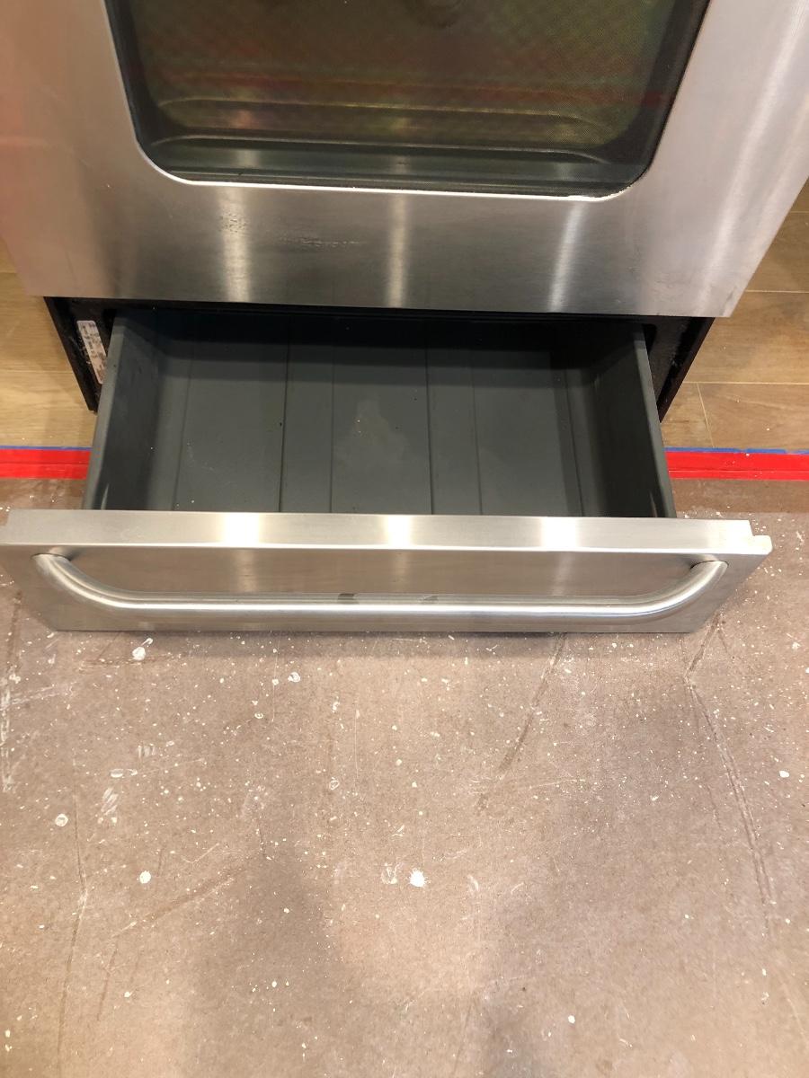 4 cooking spots. Stainless steel with black trim. Digital readout on control panel, self-cleaning, has bottom drawer for storing pans and baking sheets. Counter height, 30” wide. Works, previous owner remodeled and upgraded. Pickup in La Habra by appt only.