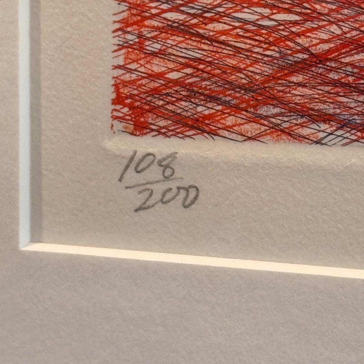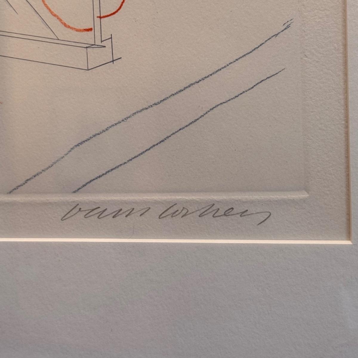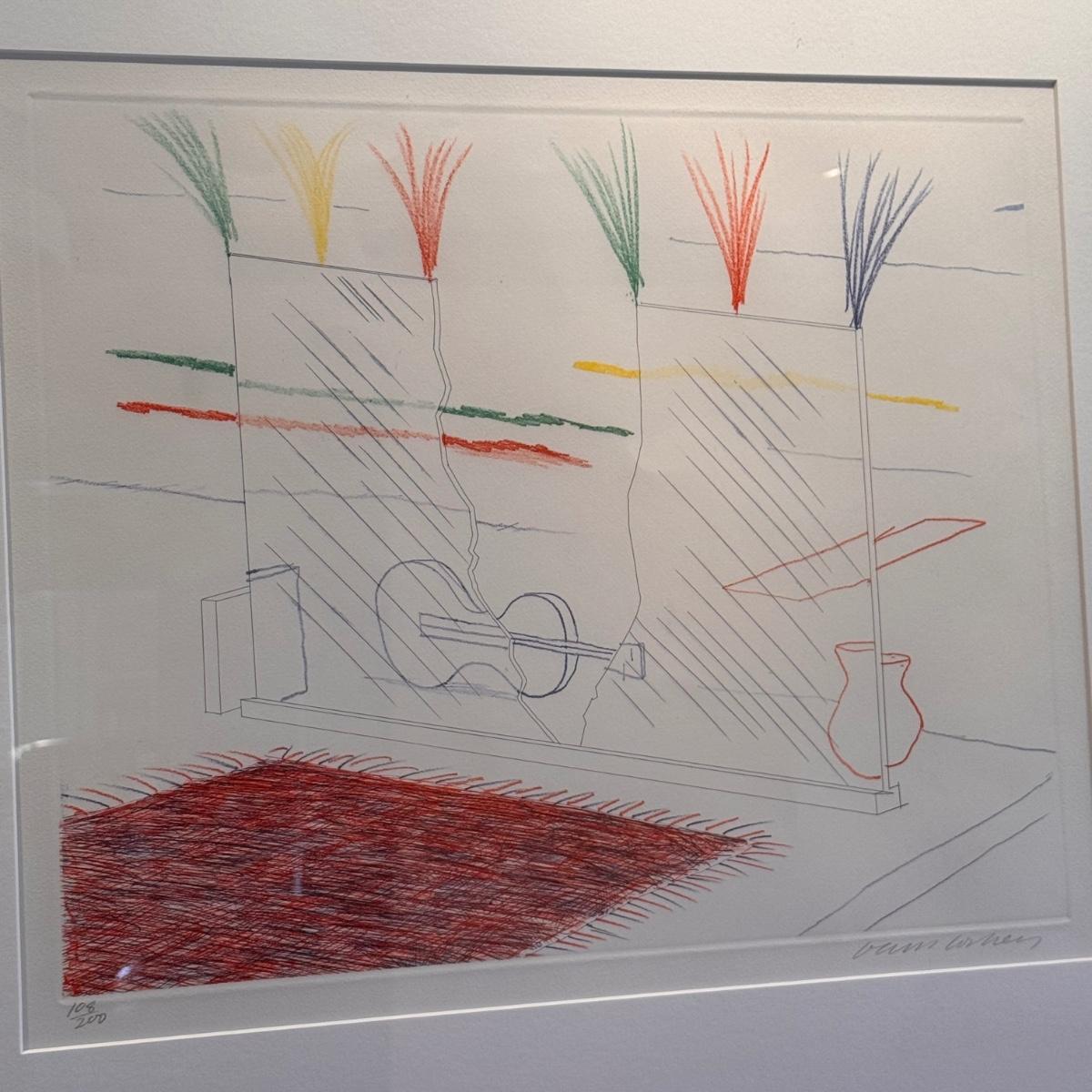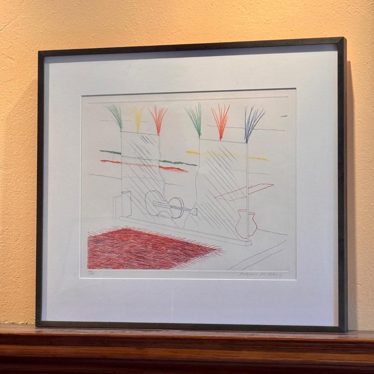 This lot includes one lithograph titled “On it May Stay His Eye” by David Hockney. It is signed by David Hockney in pencil and numbered 108/200. The art is protected in white matting with glass. It is framed in a black wooden frame. It measures 25.5” x 23”H. Shipping available. Shipping can be costly. We suggest contacting our preferred local shipping provider, Postage Express, with dimensions and getting an estimate before bidding: (828) 255-9250 or shipping@postageexpressnc.com.