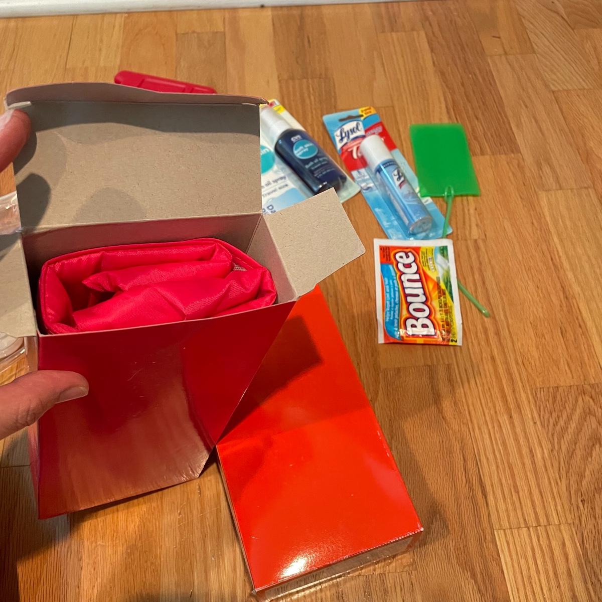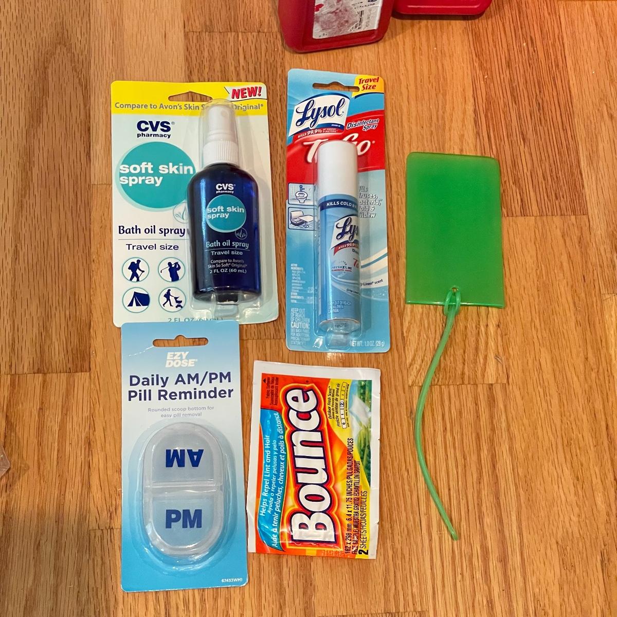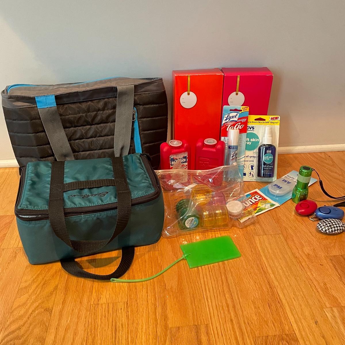 Items for lunch and travel. An Igloo and an Eddie Bauer insulated lunch bags with two small Rubbermaid ice packs plus two gift ready insulated market bags. Travel size Lysol, Bounce, and CVS Soft Skin Spray. Lot also includes a pill reminder and a small bag with labels and .5 - 1oz containers. The Igloo lunch box is approximately 14” x 10”. Local pick up only.
