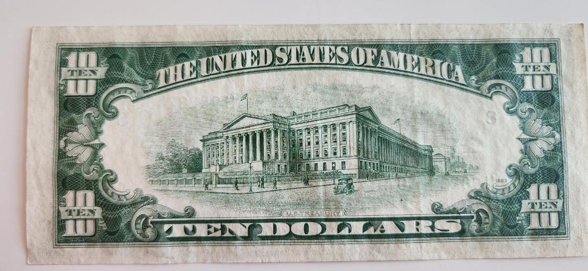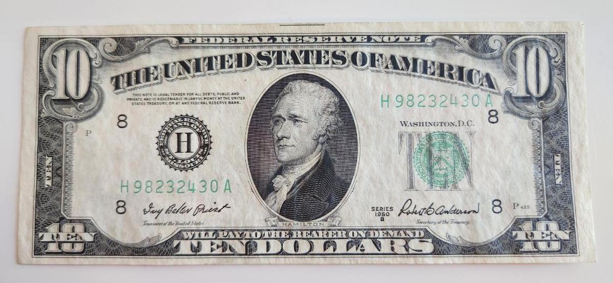 This lot is for One $10 Federal Reserve Note - Lot C. This note is dated 1950B and has a green seal. This item is KY sales tax-exempt.