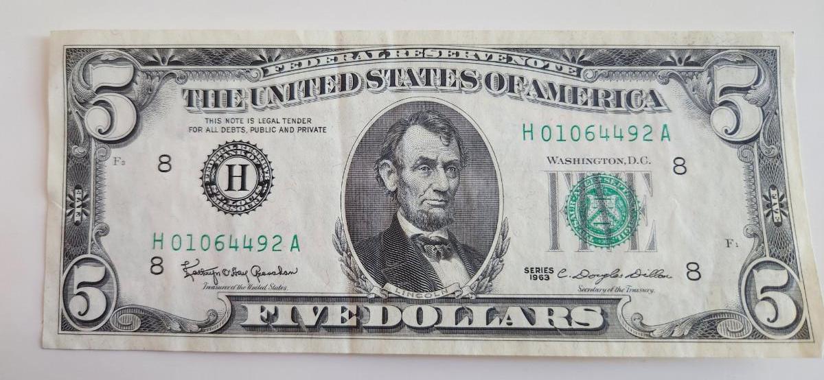 This lot is for One $5 Federal Reserve Note - Lot D. This note is dated 1963 and has a green seal. This item is KY sales tax-exempt.