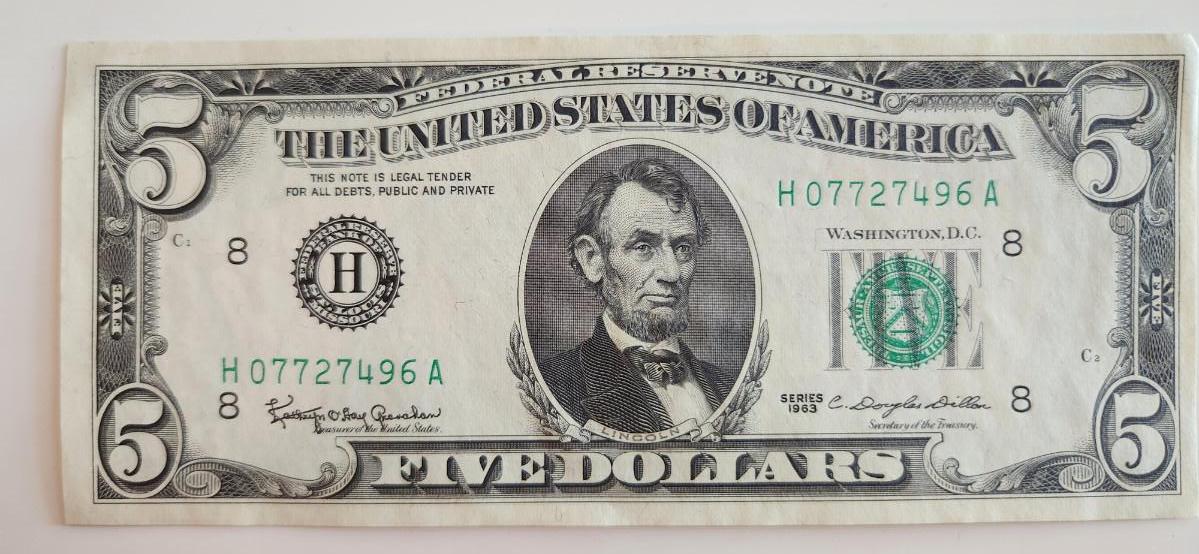 This lot is for One $5 Federal Reserve Note - Lot E. This note is dated 1963 and has a green seal. This item is KY sales tax-exempt.