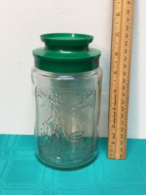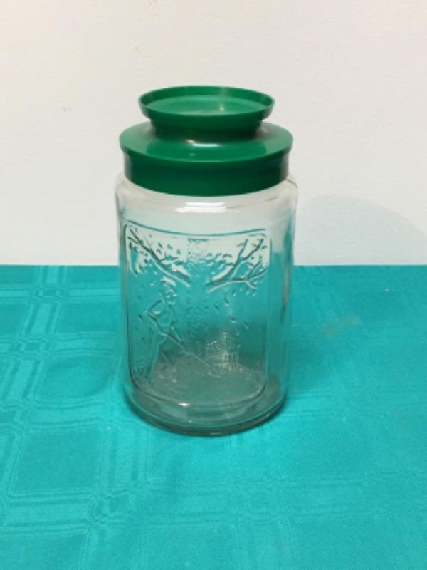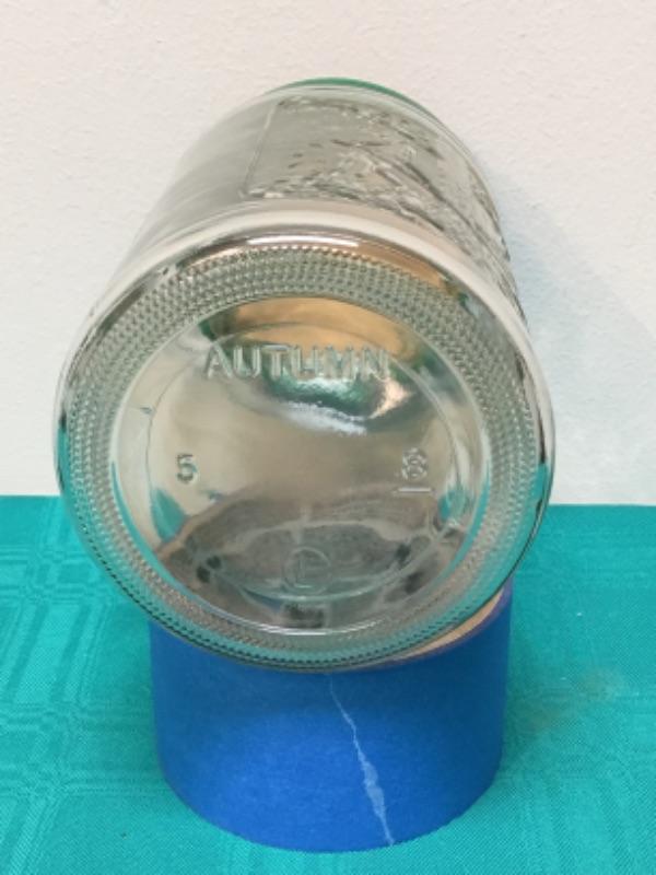 Like new condition. One mason jar with an autumn scenescape of a young girl raking leaves blow a tree. It is marked, “autumn“ on the bottom but is otherwise unbranded. The original green plastic lid is in excellent condition with a waxed paper liner on the underside.
