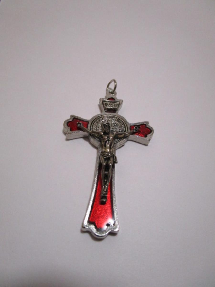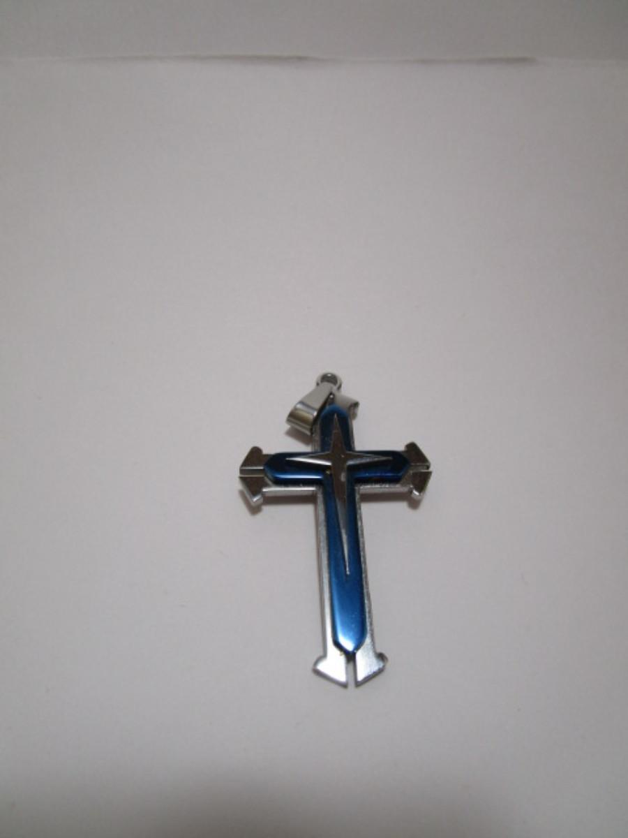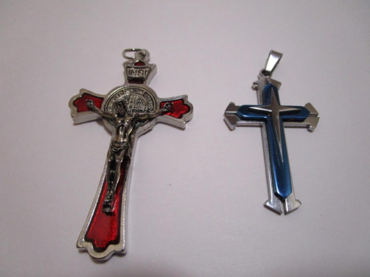 One cross silver & blue (2" x 1-1/4"), one red & silver crucifix (3" x 1-3/4")
