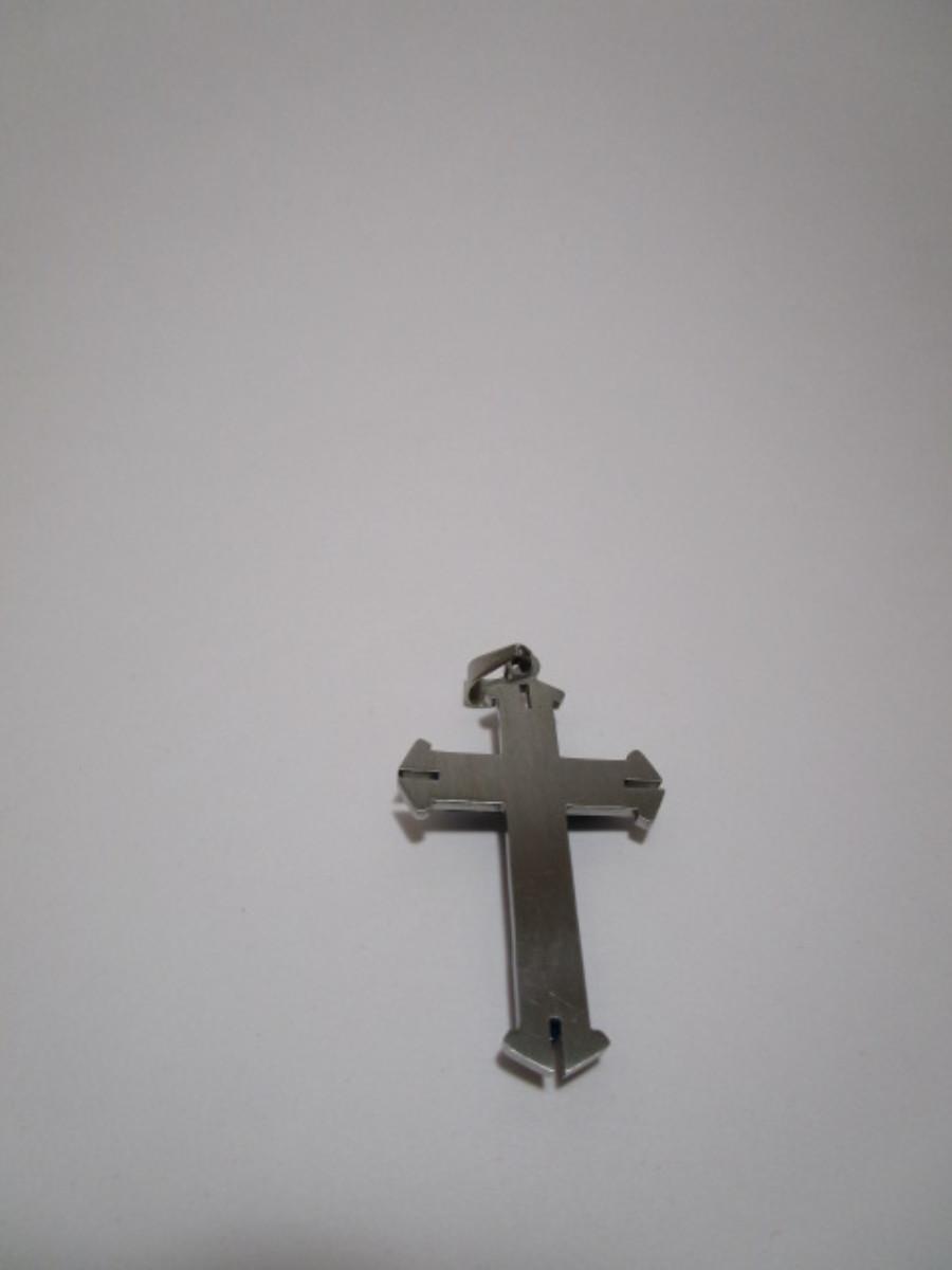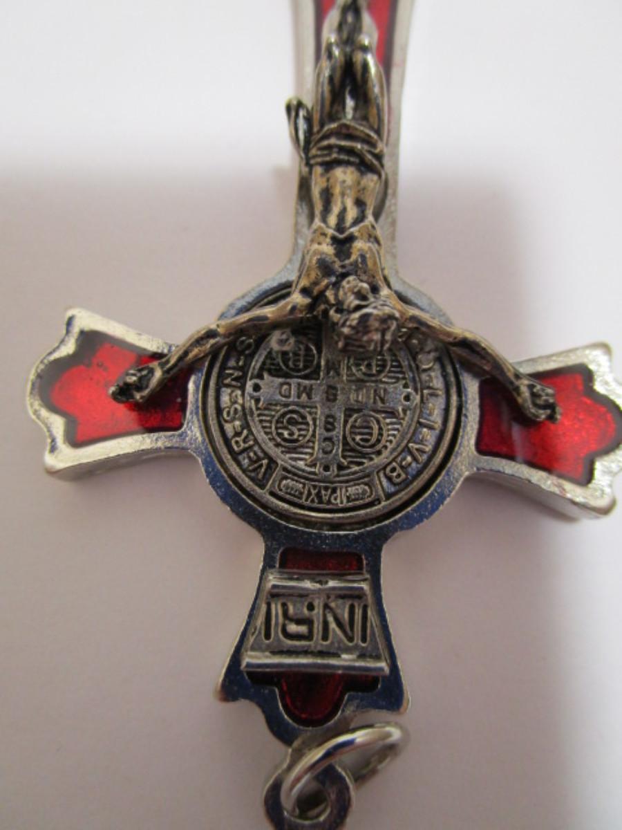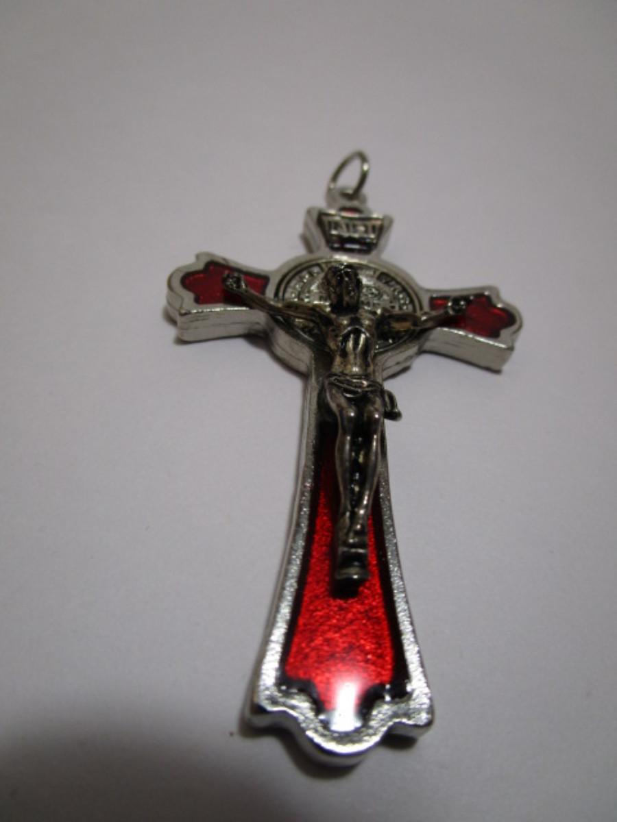 One cross silver & blue (2" x 1-1/4"), one red & silver crucifix (3" x 1-3/4")