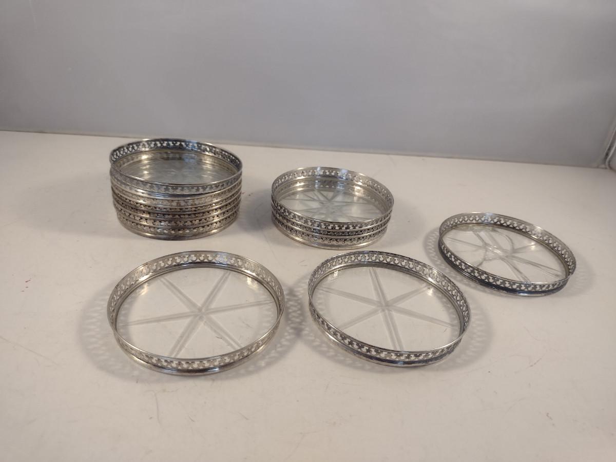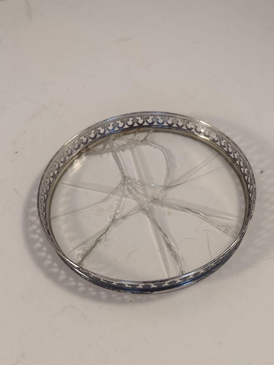 One Dozen Antique Sterling Silver and Glass Beverage Coasters. One has broken glass- please see all pictures.