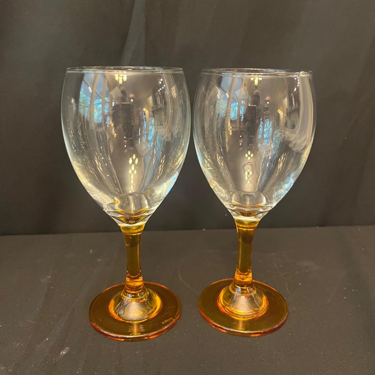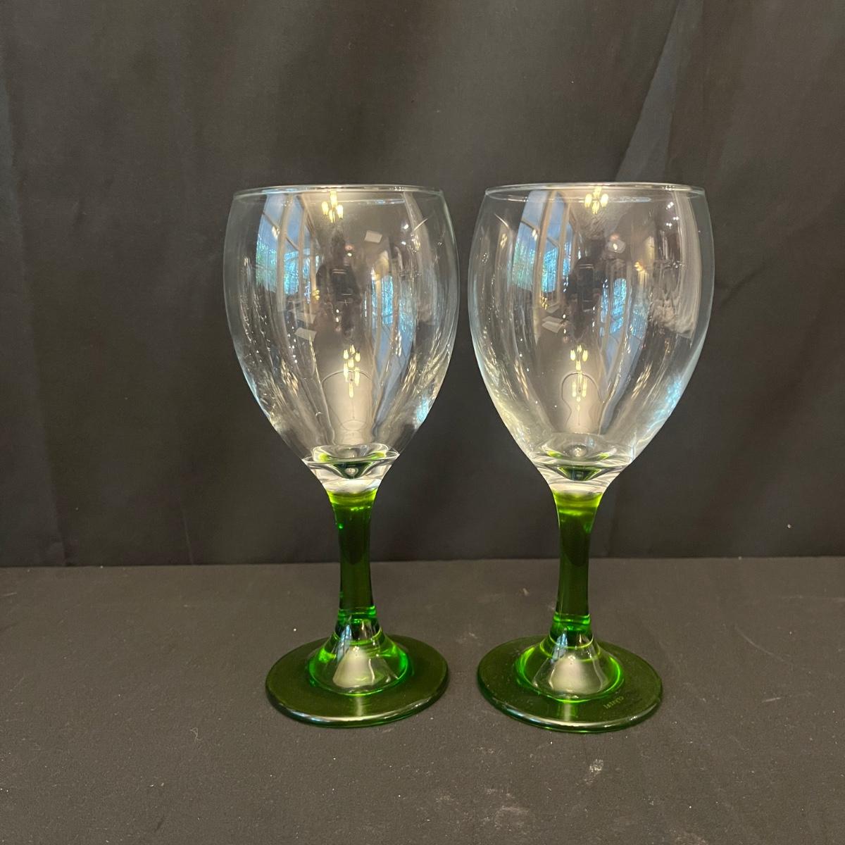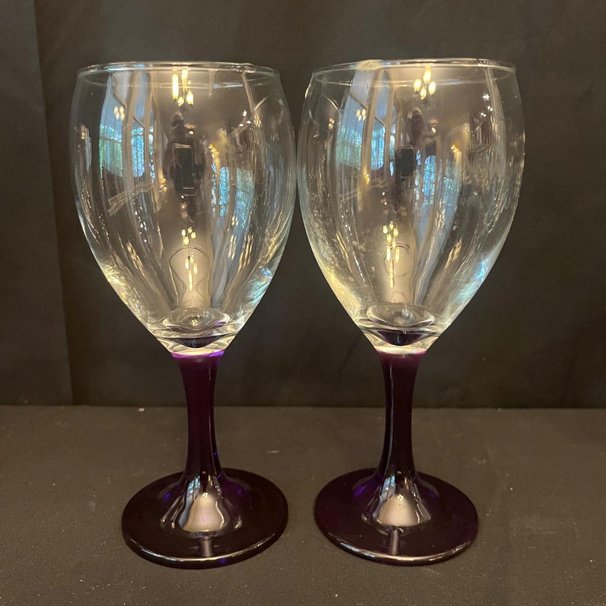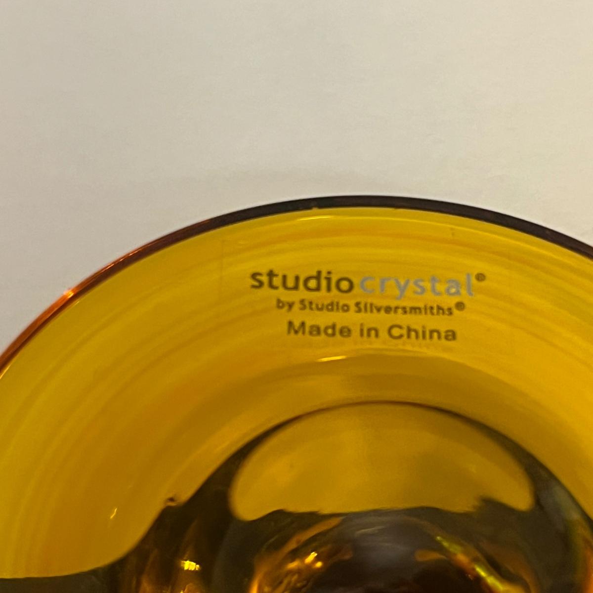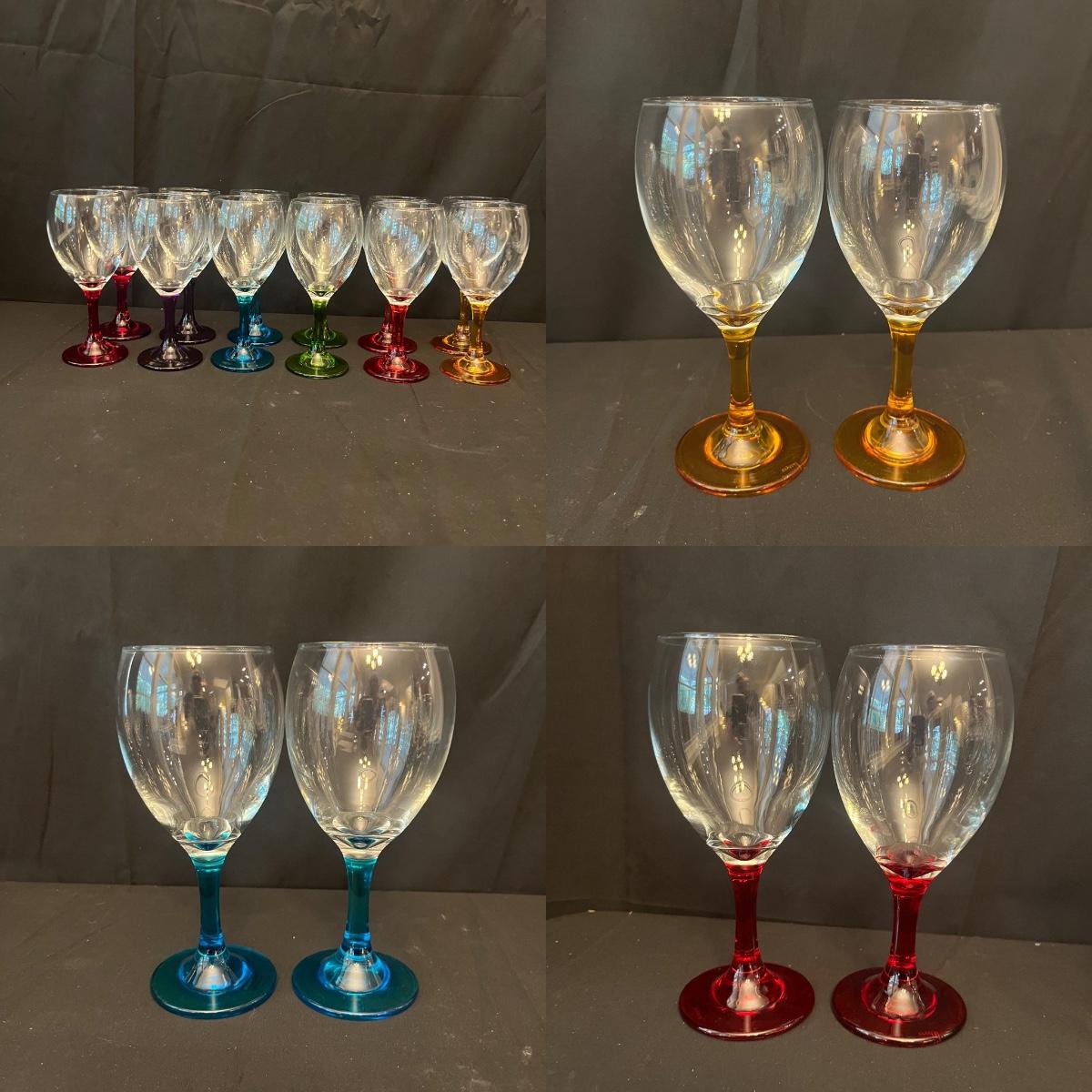 This selection of Studio Crystal colored stem wine glasses includes six matching pairs. Each glass measures 3.25”D x 7.5”H.