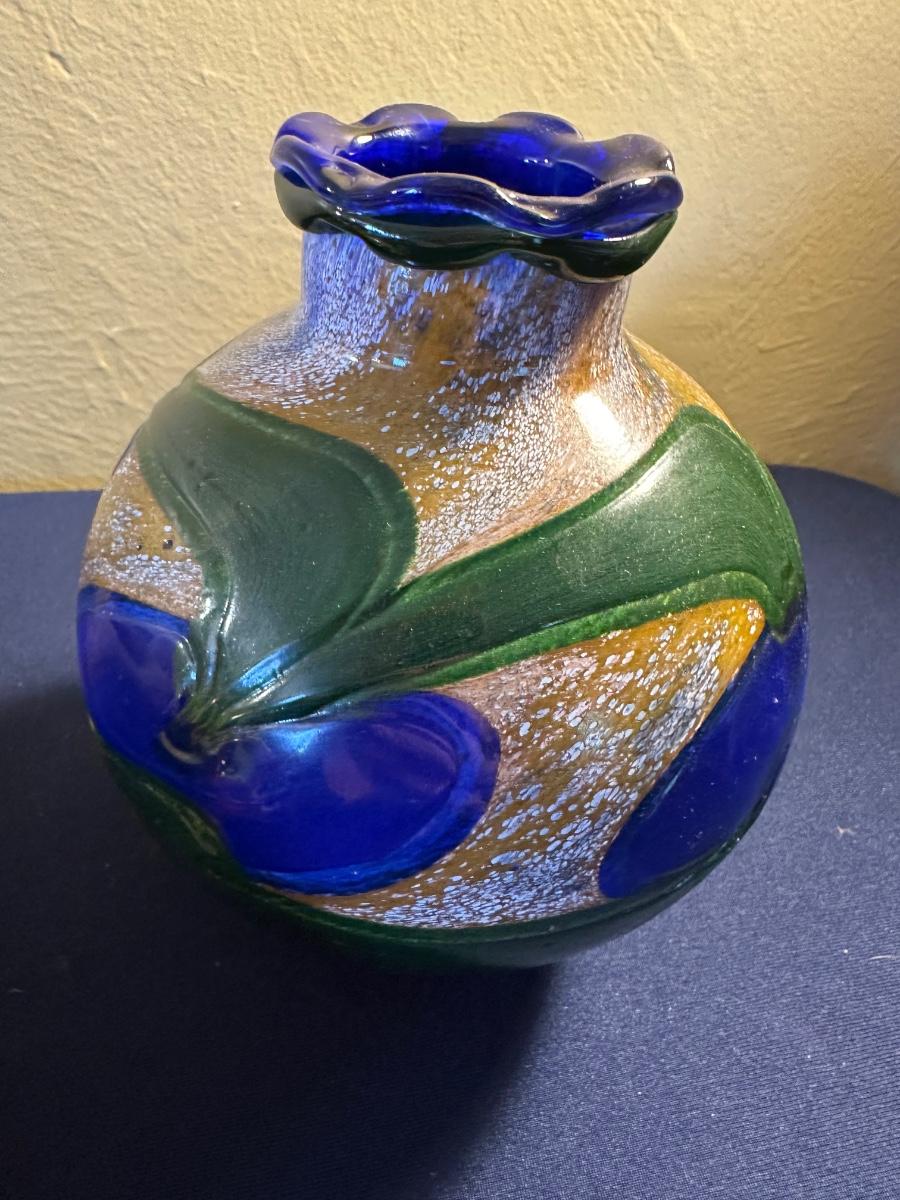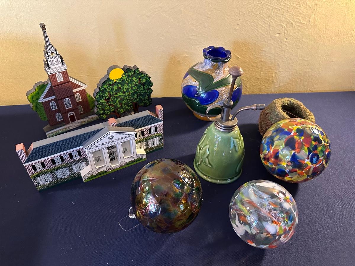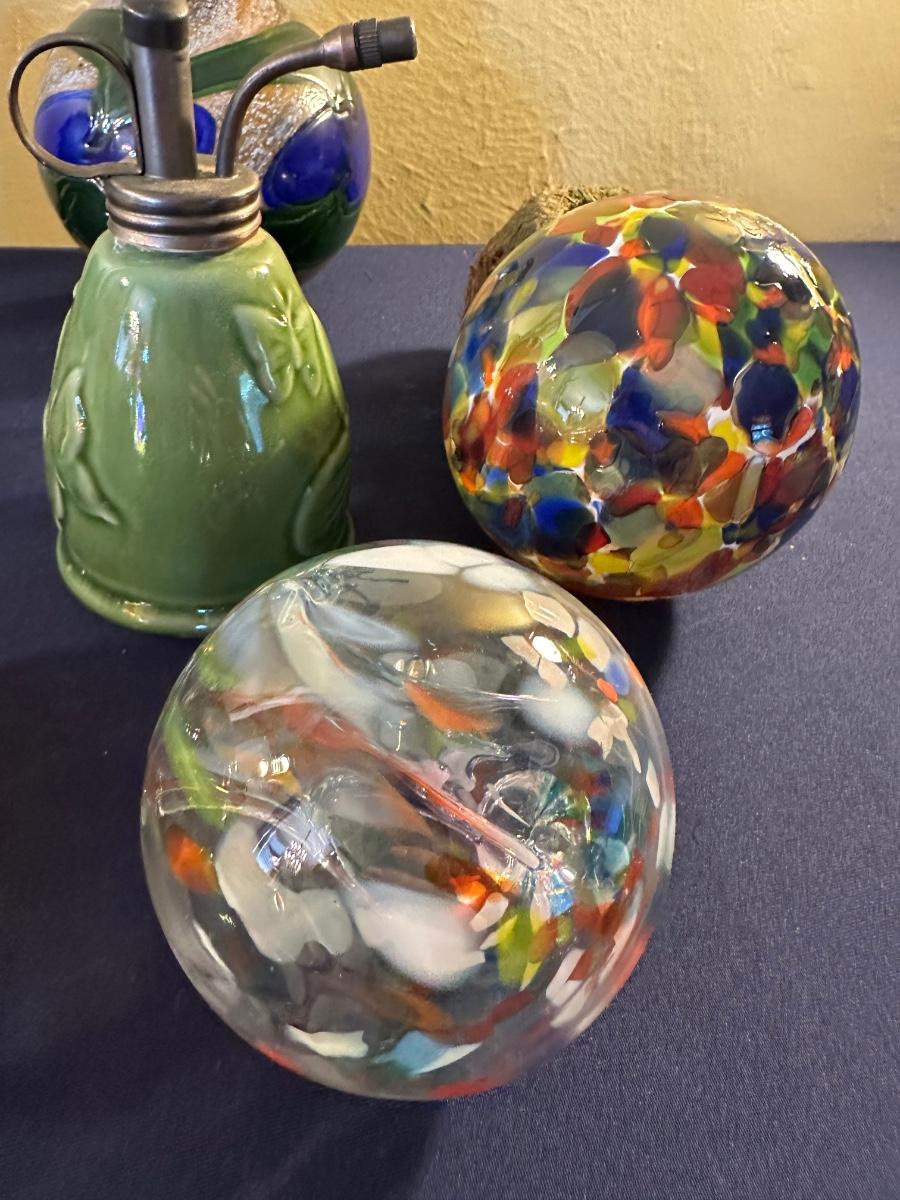 BLOWN GLASS BALL, WATER SPRITZER,ONE EARED COW GLASS COBALT BLUE DECORATED VASE, BIRD NEST, SHEILA HOUSES AS PICTURED