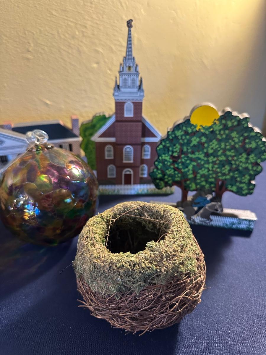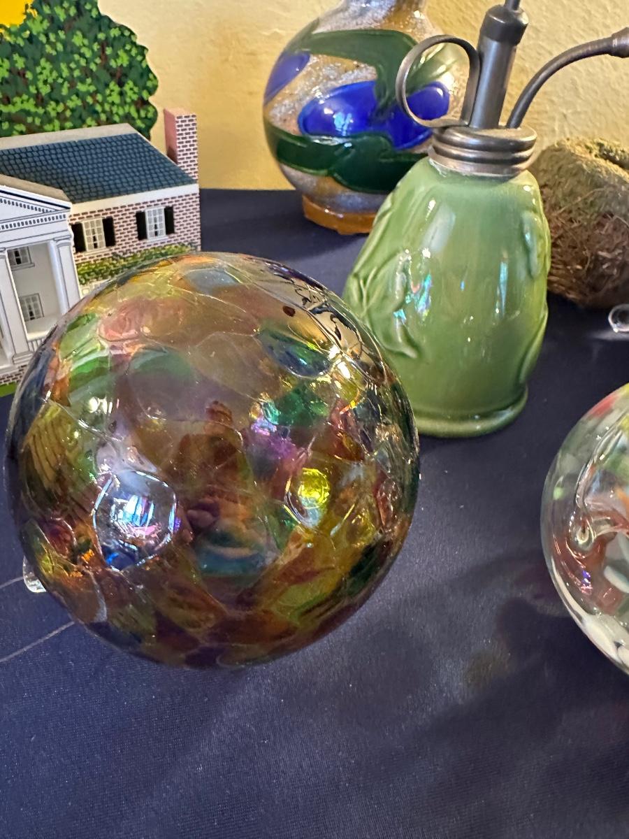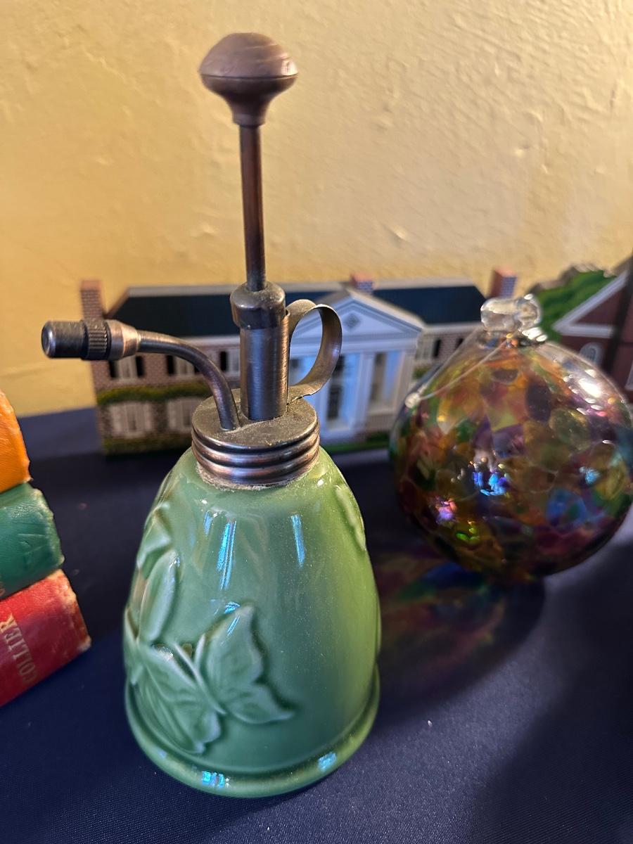 BLOWN GLASS BALL, WATER SPRITZER,ONE EARED COW GLASS COBALT BLUE DECORATED VASE, BIRD NEST, SHEILA HOUSES AS PICTURED