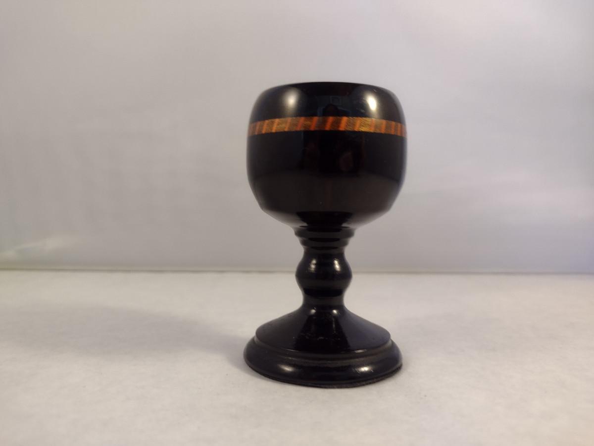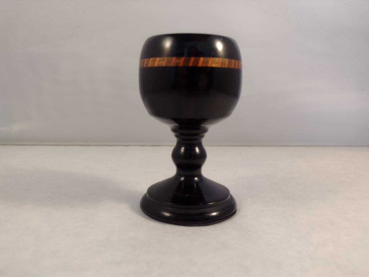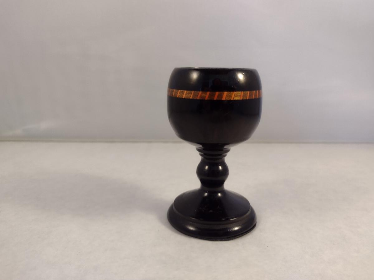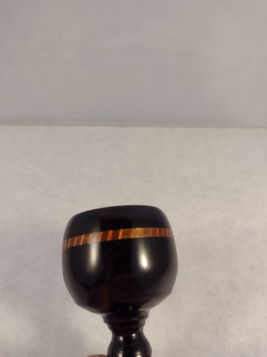 One Hand Crafted Turned Wood African Ebony Goblet with Intricate Inlay. Created by Isle of Man artist Michael Baker. Approx 3 1/4" tall.