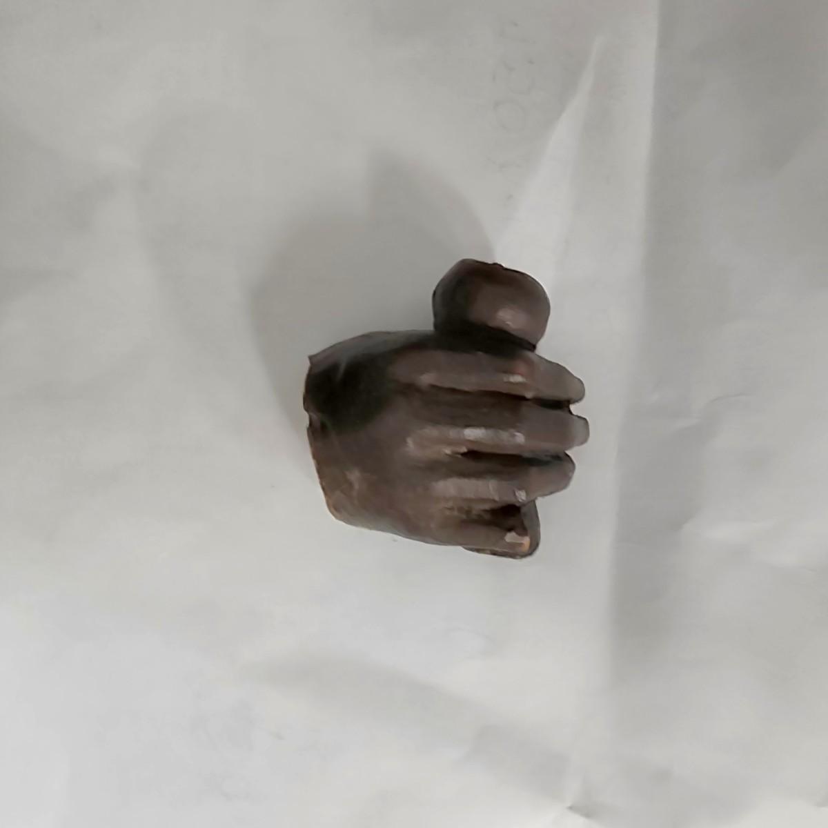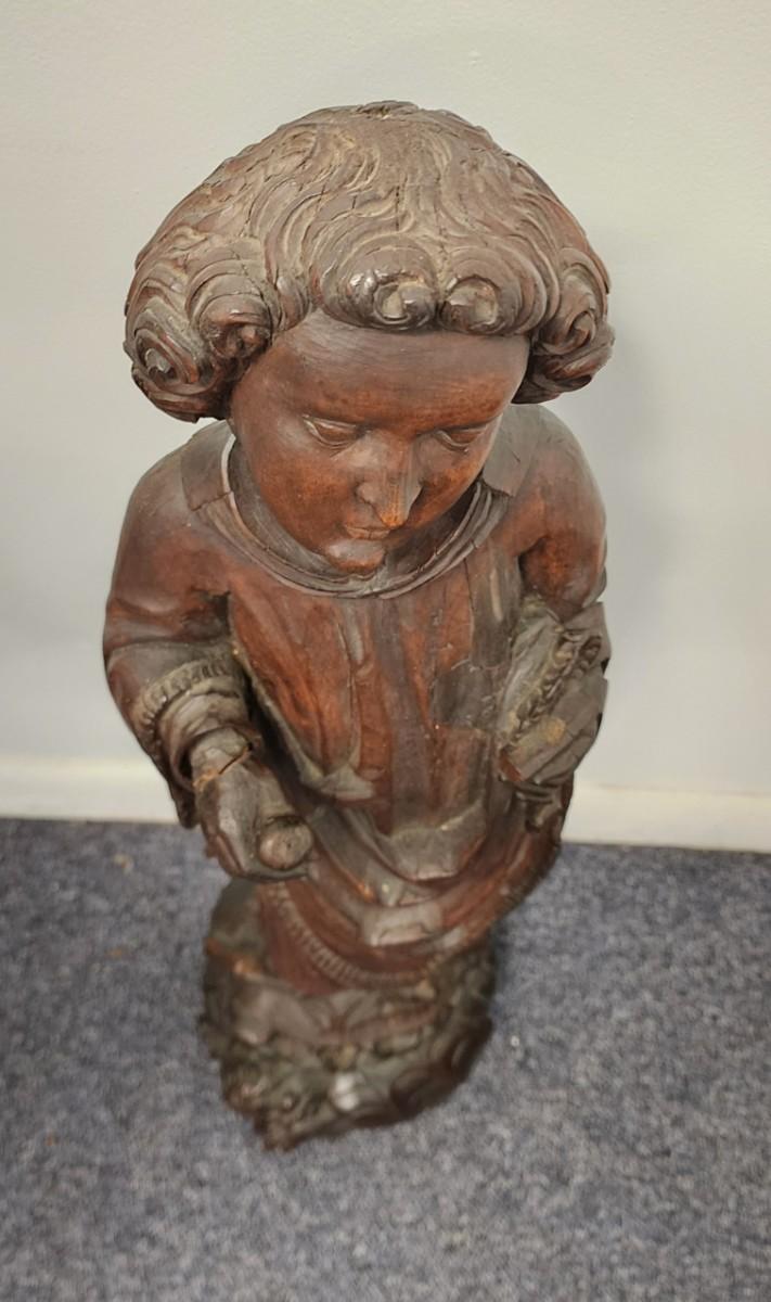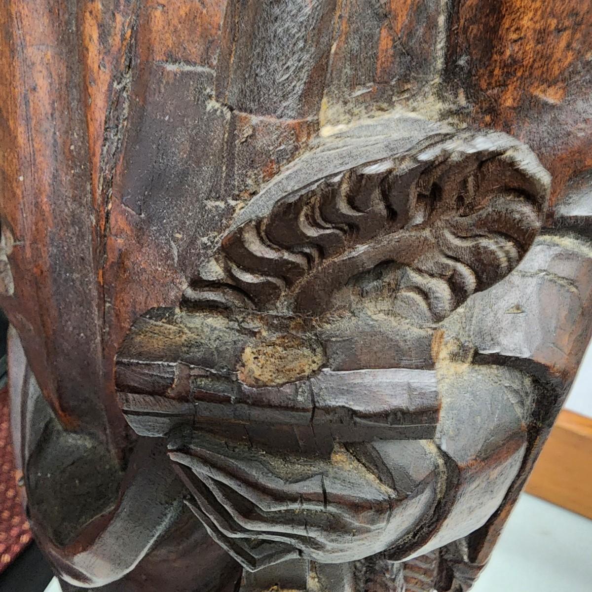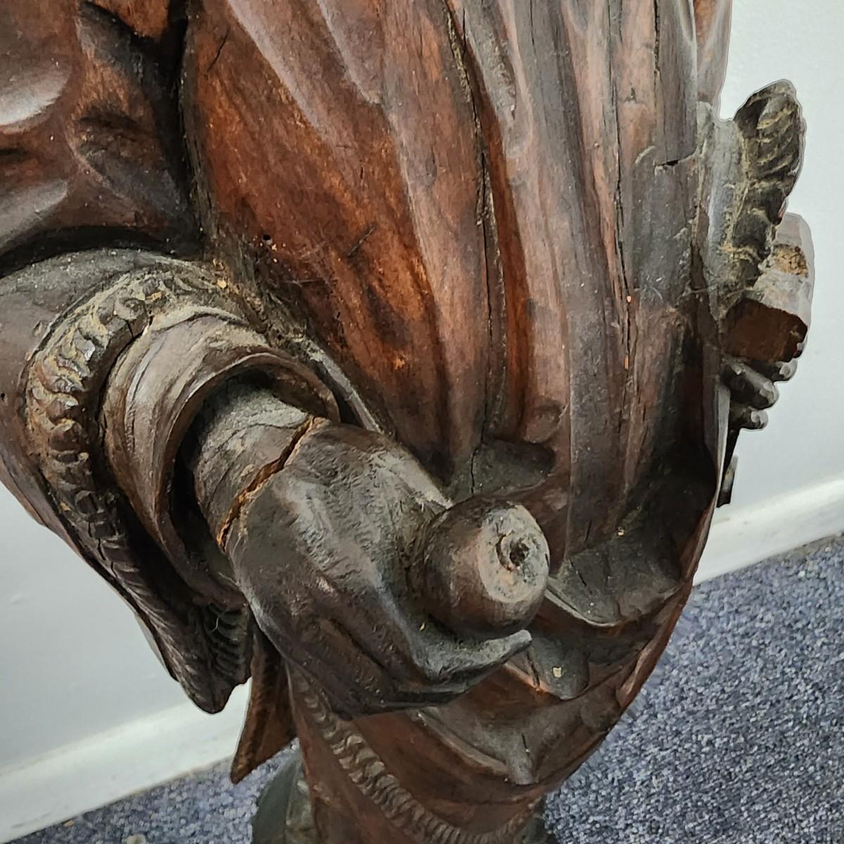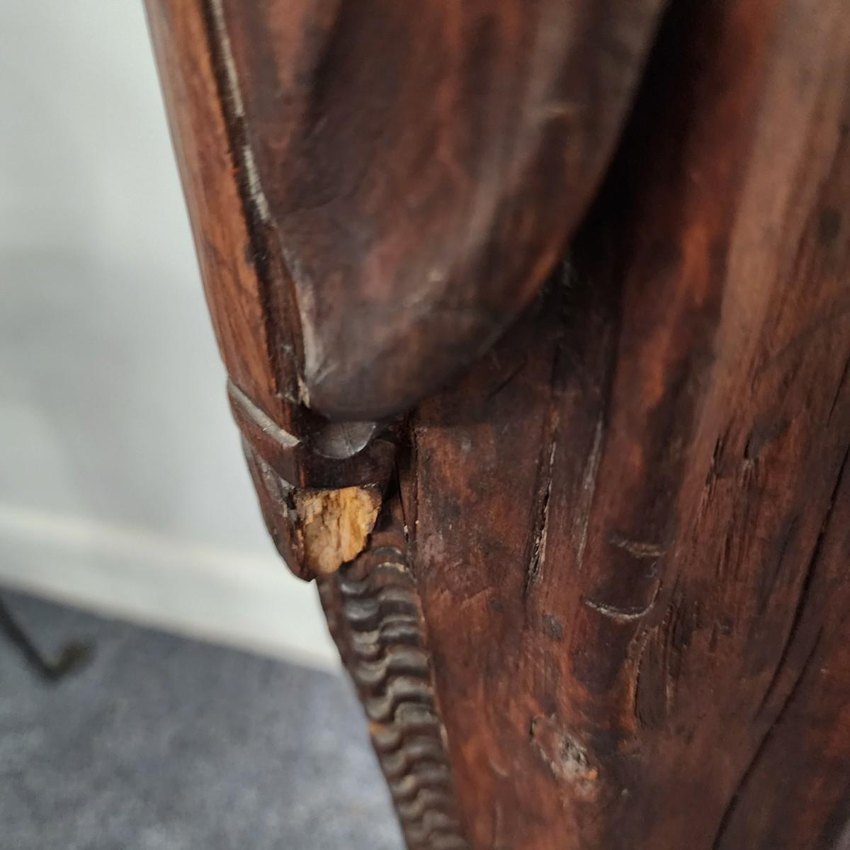 Very old, hand has been repaired with a nail and glue but came loose again, will need to be re-glued. A few chips and damage, please see photos as they are the best description.