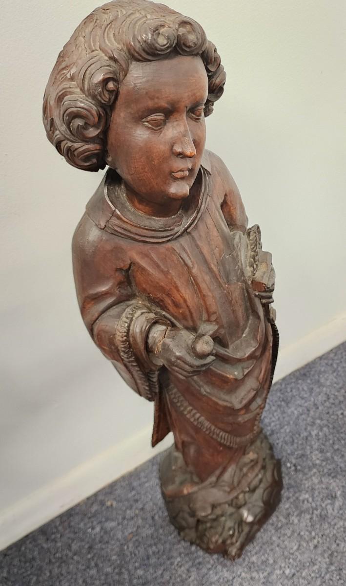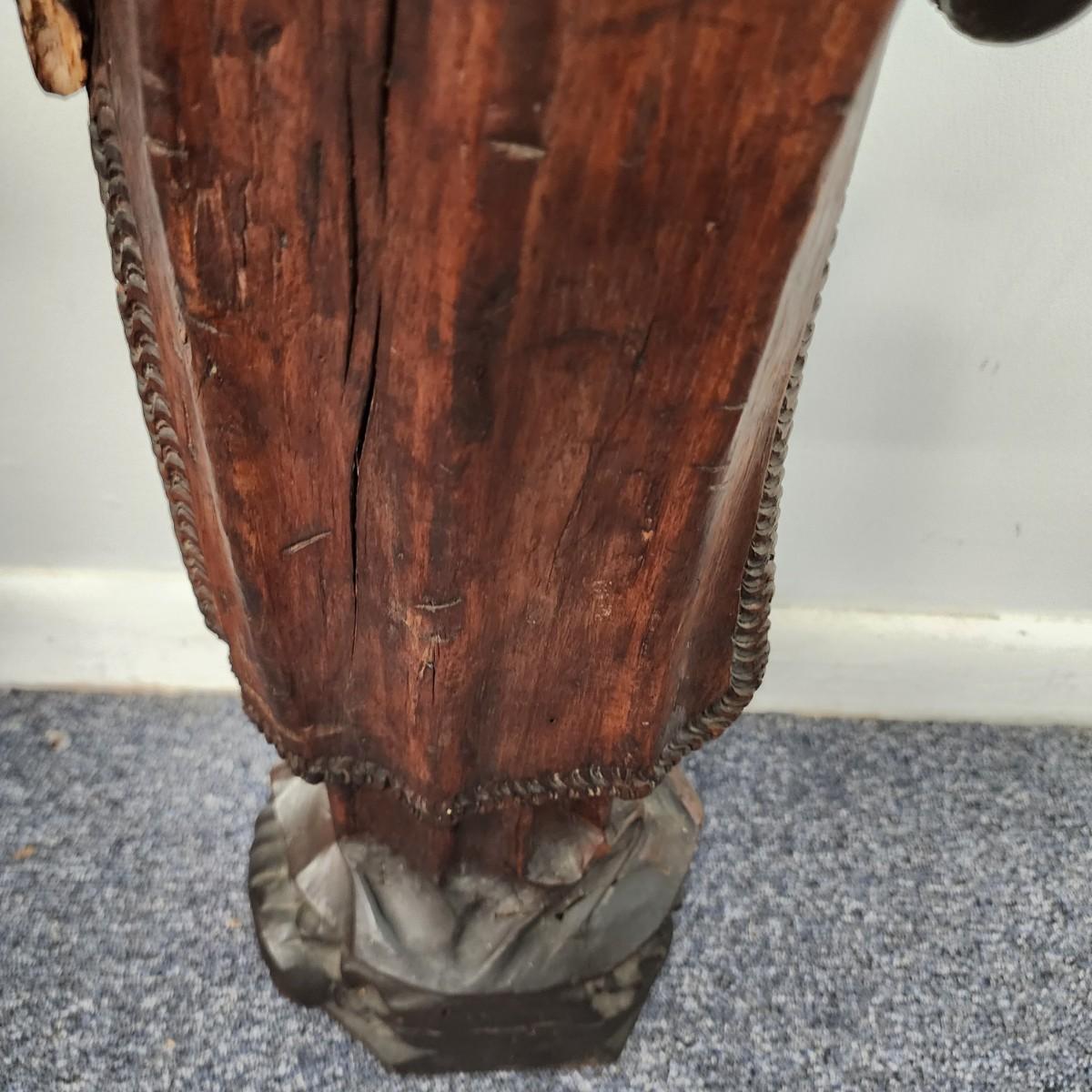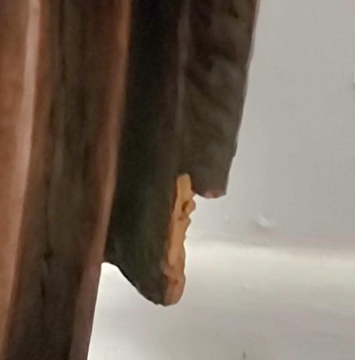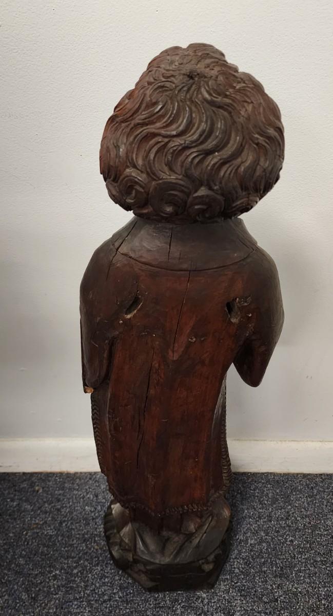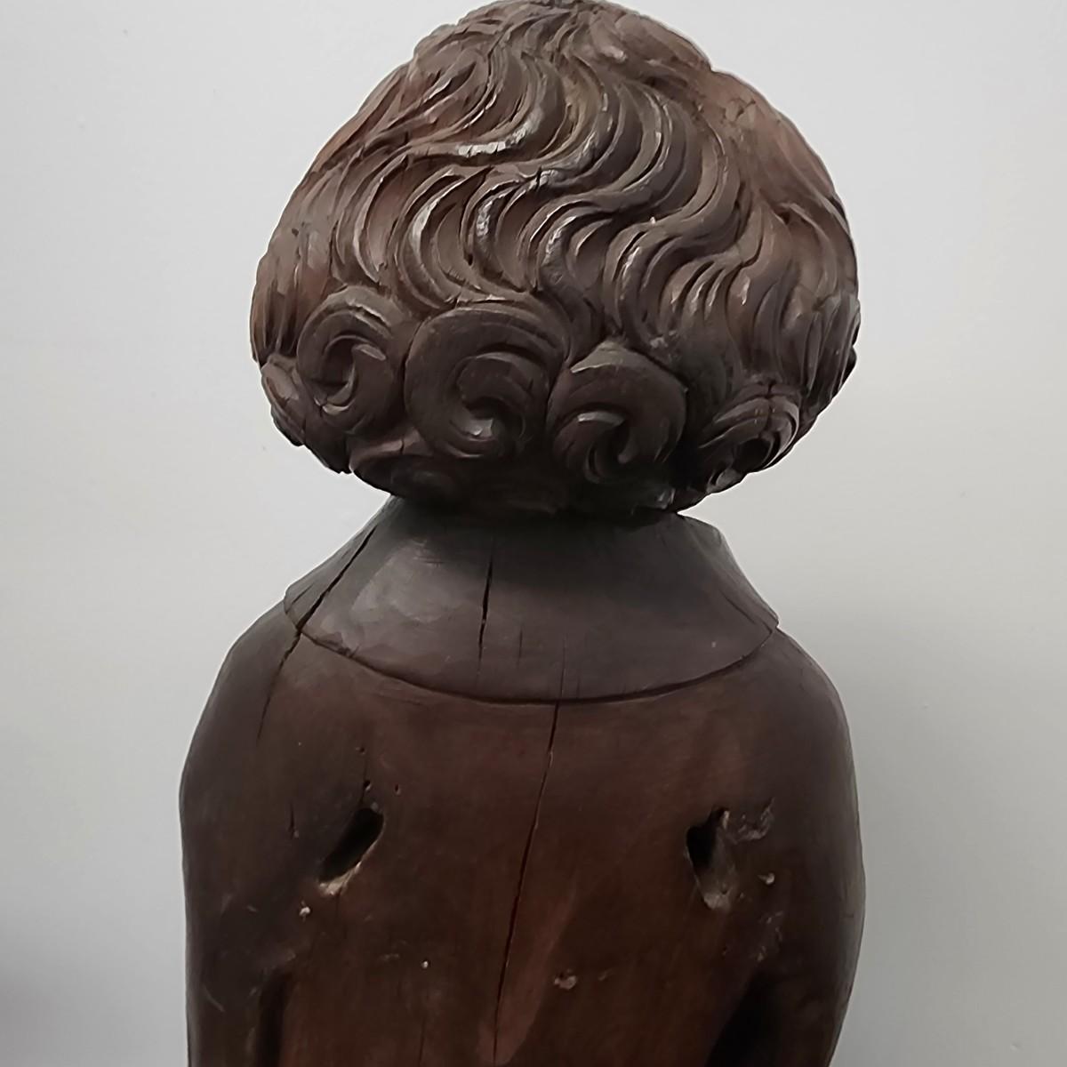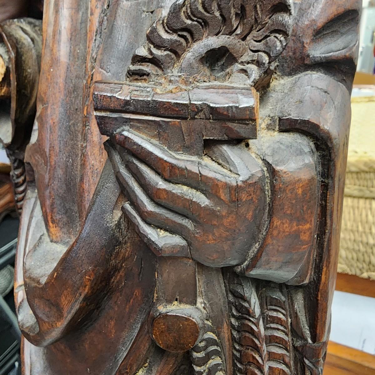 Very old, hand has been repaired with a nail and glue but came loose again, will need to be re-glued. A few chips and damage, please see photos as they are the best description.