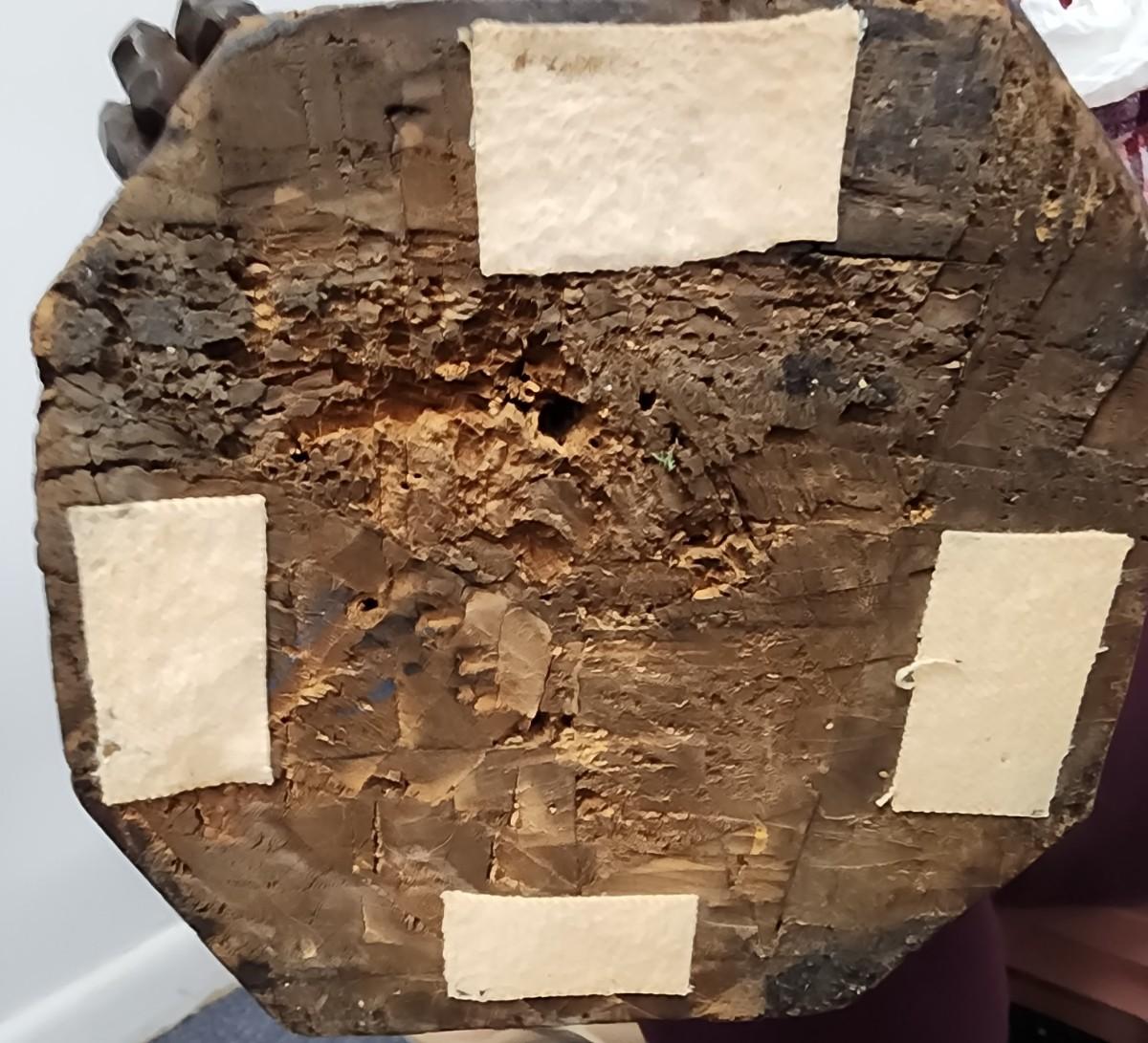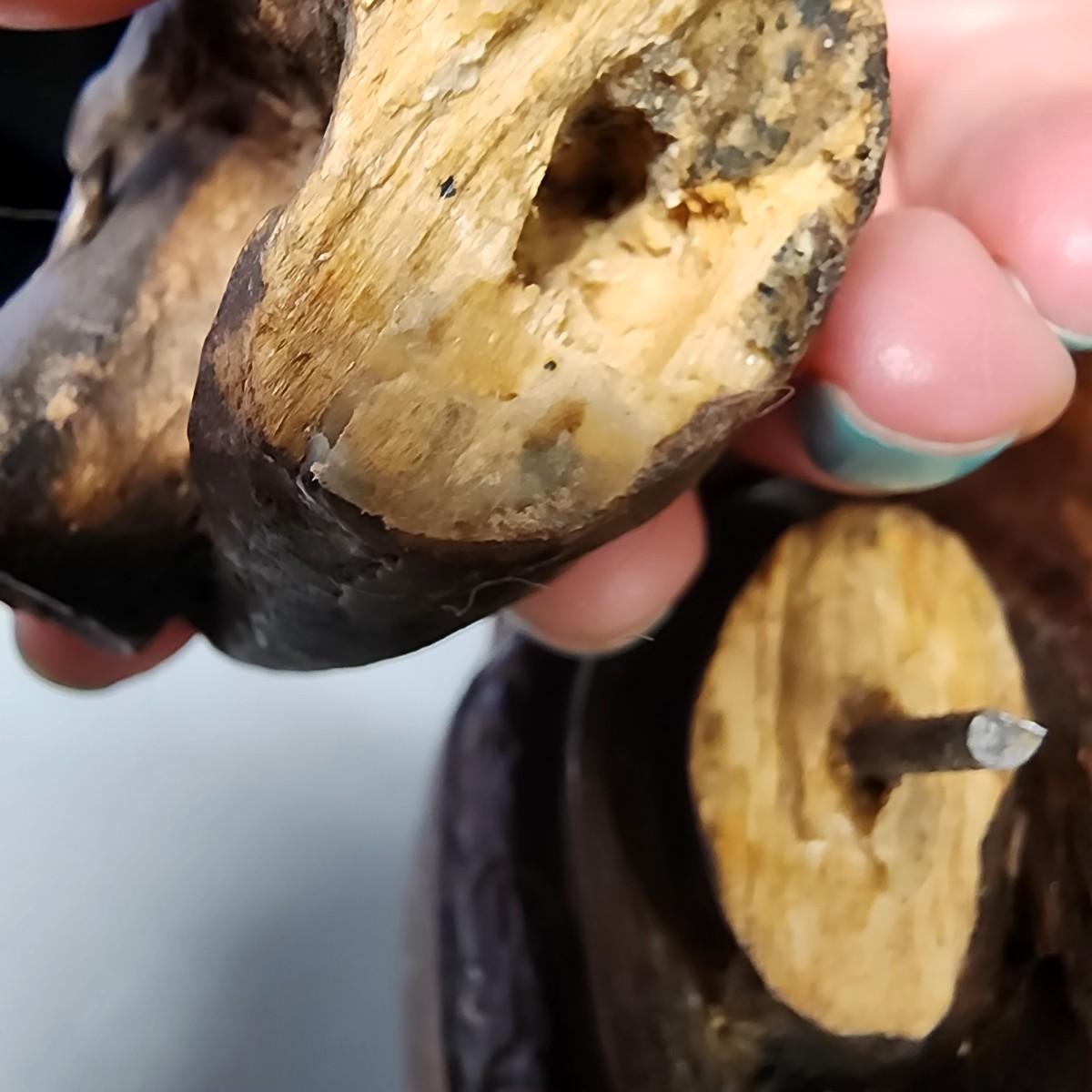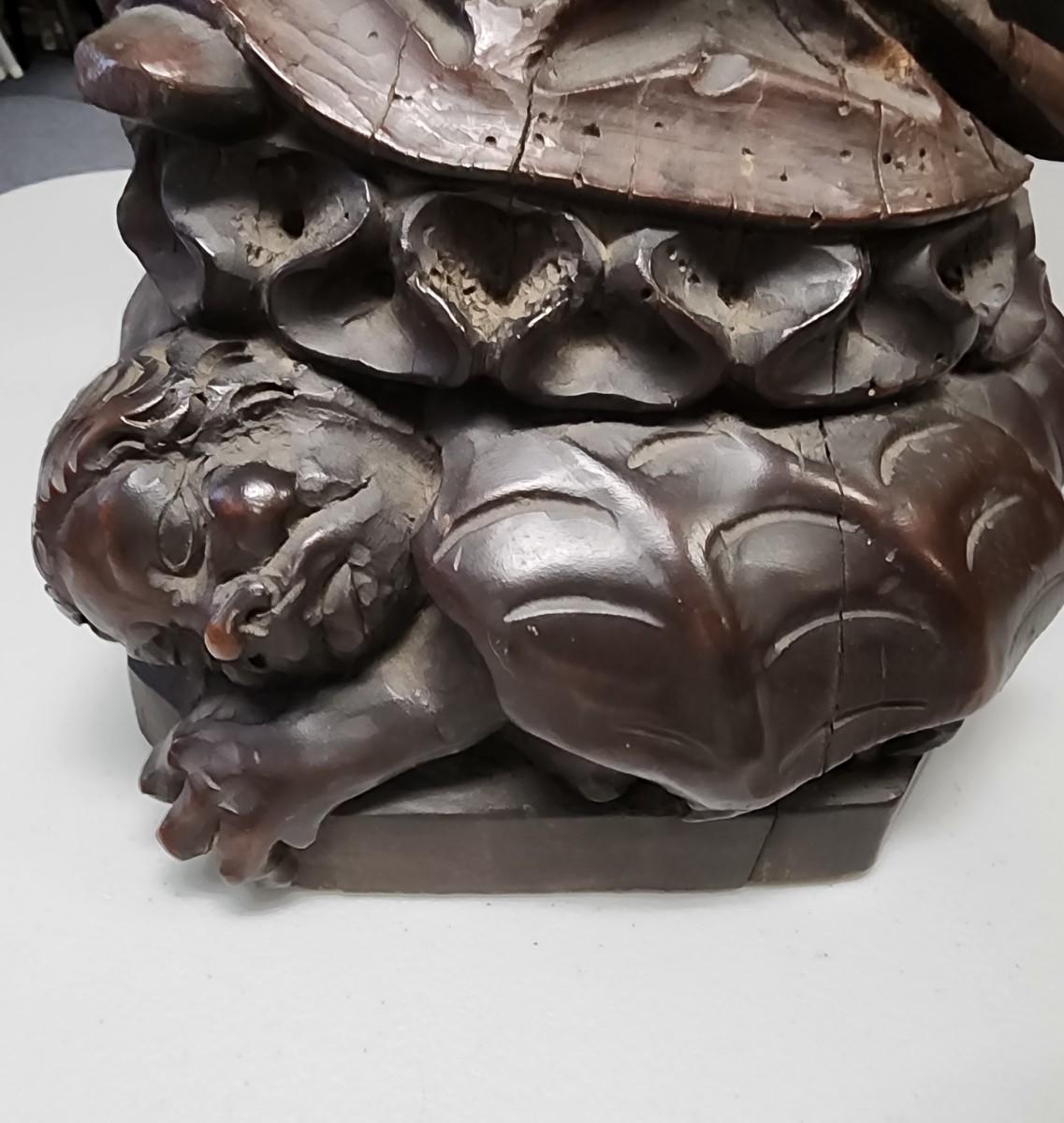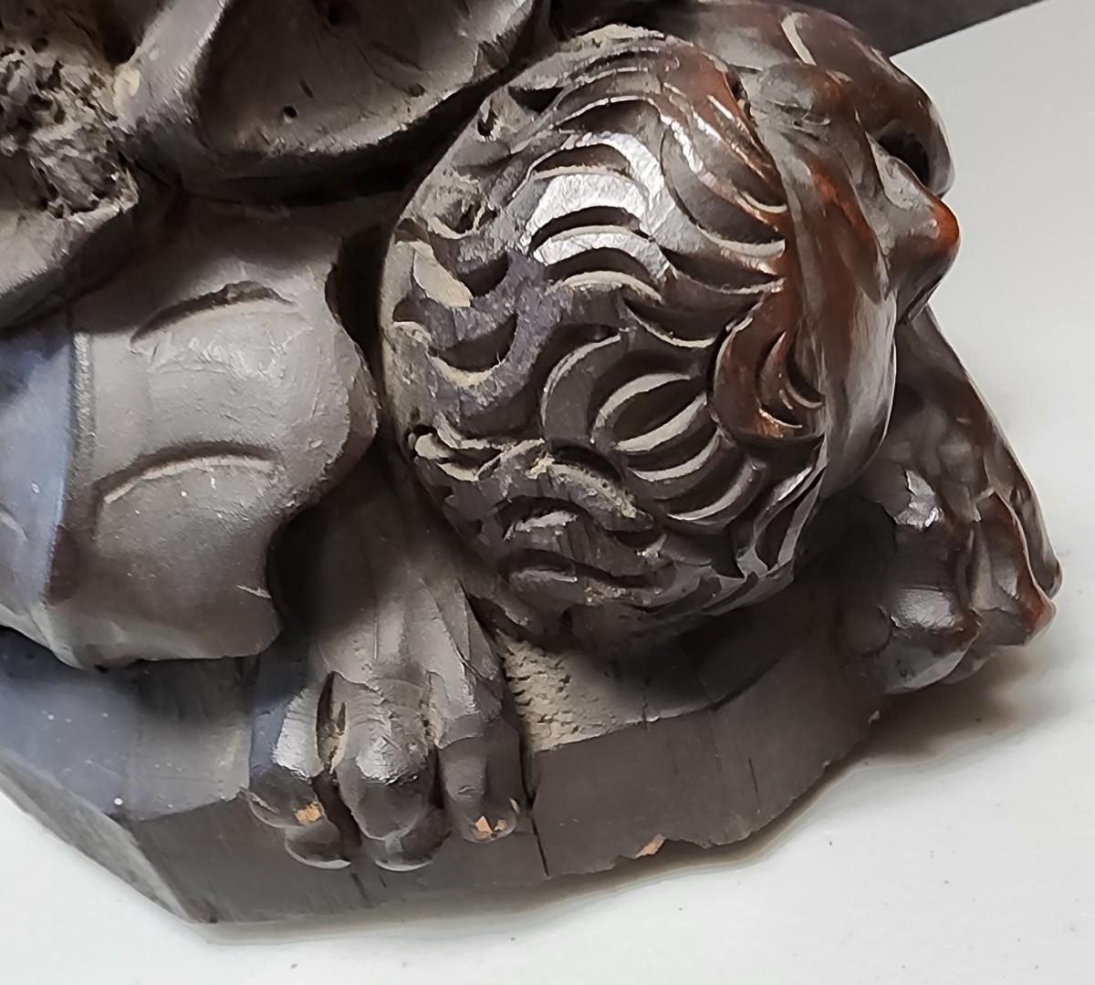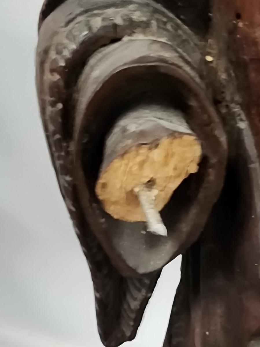 Very old, hand has been repaired with a nail and glue but came loose again, will need to be re-glued. A few chips and damage, please see photos as they are the best description.