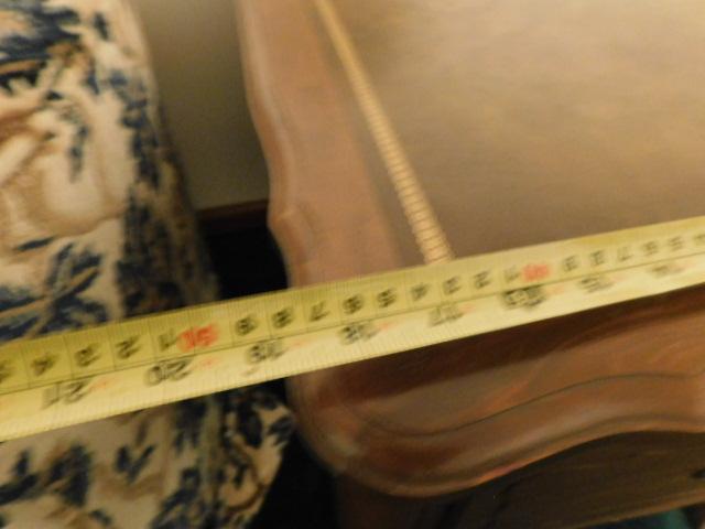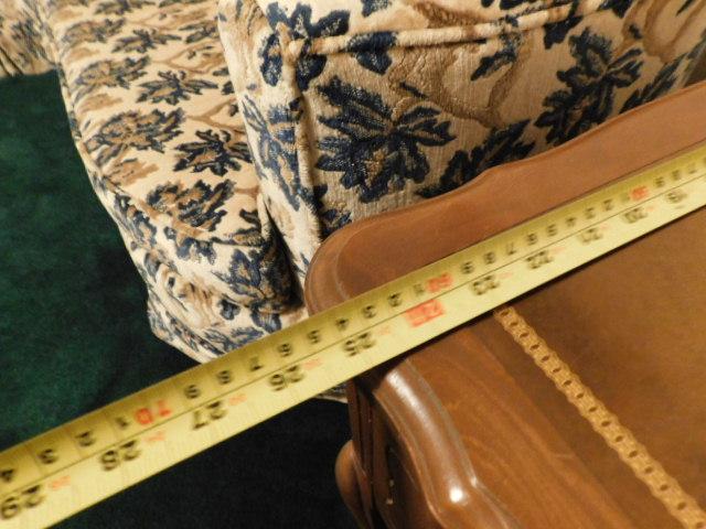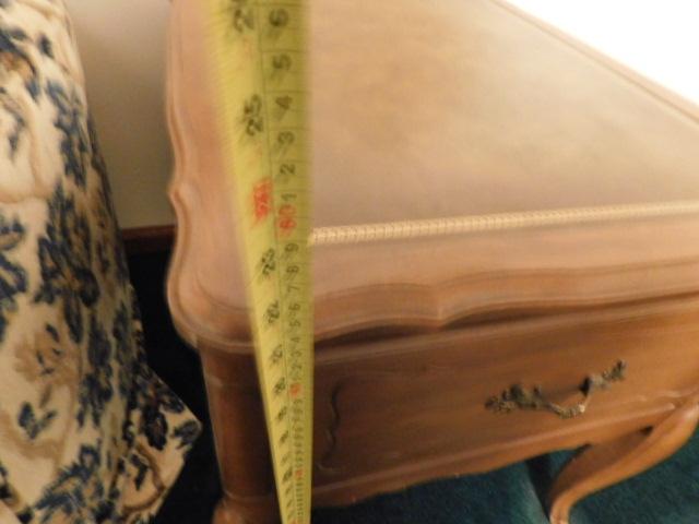 One of Two Solid Wood Pecan Side Table with Inlay Top 25" x 19" x 22" in very good condition but may have scratches or wear marks