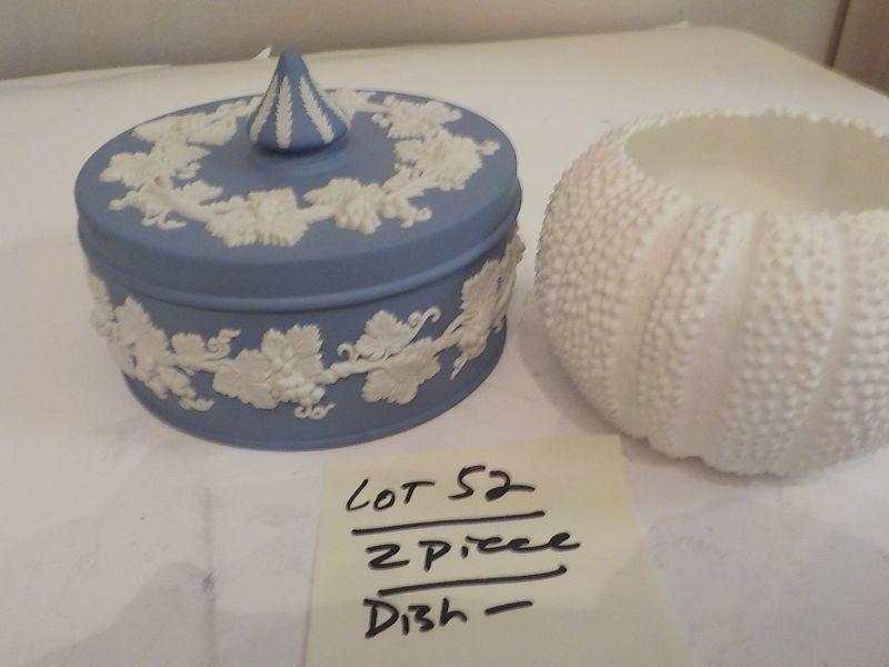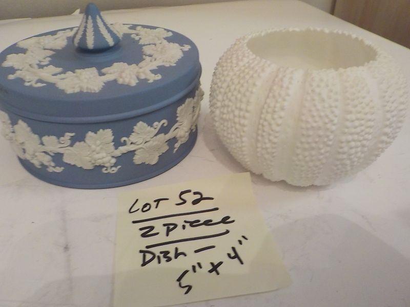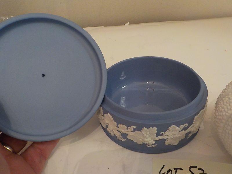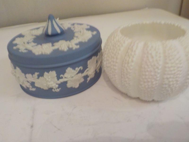 Wedge wood has cover exciting white on blue and the other is a sea shell design.