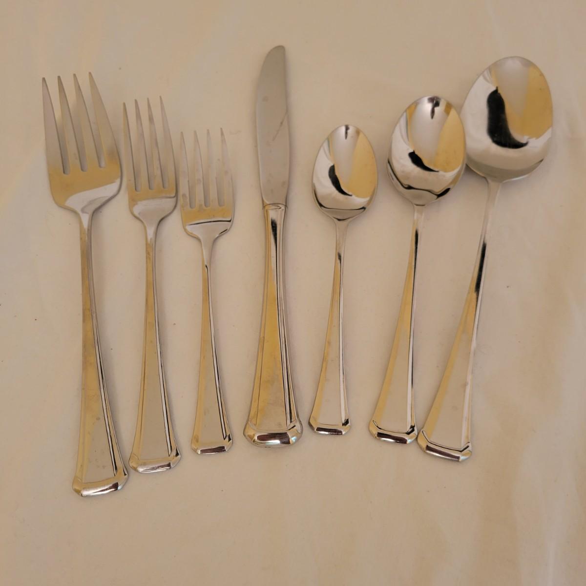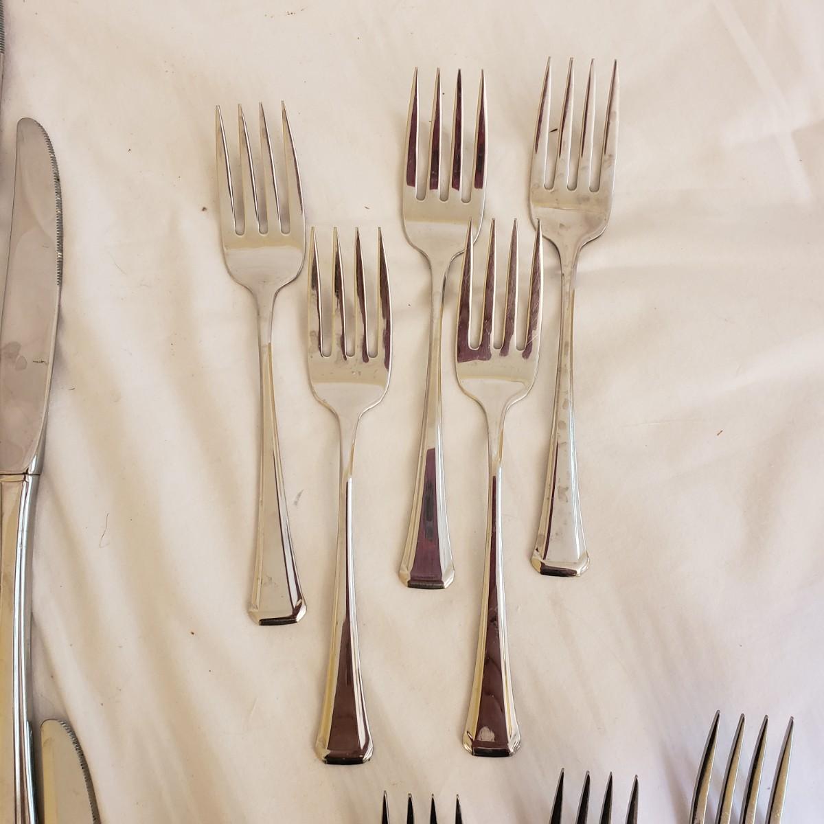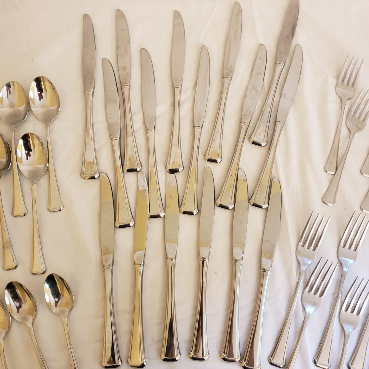 This lot is an Oneida Silverware set called Aberdeen. The set includes five small forks, seven large forks, two serving spoons, one serving fork, 16 knives, six small spoons, and 13 large spoons.