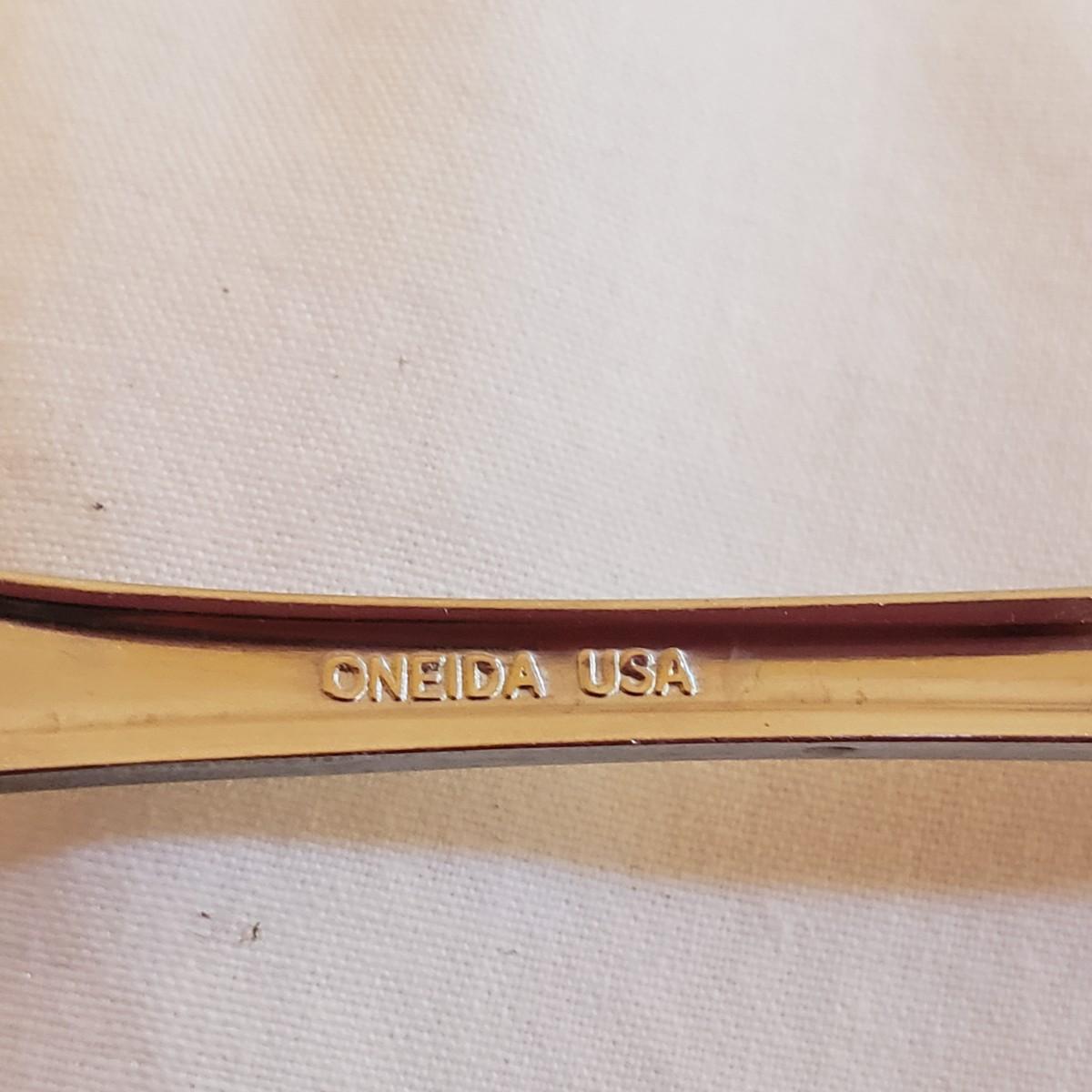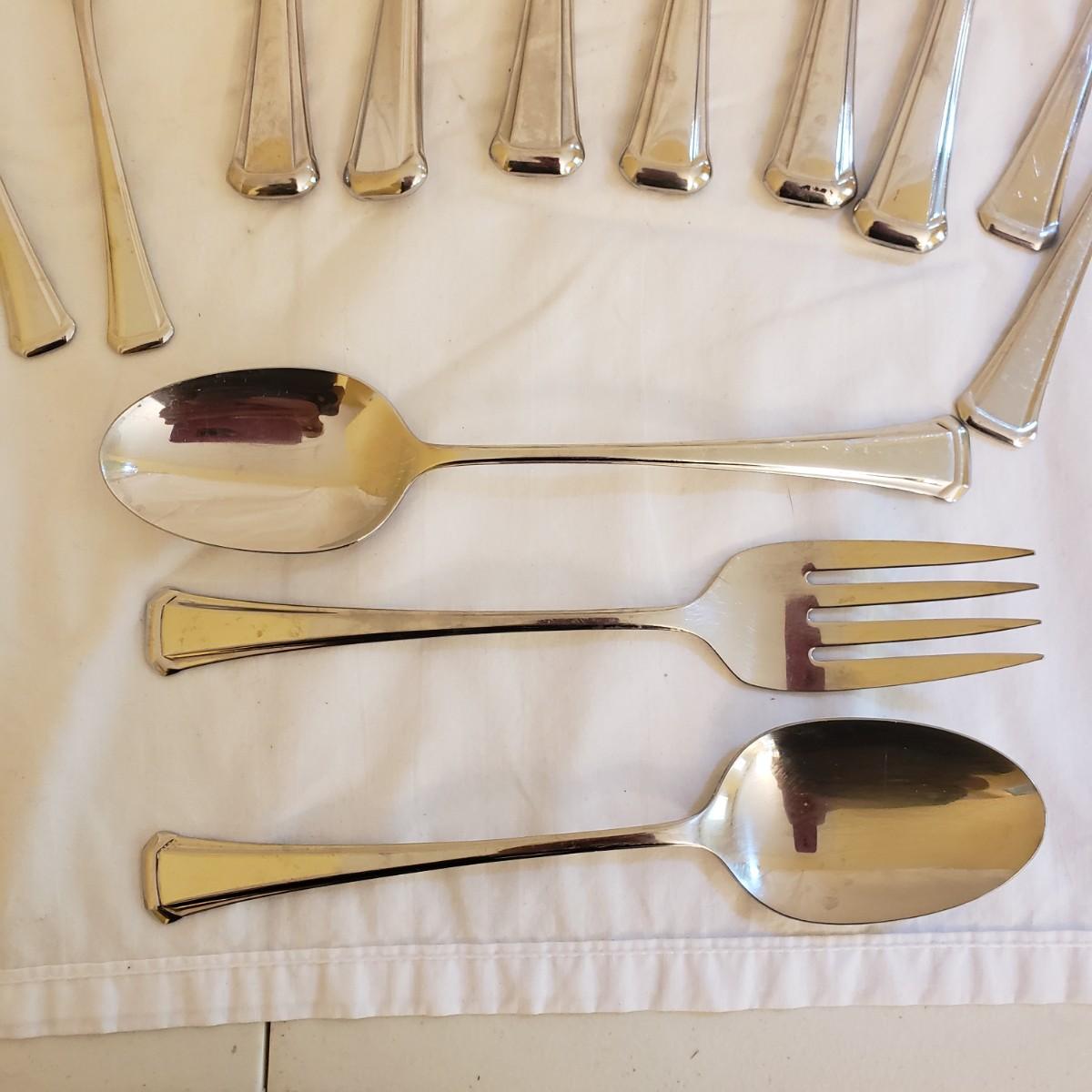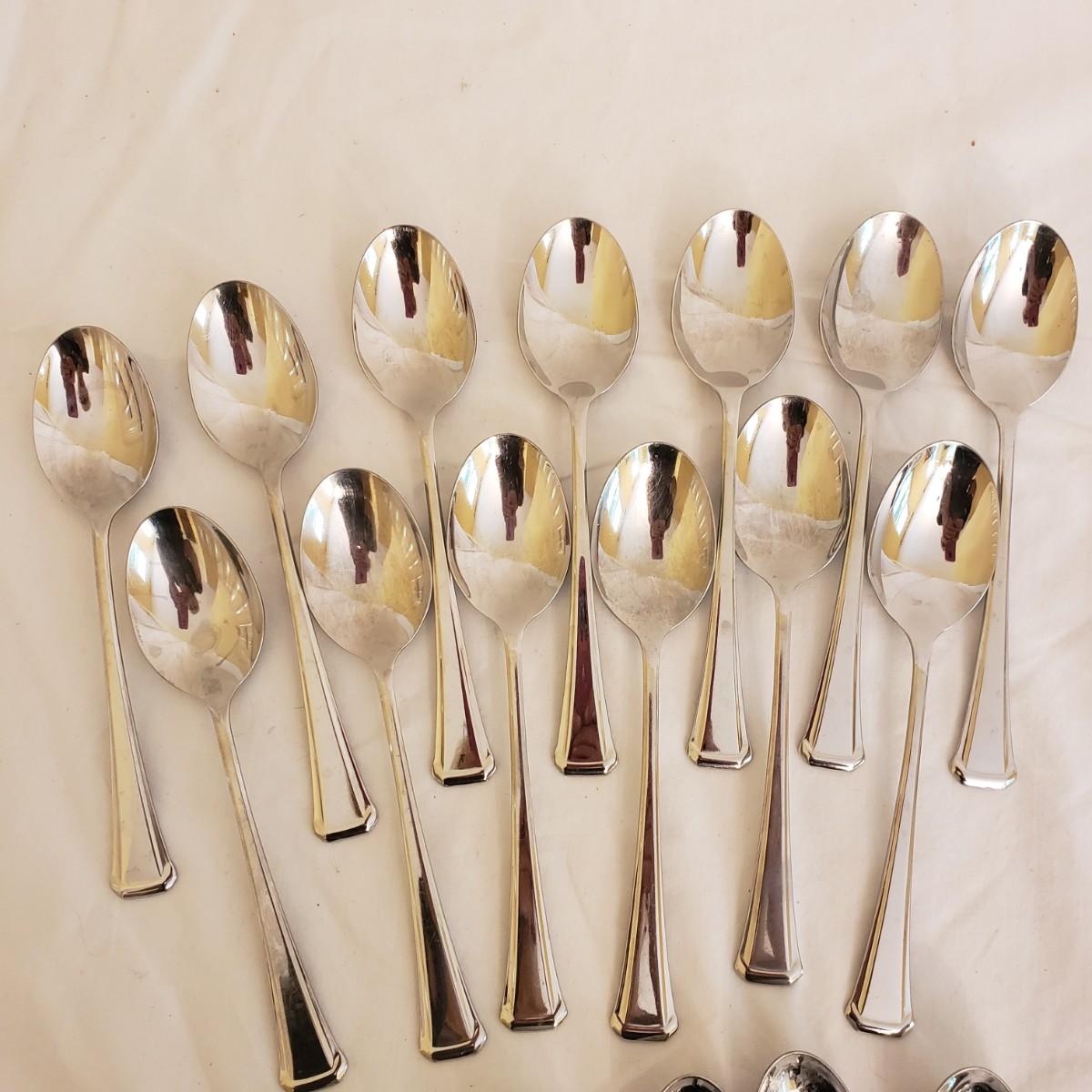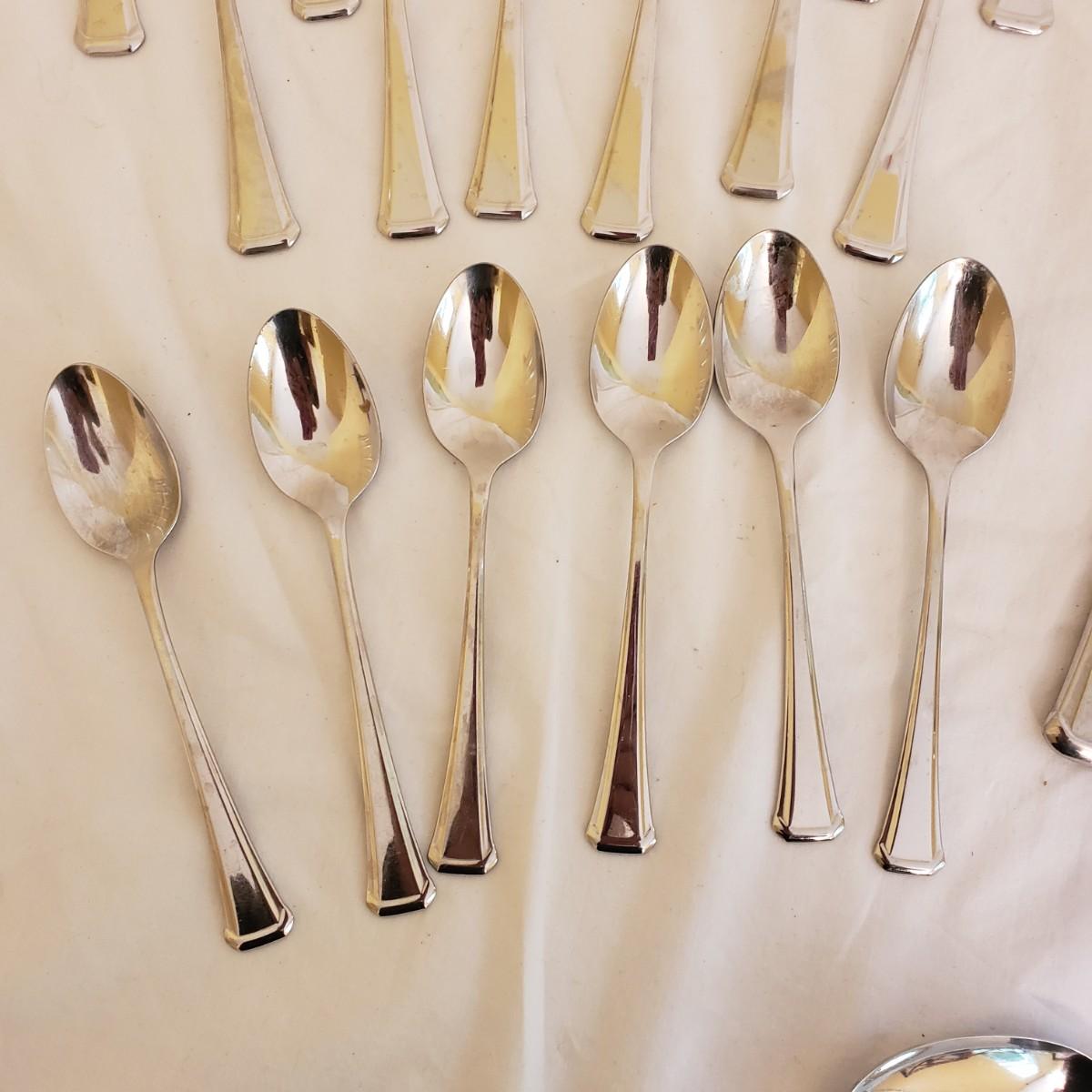 This lot is an Oneida Silverware set called Aberdeen. The set includes five small forks, seven large forks, two serving spoons, one serving fork, 16 knives, six small spoons, and 13 large spoons.