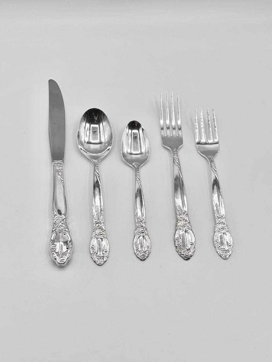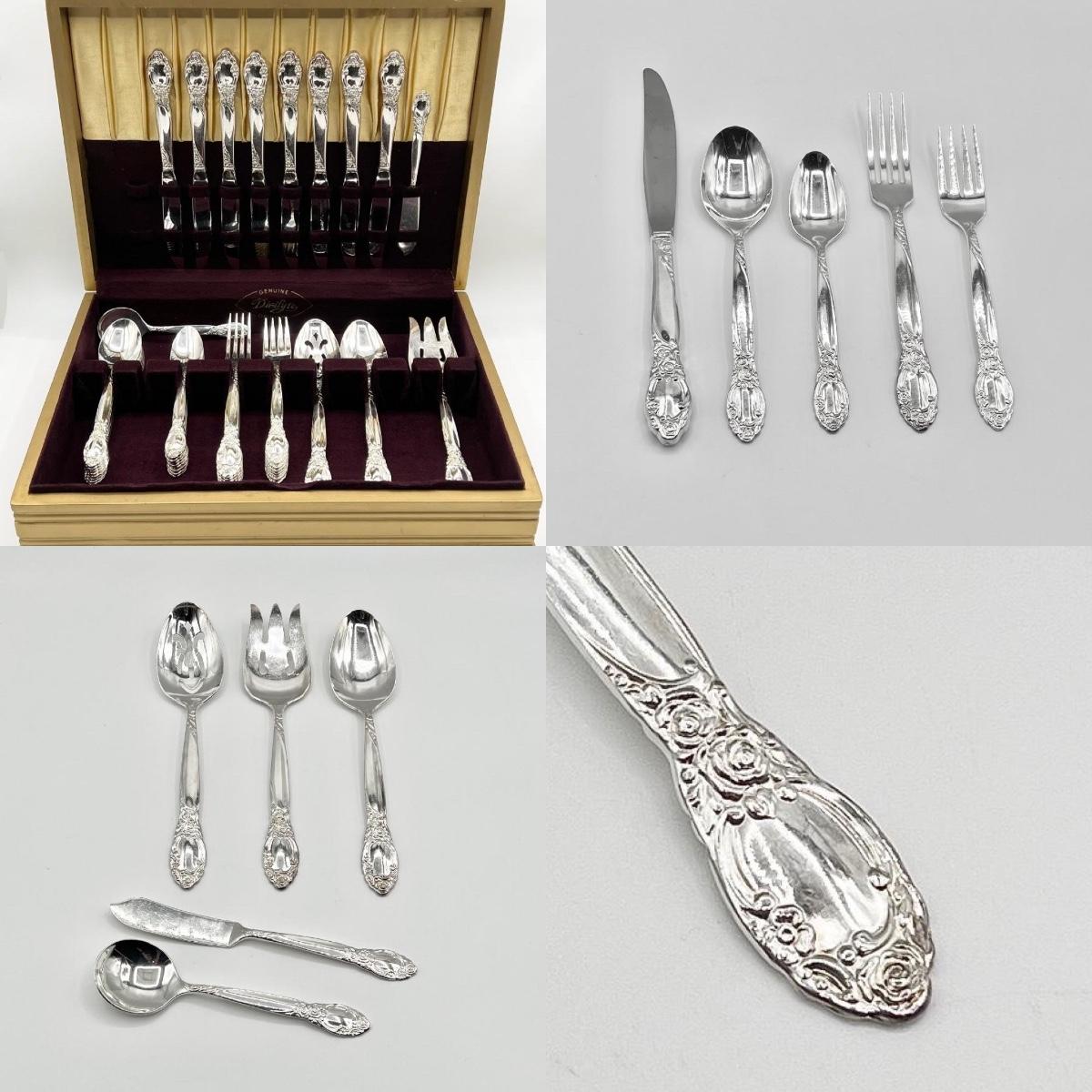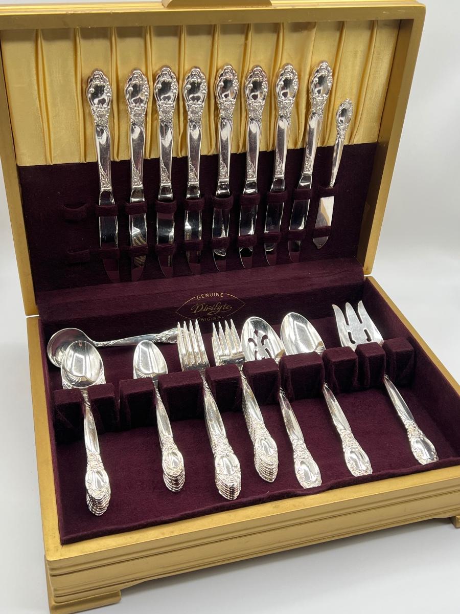 Set includes: 8 salad forks, 8 soup spoons, 8 teaspoons, 8 butter knives, **but only has 7 dinner forks ~ *Is missing 1 dinner fork to make the complete service for 8 ~ 5 serving pieces ~ Includes storage box