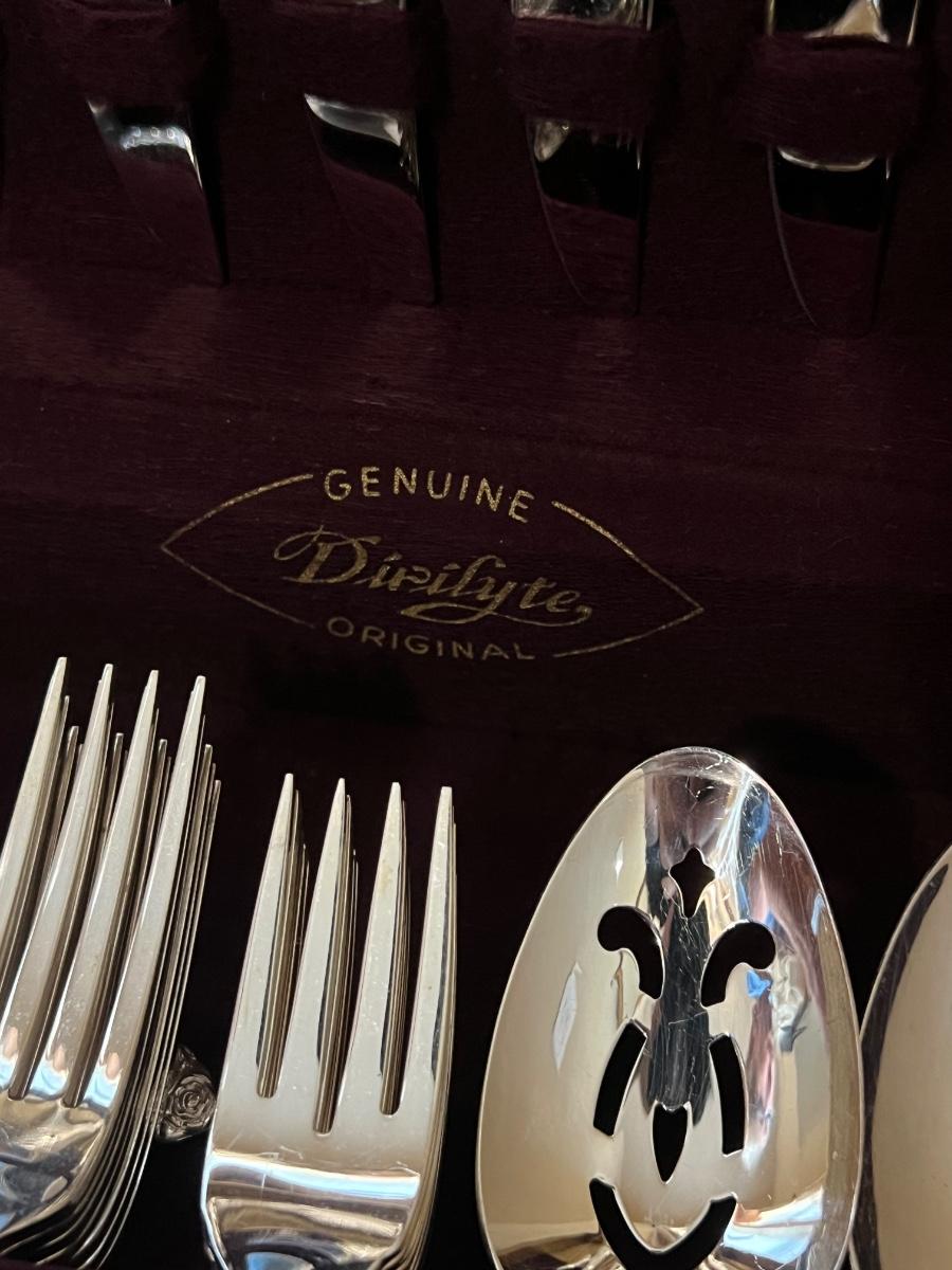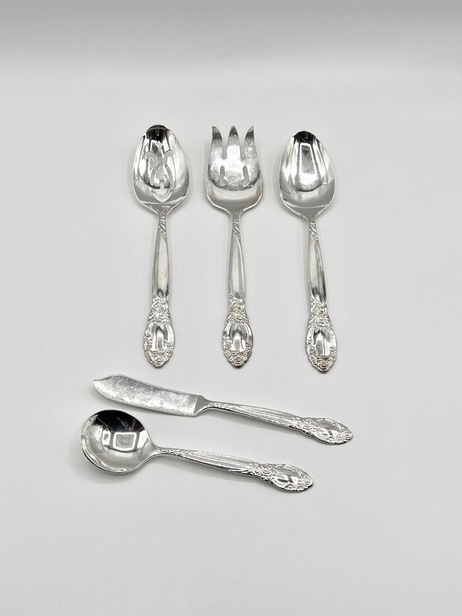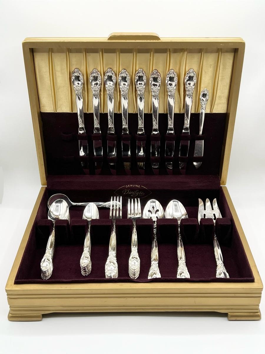 Set includes: 8 salad forks, 8 soup spoons, 8 teaspoons, 8 butter knives, **but only has 7 dinner forks ~ *Is missing 1 dinner fork to make the complete service for 8 ~ 5 serving pieces ~ Includes storage box
