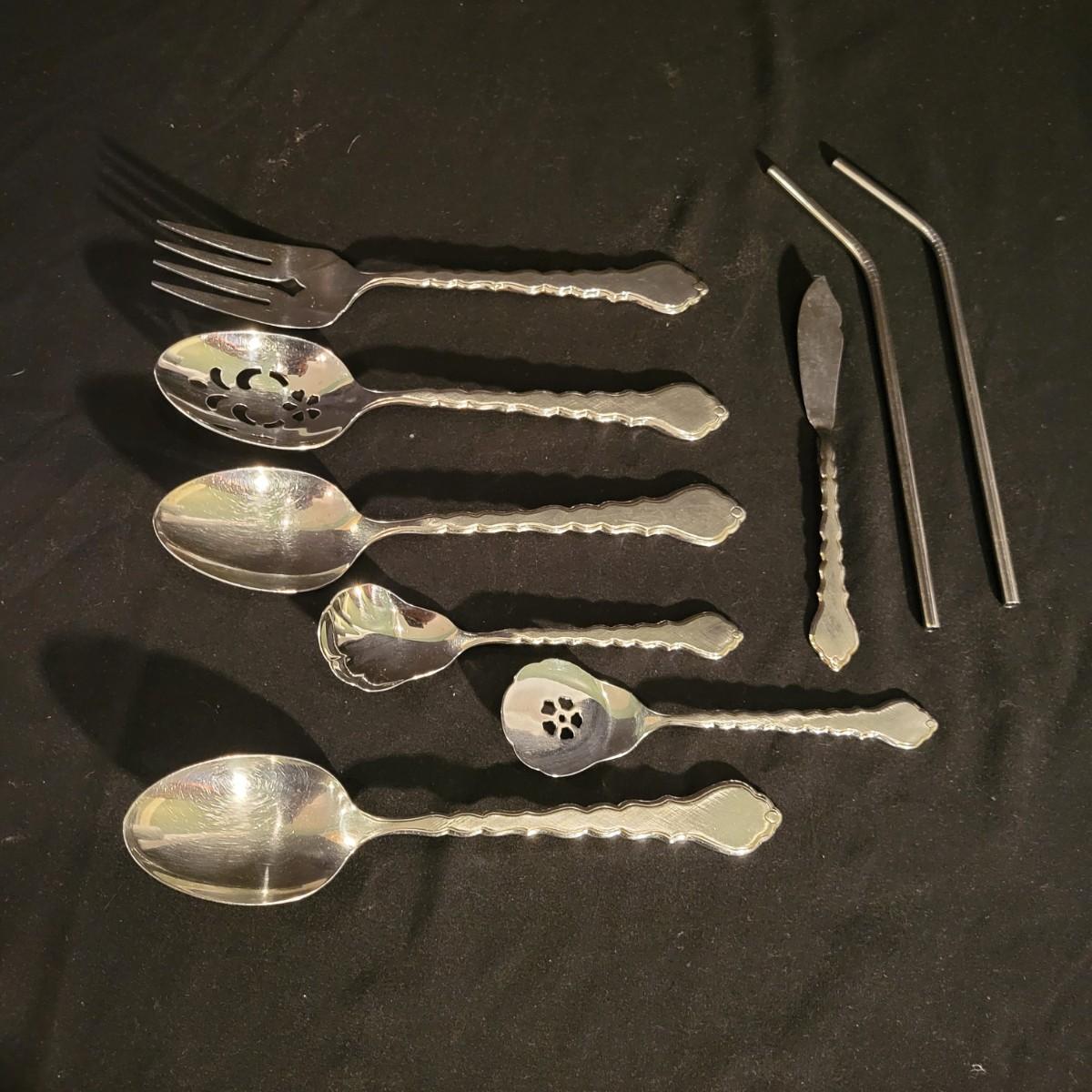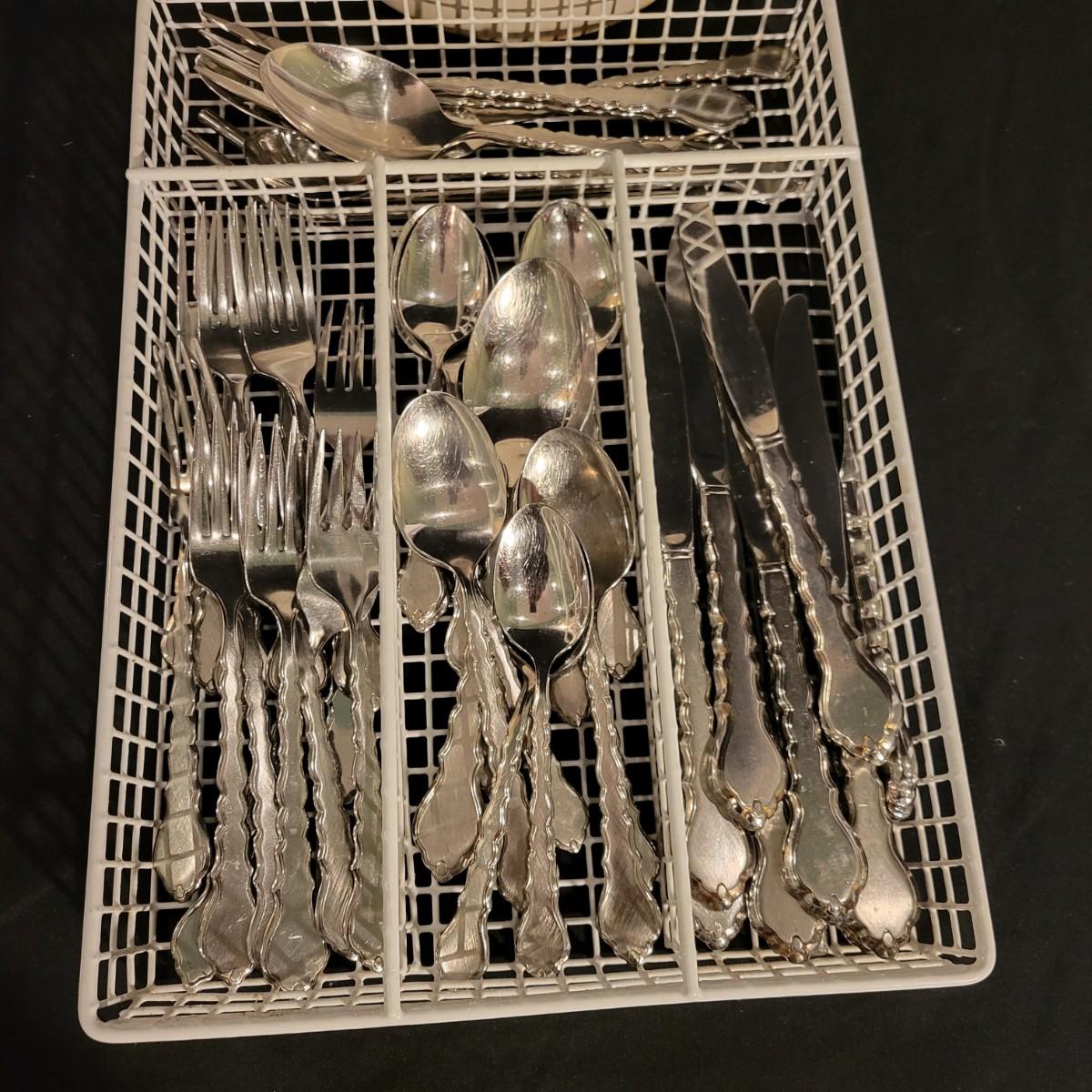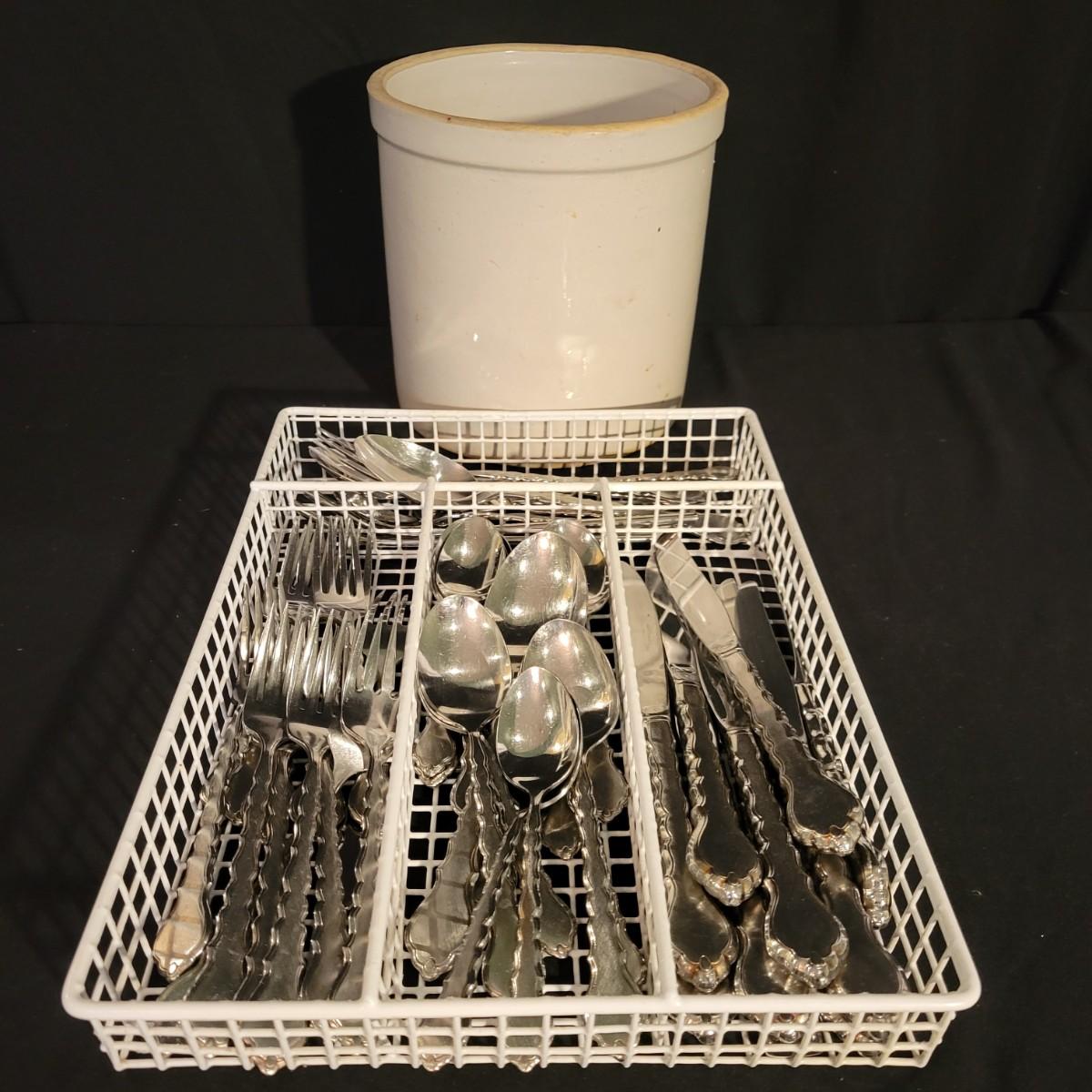 An Onieda community stainless flatware set that has approximately 43 pieces and includes two reusable straws. Also included is a white ceramic crock that measures approximately 7.5"D x 7.5"H. The white wire organizer is also included. Shipping available