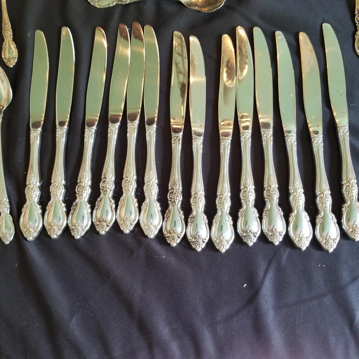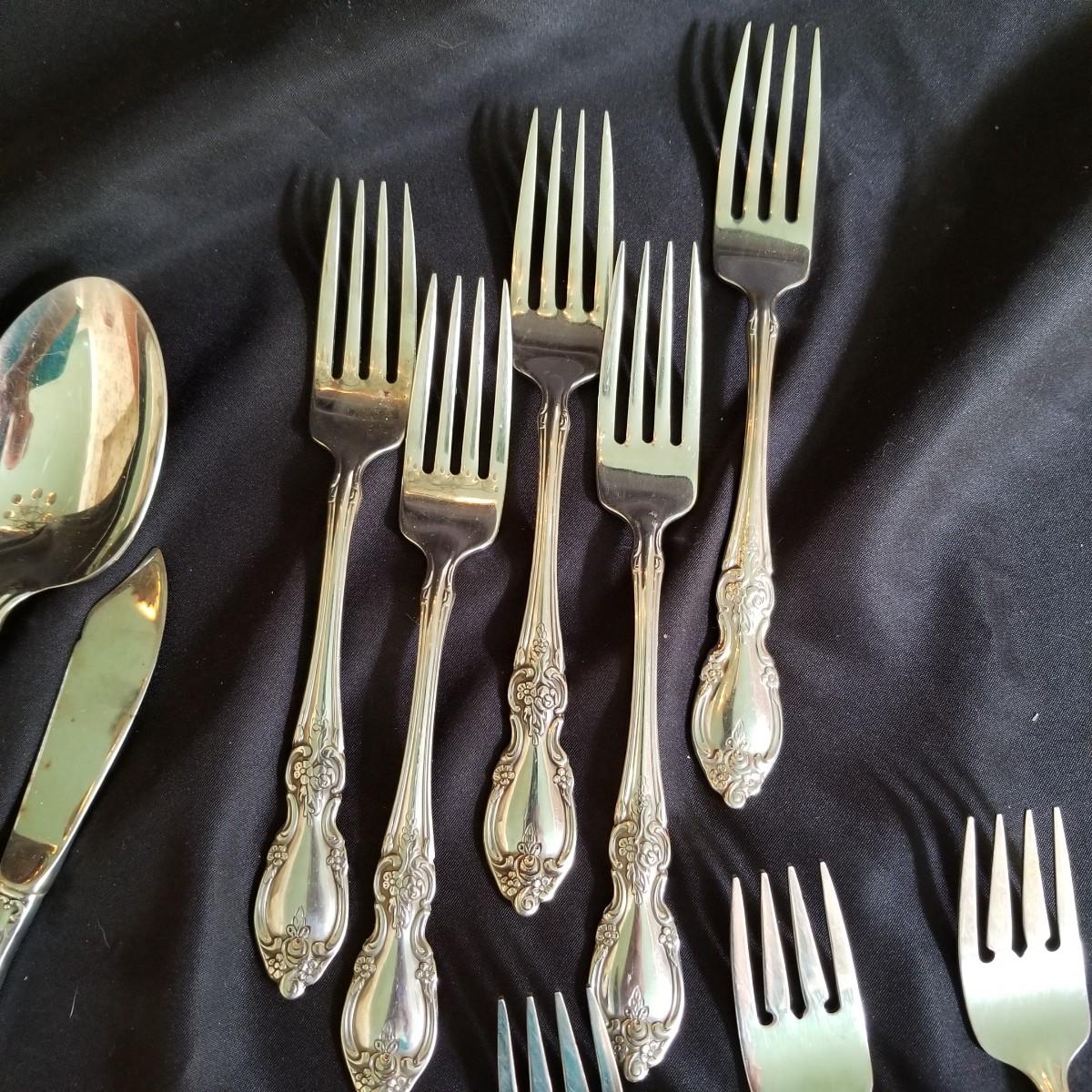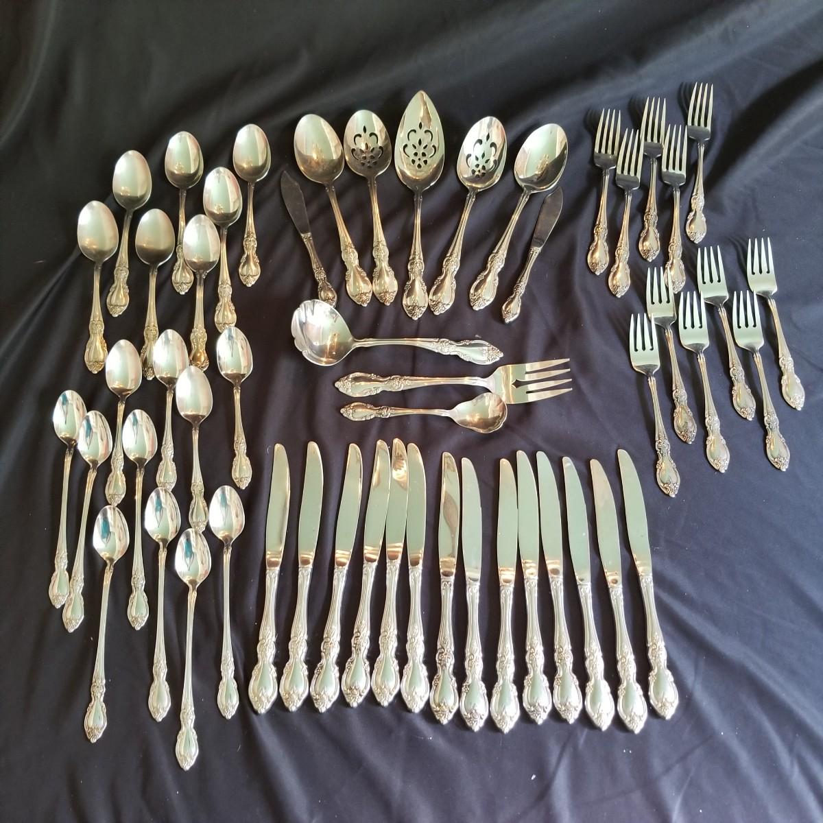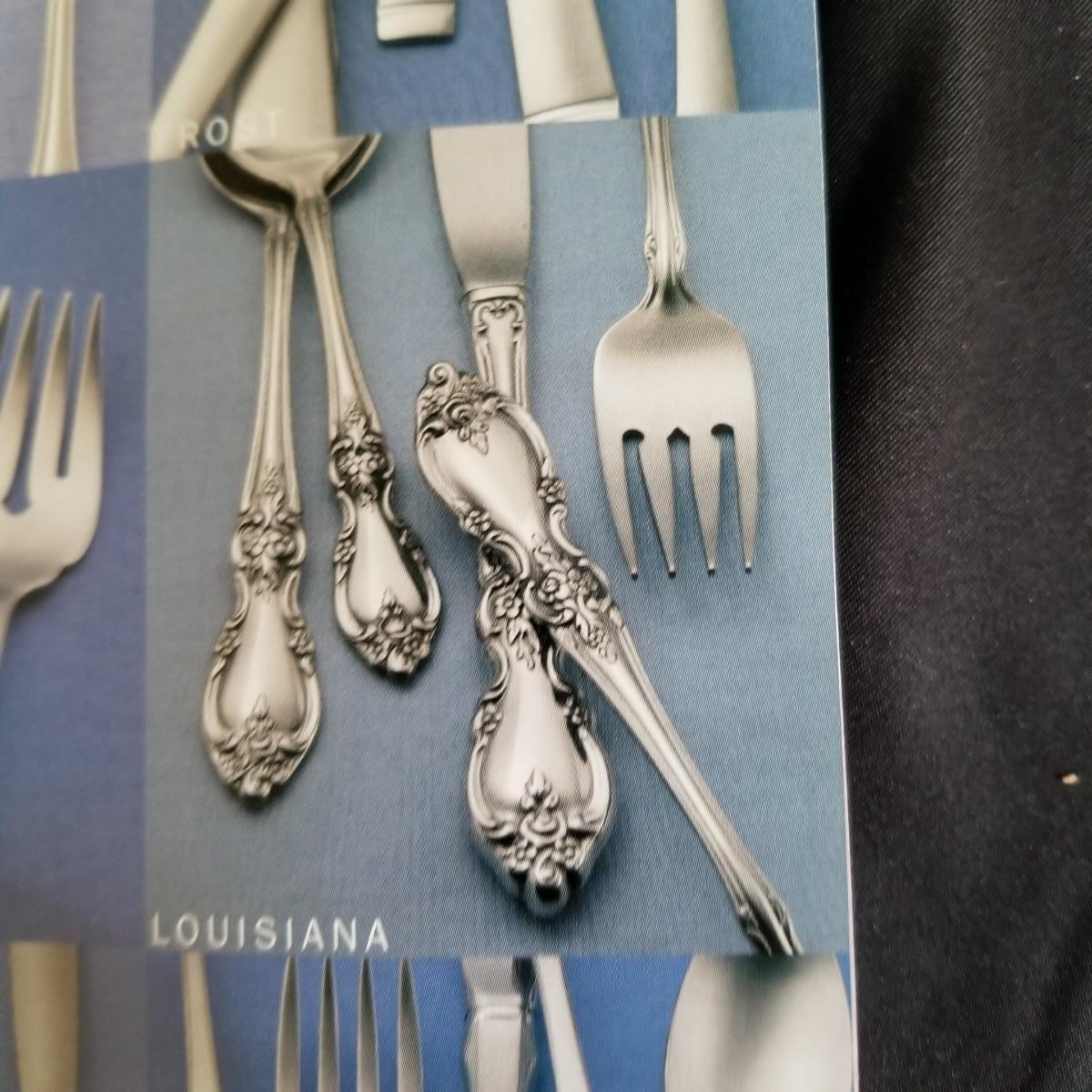 Oneida Community stainless flatware in the Louisiana pattern. Set includes: fourteen dinner knives, five dinner forks, six dessert forks, seven table spoons, four tea spoons, seven ice tea spoons. Serving pieces included are: two butter knives, two solid spoons, two slotted spoons, one meat fork, one pie server, one soup ladle and one sugar spoon. Items show normal wear. Shipping available.