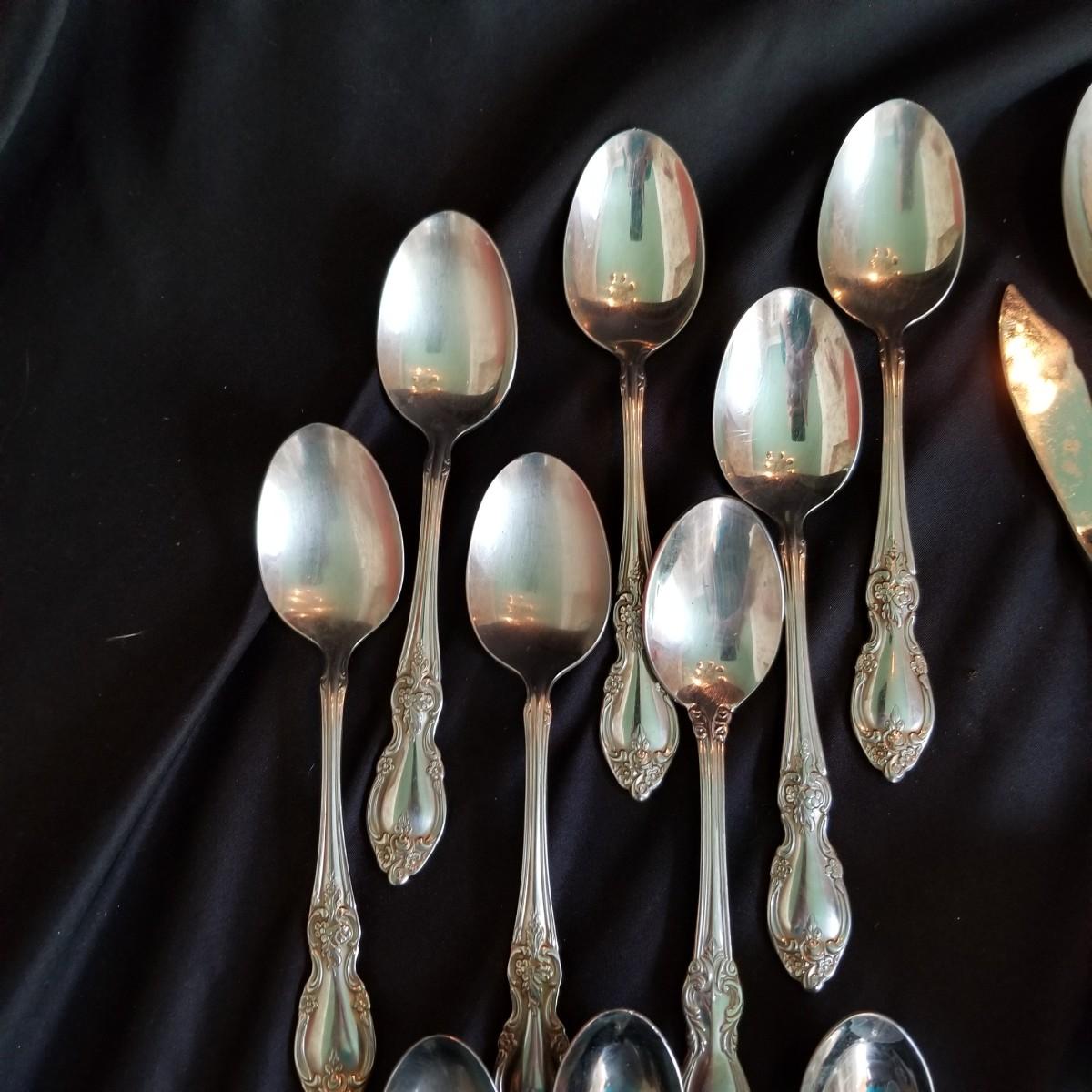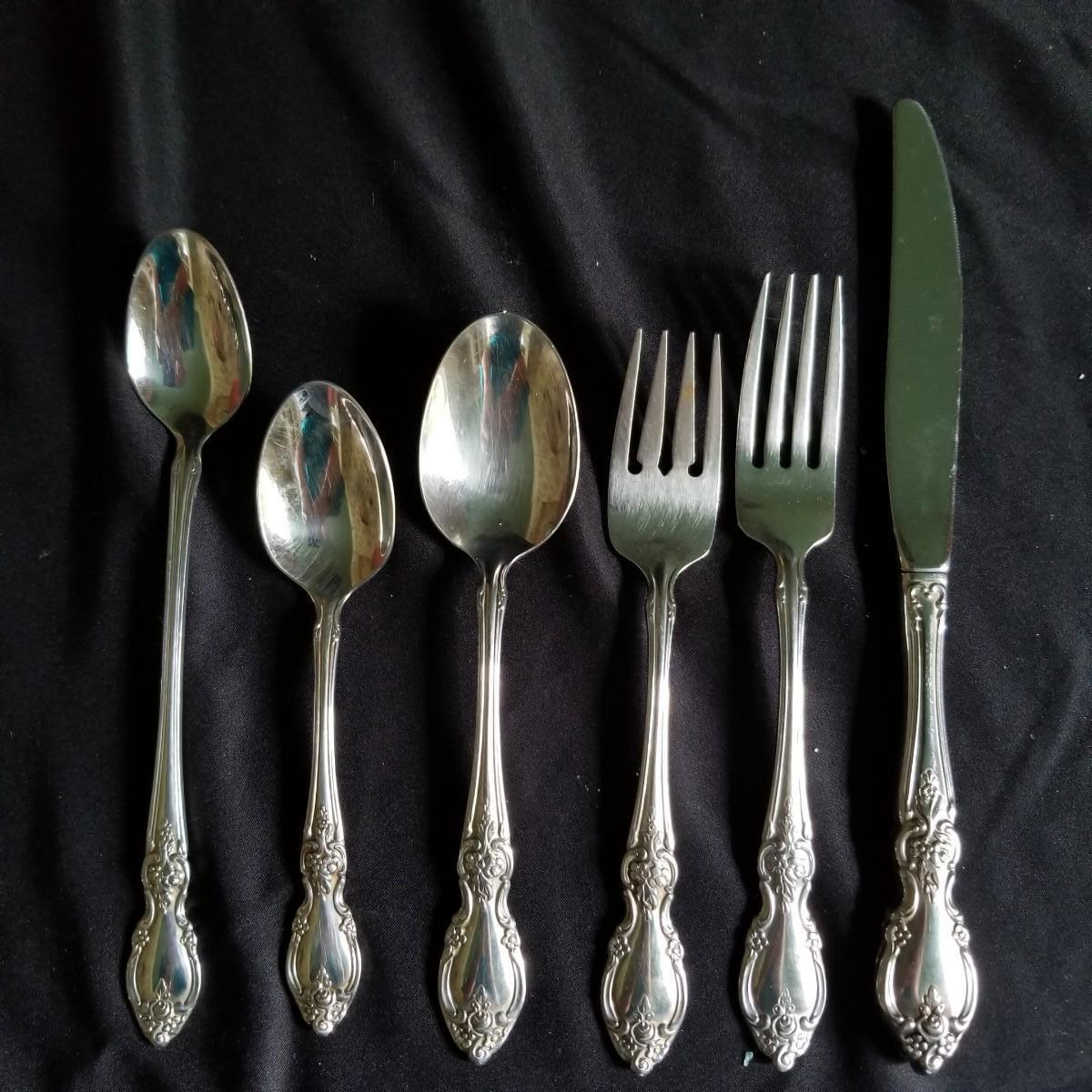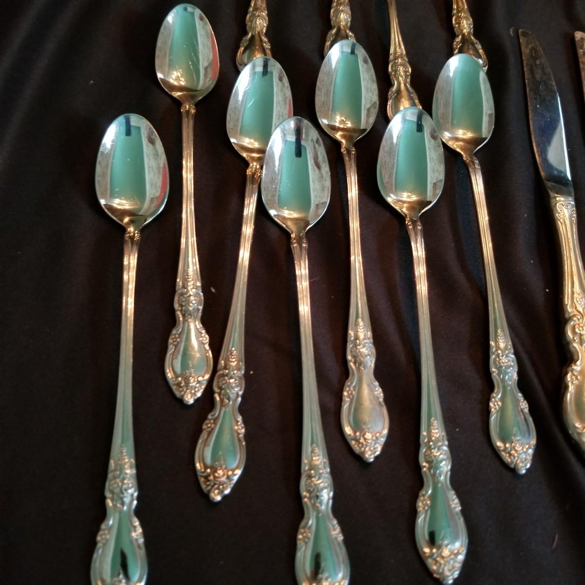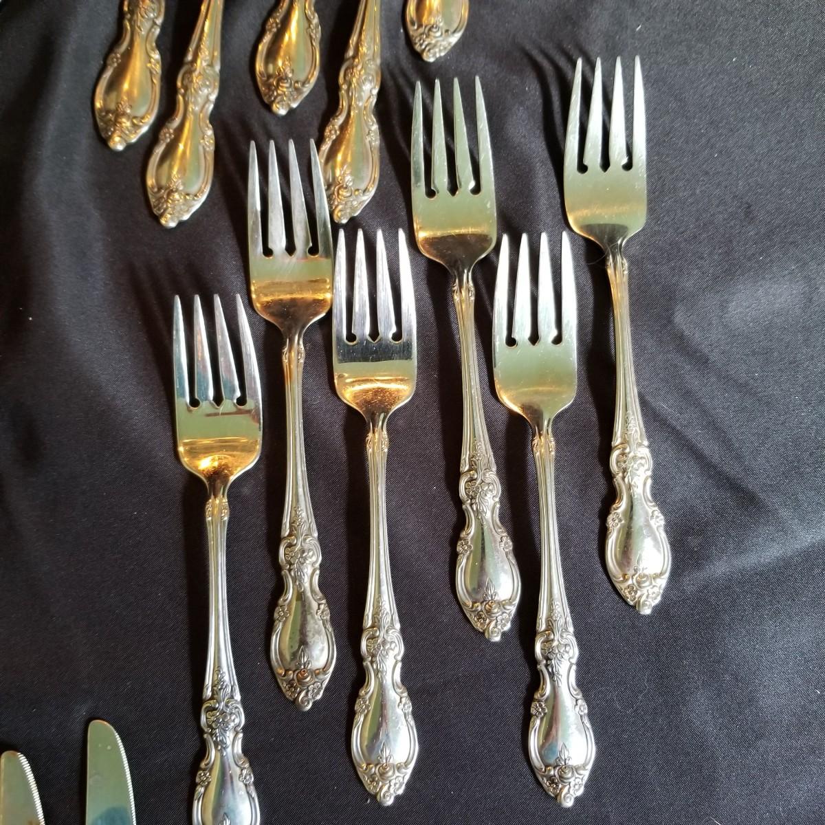 Oneida Community stainless flatware in the Louisiana pattern. Set includes: fourteen dinner knives, five dinner forks, six dessert forks, seven table spoons, four tea spoons, seven ice tea spoons. Serving pieces included are: two butter knives, two solid spoons, two slotted spoons, one meat fork, one pie server, one soup ladle and one sugar spoon. Items show normal wear. Shipping available.