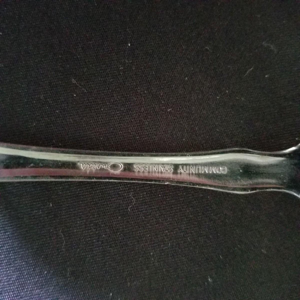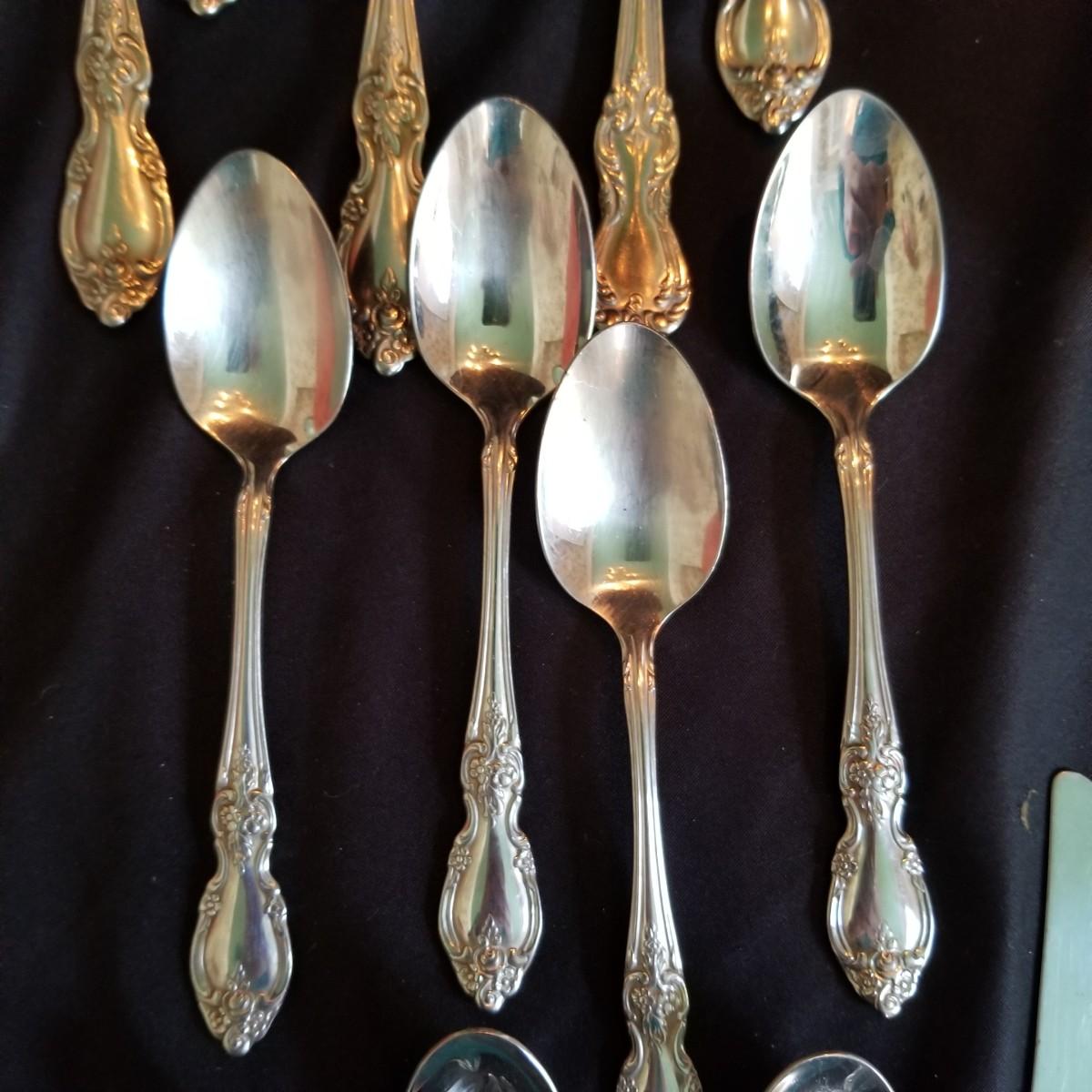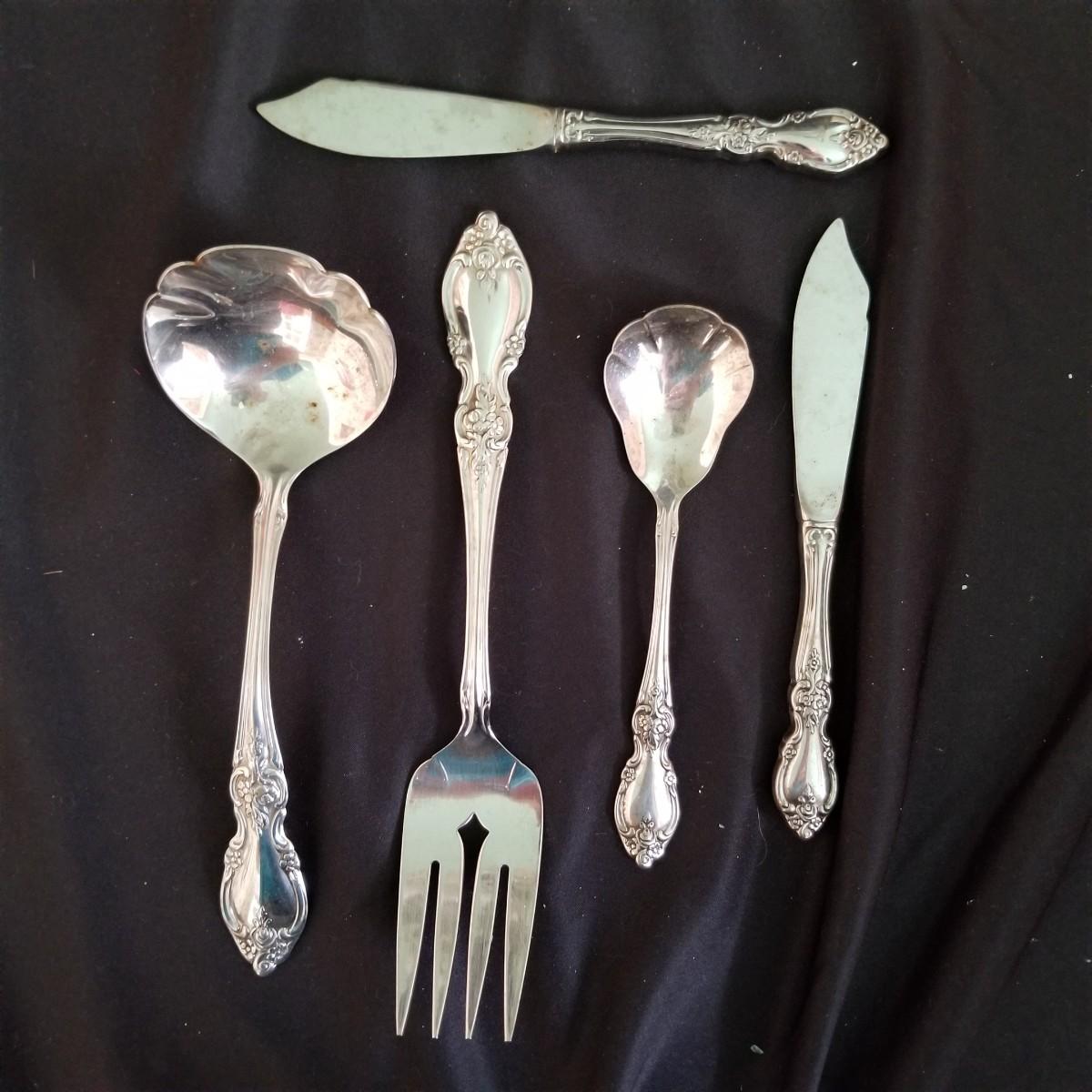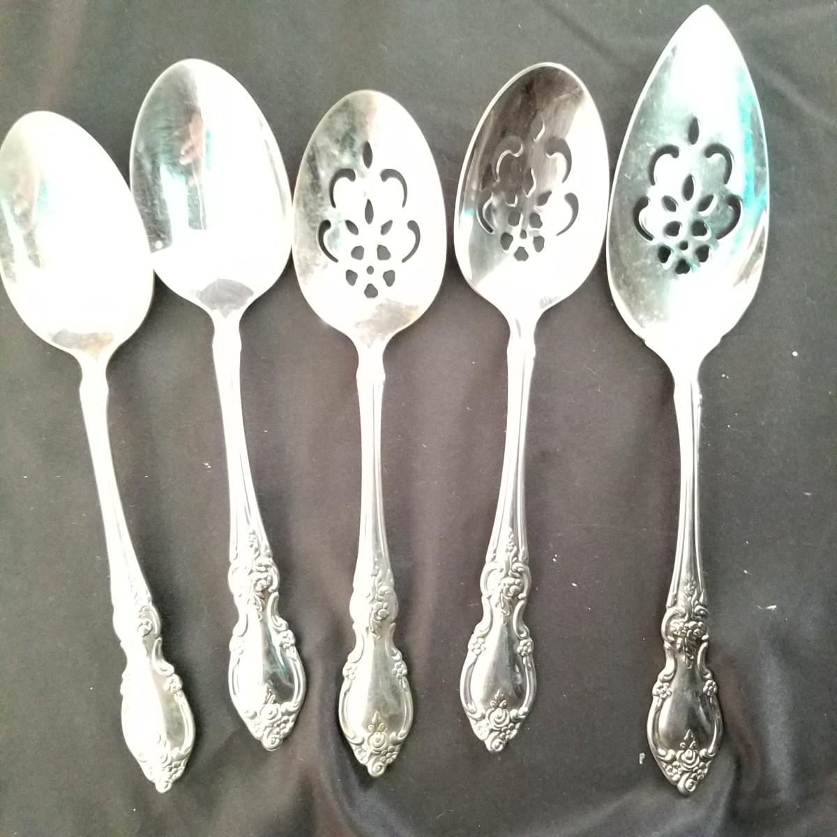 Oneida Community stainless flatware in the Louisiana pattern. Set includes: fourteen dinner knives, five dinner forks, six dessert forks, seven table spoons, four tea spoons, seven ice tea spoons. Serving pieces included are: two butter knives, two solid spoons, two slotted spoons, one meat fork, one pie server, one soup ladle and one sugar spoon. Items show normal wear. Shipping available.
