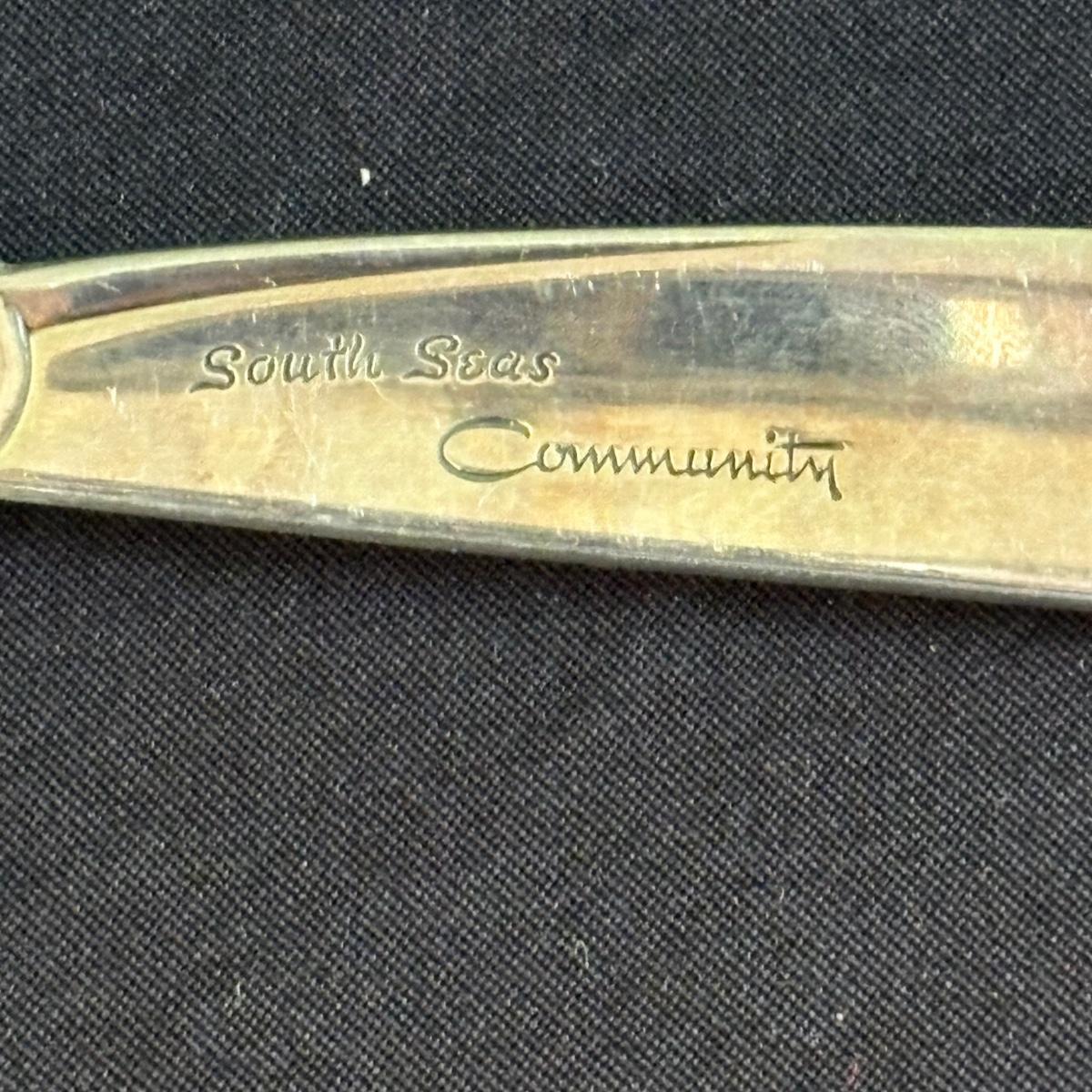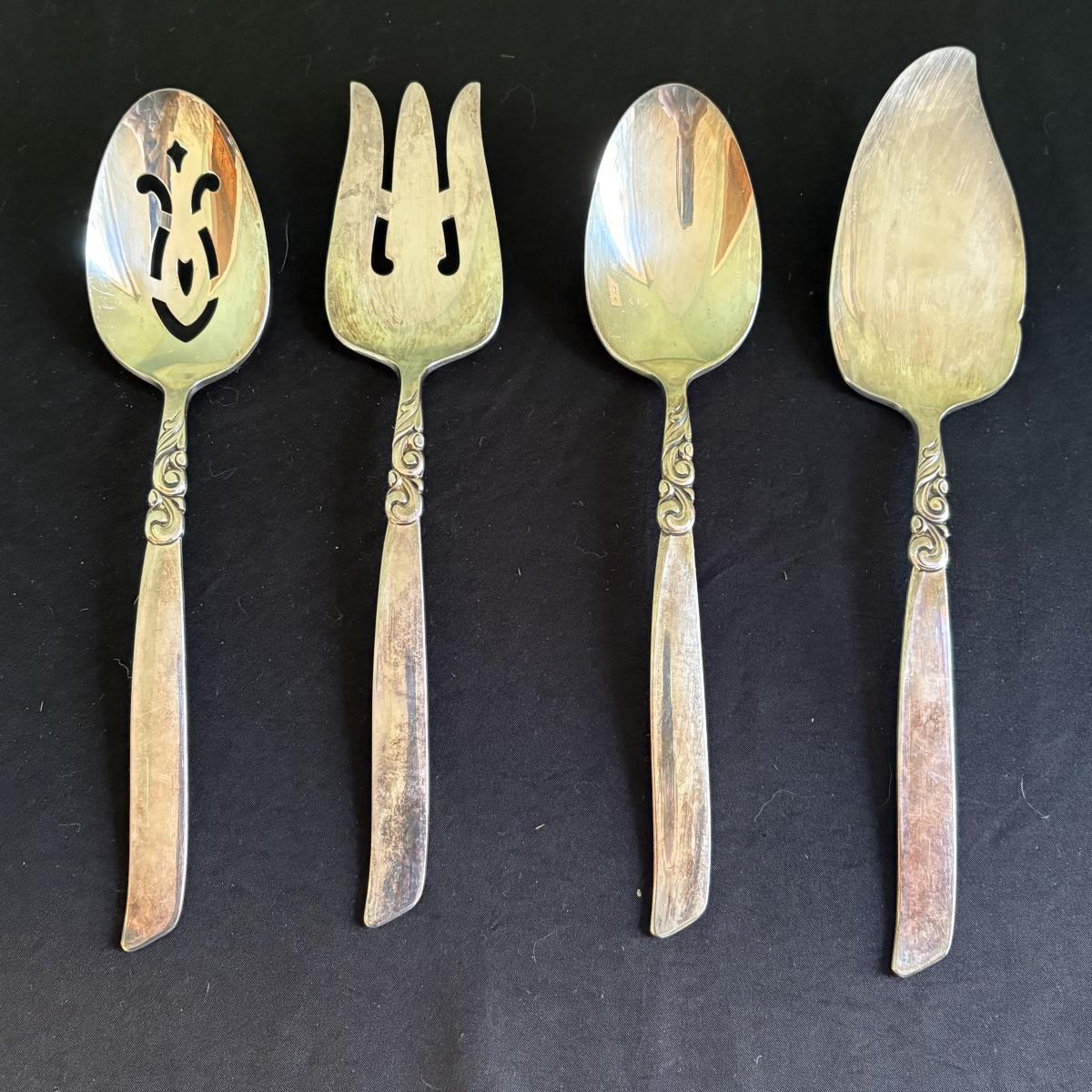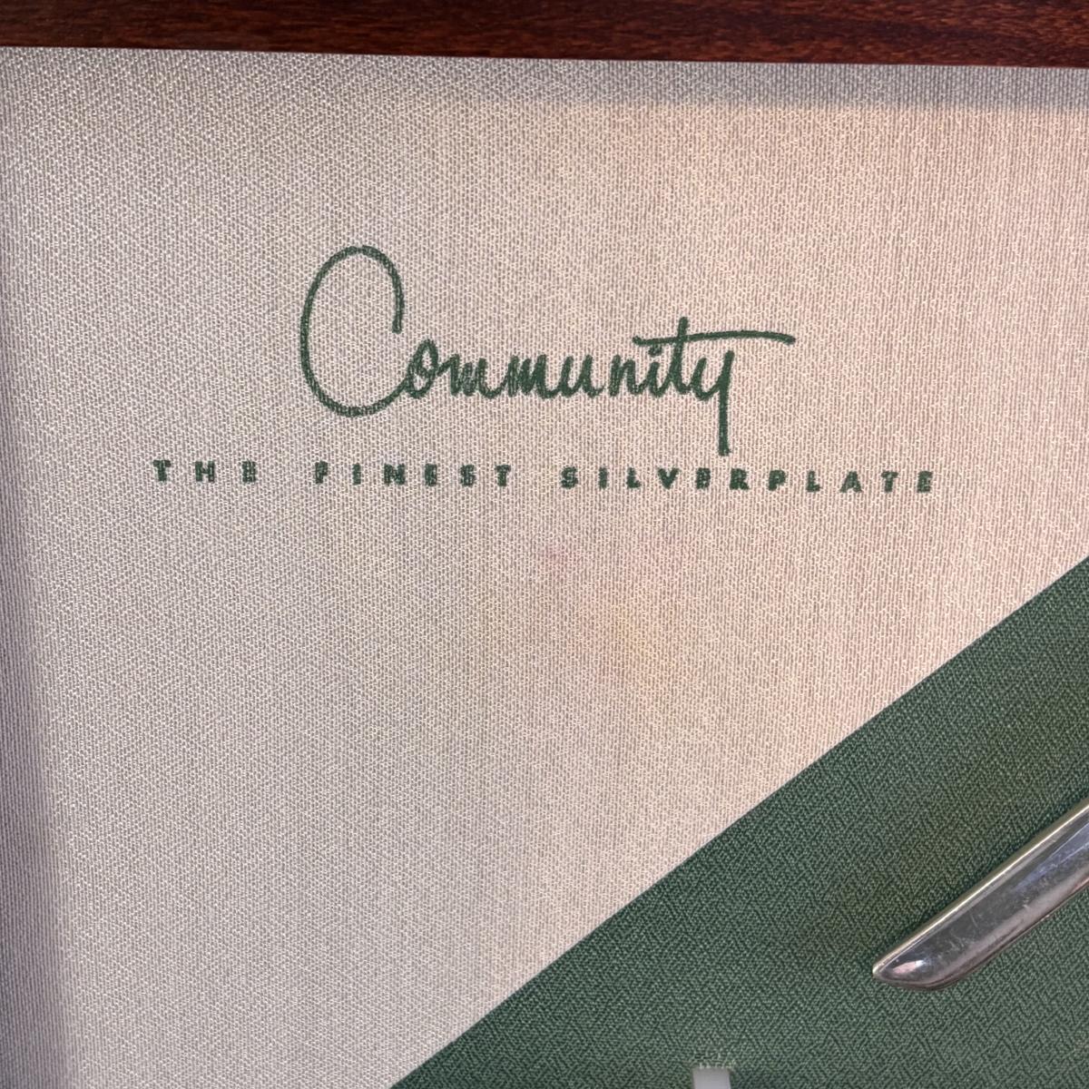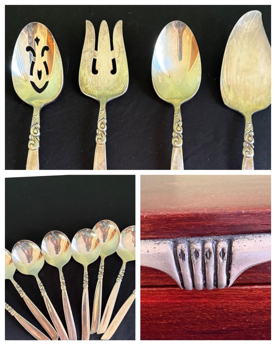 This silver plated Oneida flatware set includes the following: four serving utensils, three bonbon spoons, one butter knife, eight dinner forks, eight salad forks, fifteen teaspoons, eight soup spoons, eight iced tea spoons, and eight dinner knives. The pattern is South Seas, which was discontinued around 1965. There are signs of patina and age, see pictures for reference. The measurements of the utensil box are approximately 10.5" x 6"H and the serving spoon is 8.5".