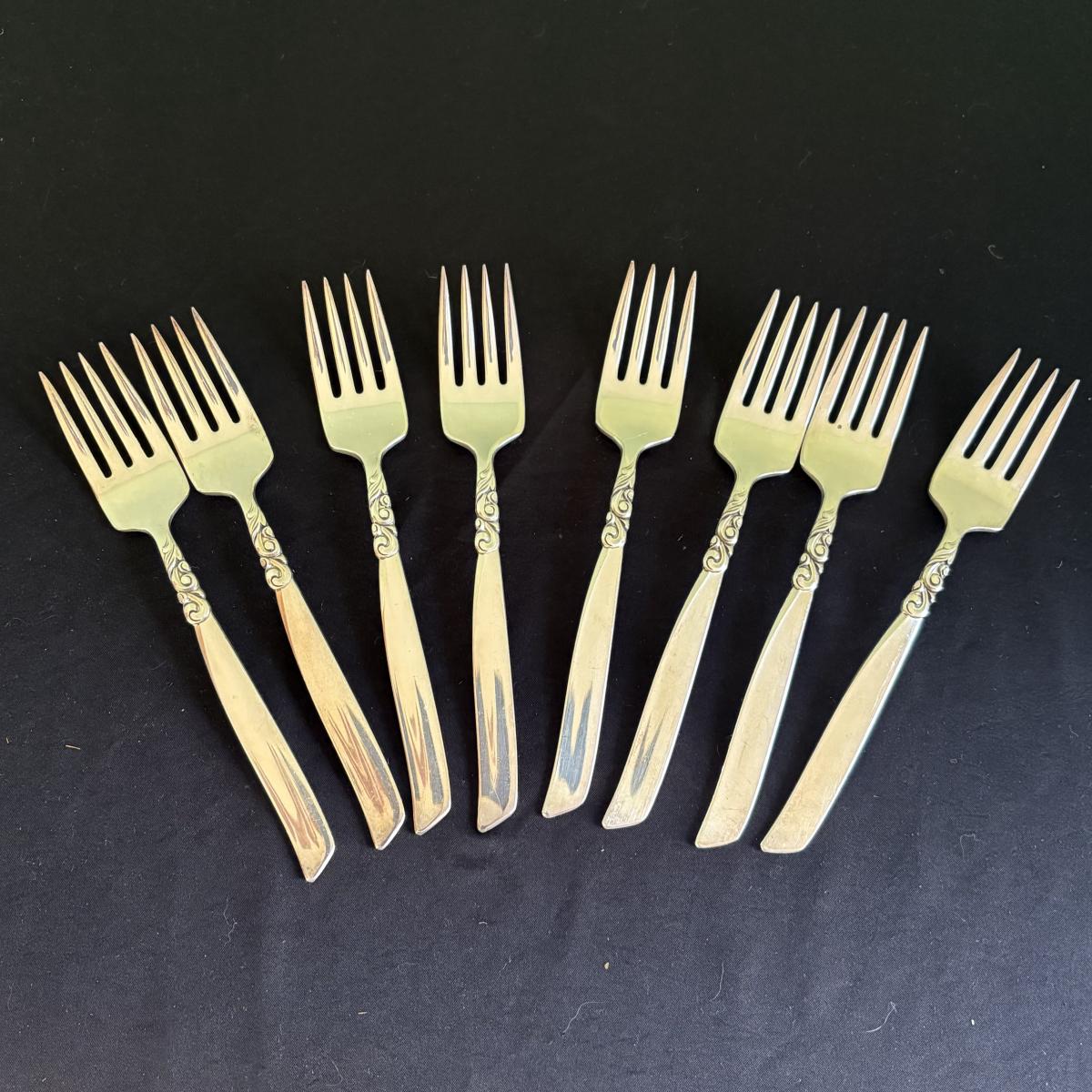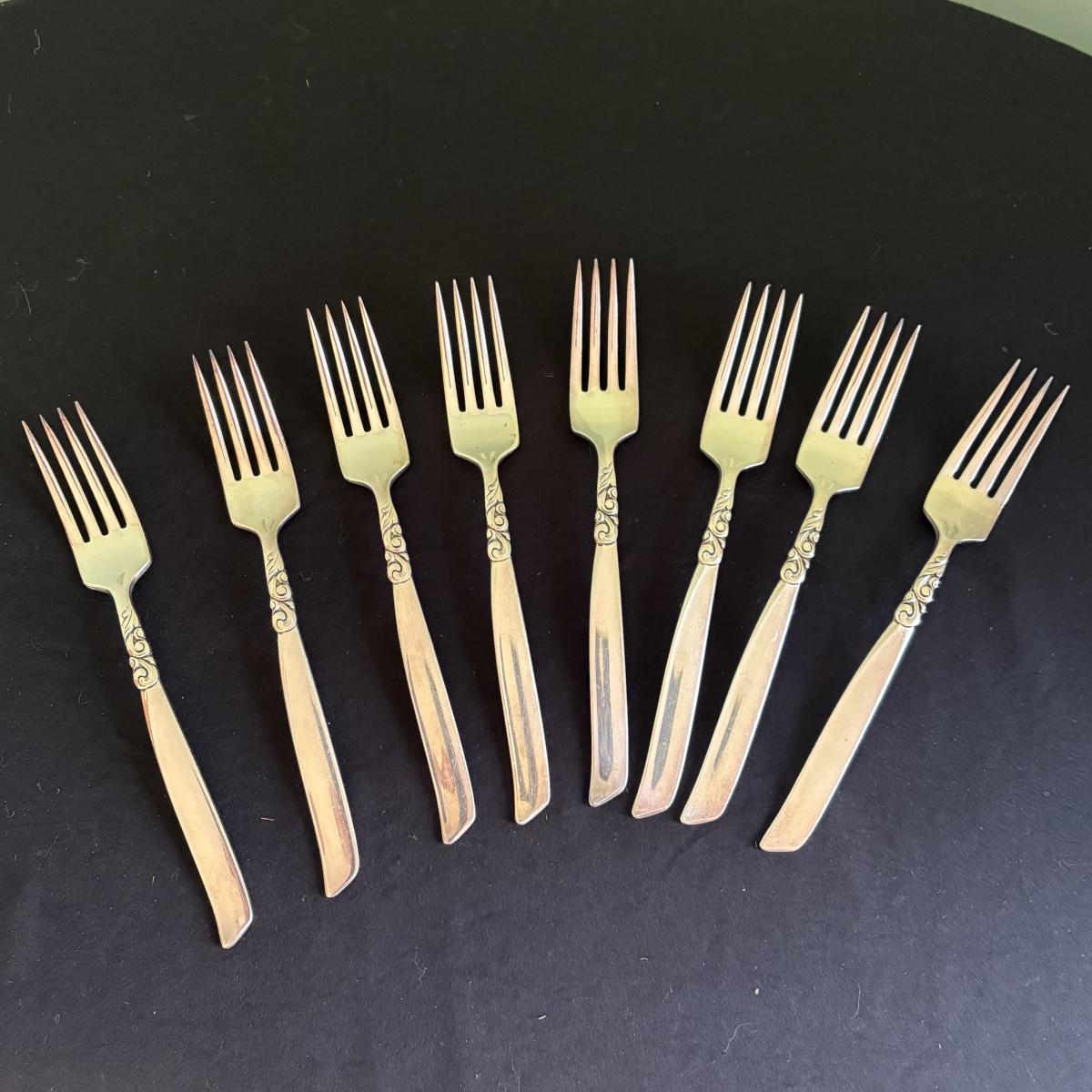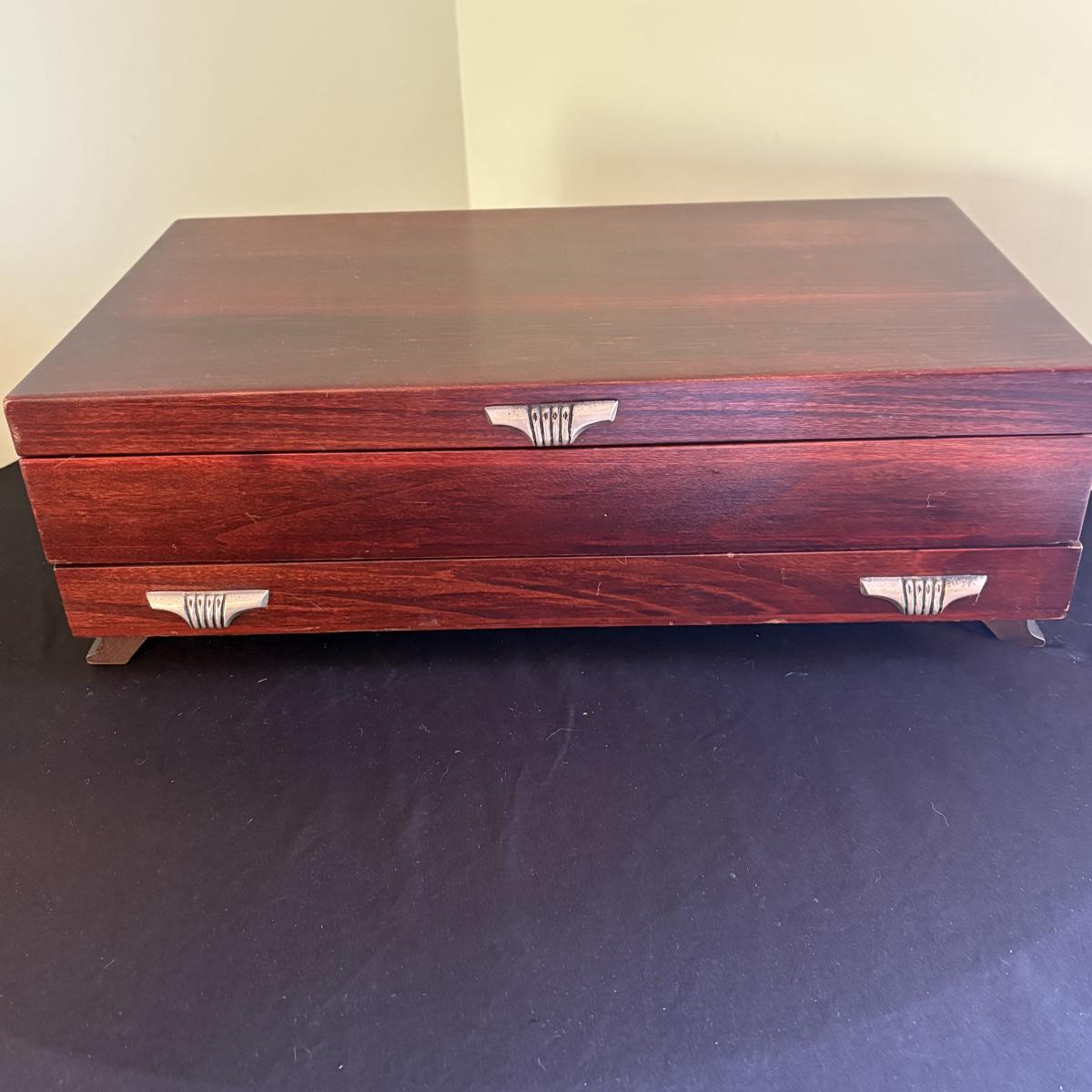 This silver plated Oneida flatware set includes the following: four serving utensils, three bonbon spoons, one butter knife, eight dinner forks, eight salad forks, fifteen teaspoons, eight soup spoons, eight iced tea spoons, and eight dinner knives. The pattern is South Seas, which was discontinued around 1965. There are signs of patina and age, see pictures for reference. The measurements of the utensil box are approximately 10.5" x 6"H and the serving spoon is 8.5".