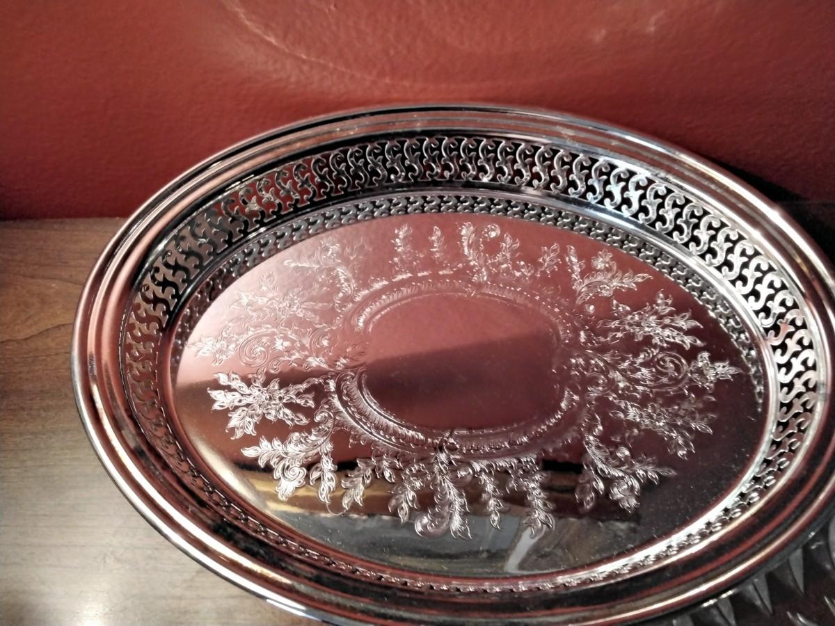 Brand new unused Oneida silver-plated basket and crystal two sided condiment set.