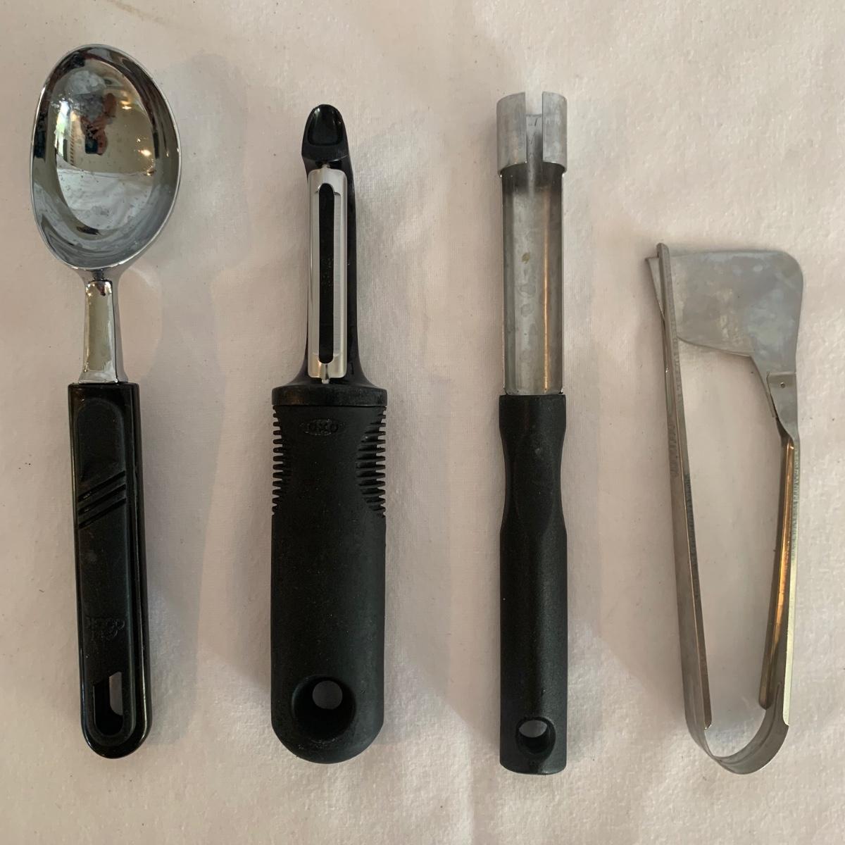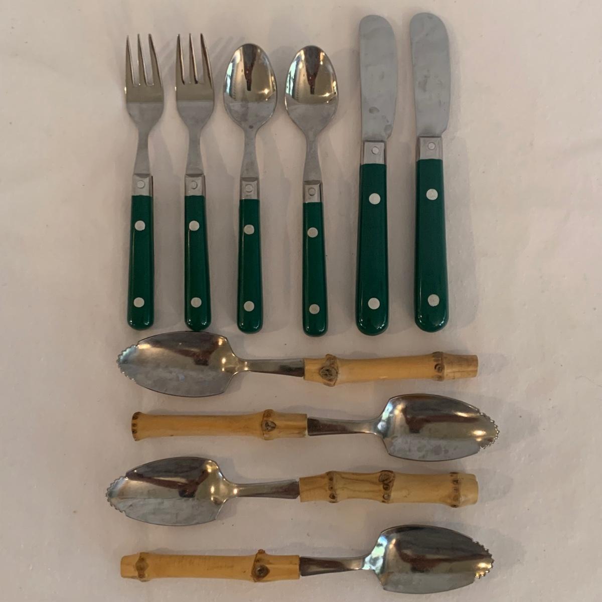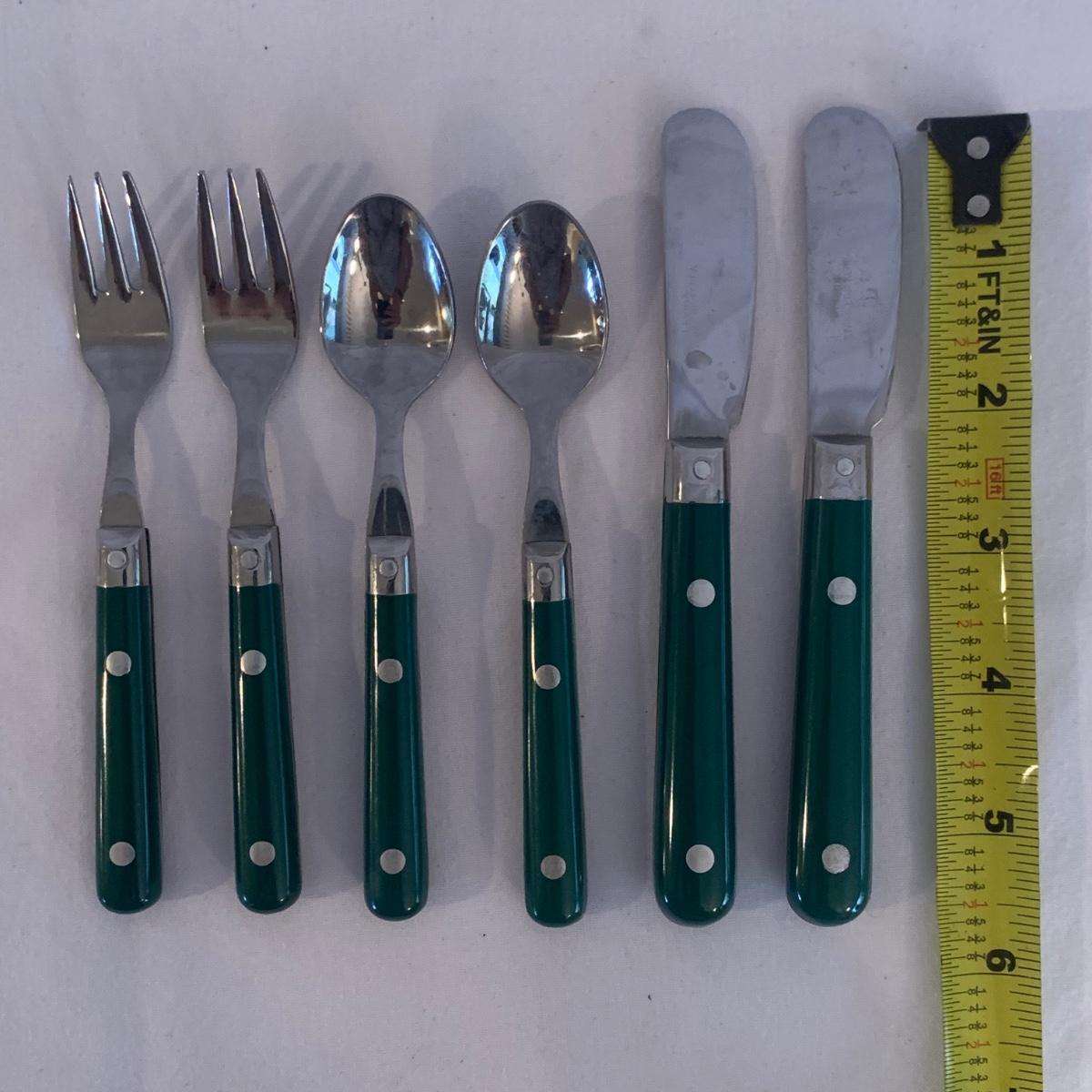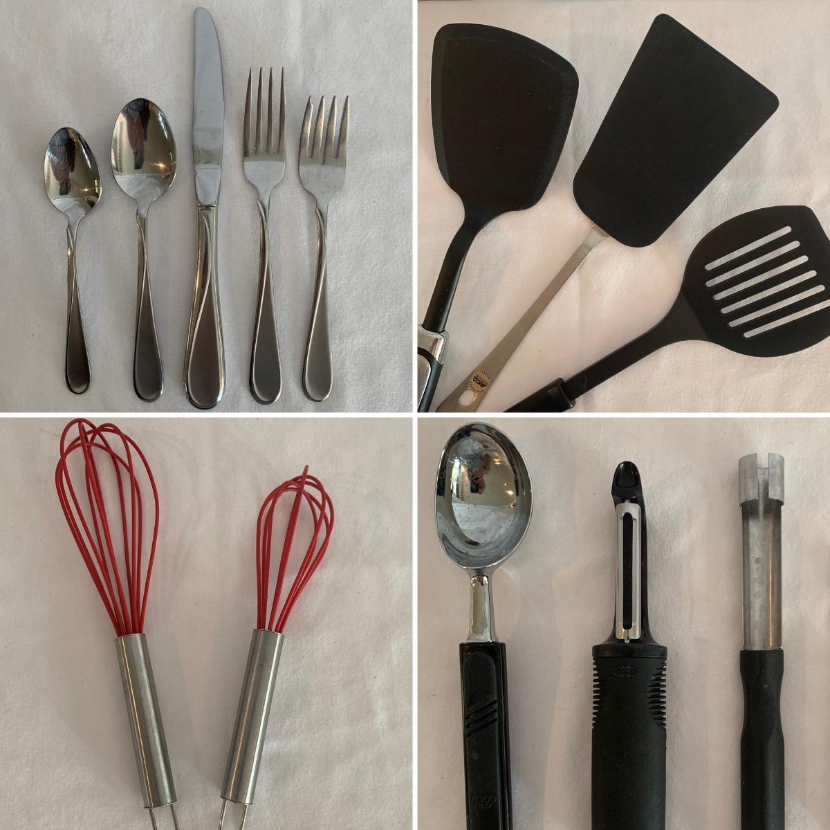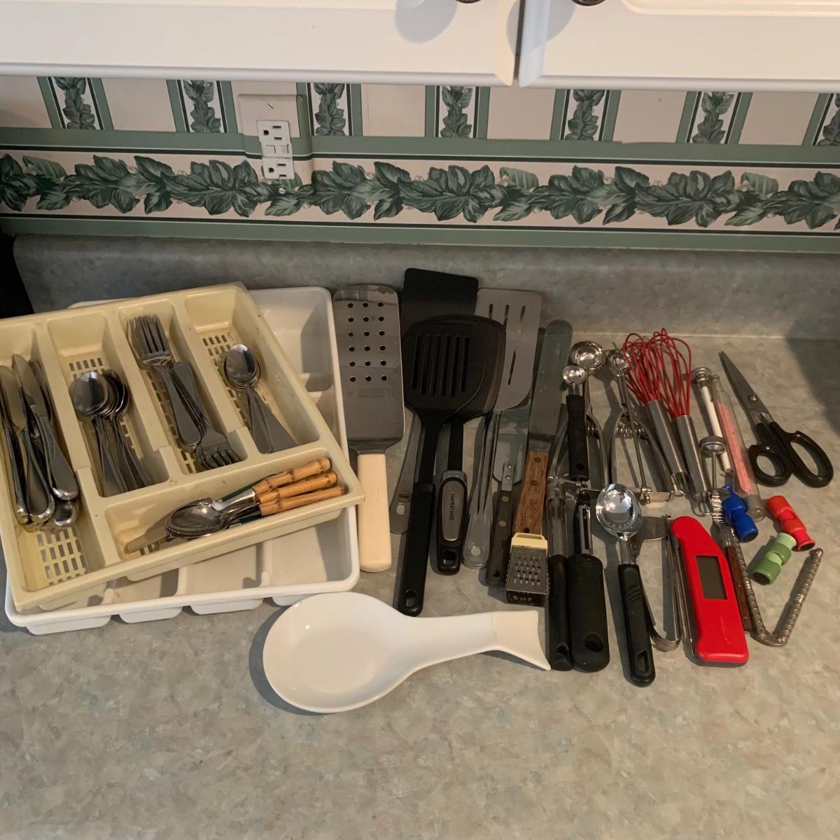Many kitchen utensils and an Oneida cutlery set, a great kitchen starter kit! The Oneida cutlery set has seven knives, dinner forks, salad forks, eight larger spoons, and six smaller spoons. There is a small two person cutlery set with green plastic handles and four grapefruit spoons with bamboo handles. 25+ utensils are included, as well as two drawer organizers. The white Rubbermaid organizer is 12” x 16” x 2.5”H. Please see photos for utensils inventory.