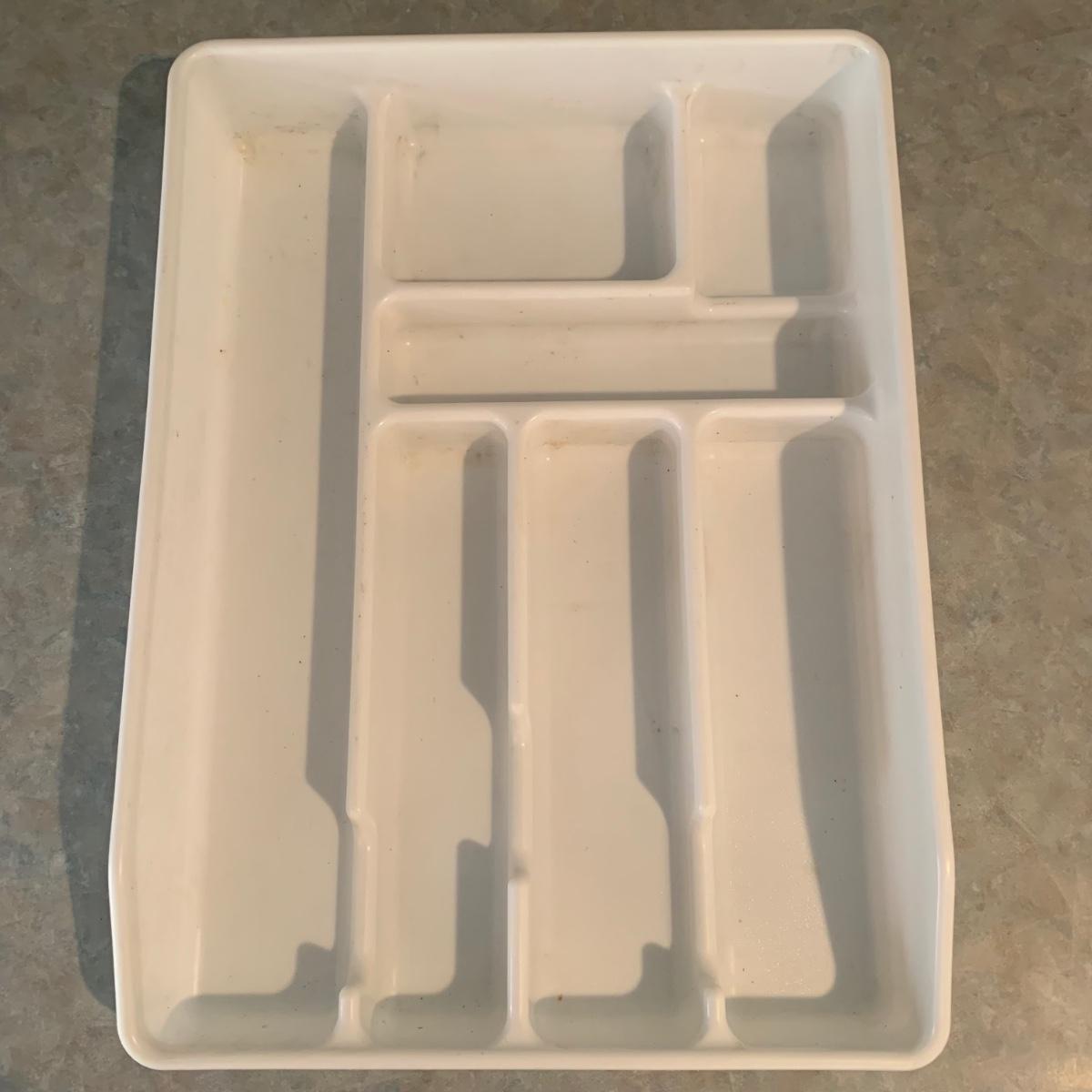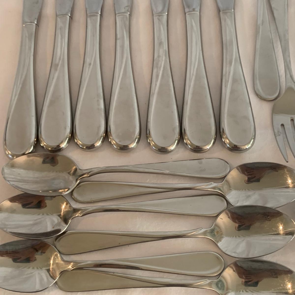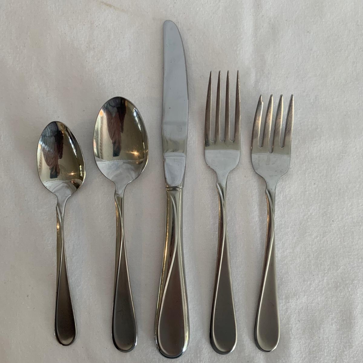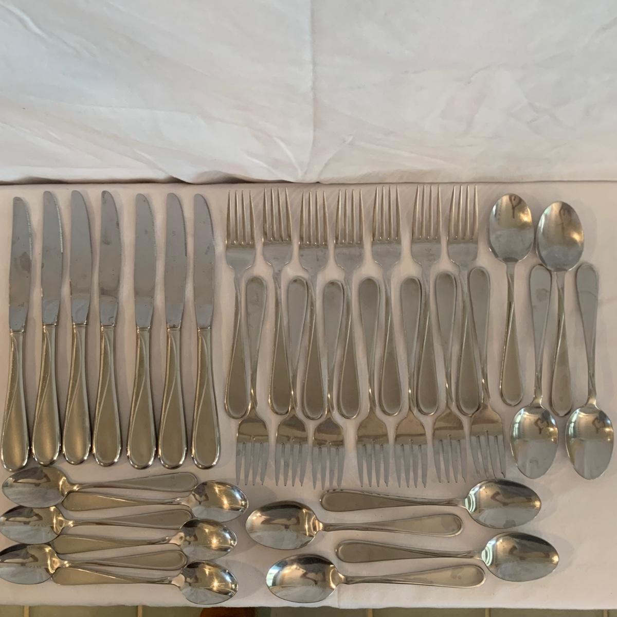 Many kitchen utensils and an Oneida cutlery set, a great kitchen starter kit! The Oneida cutlery set has seven knives, dinner forks, salad forks, eight larger spoons, and six smaller spoons. There is a small two person cutlery set with green plastic handles and four grapefruit spoons with bamboo handles. 25+ utensils are included, as well as two drawer organizers. The white Rubbermaid organizer is 12” x 16” x 2.5”H. Please see photos for utensils inventory.
