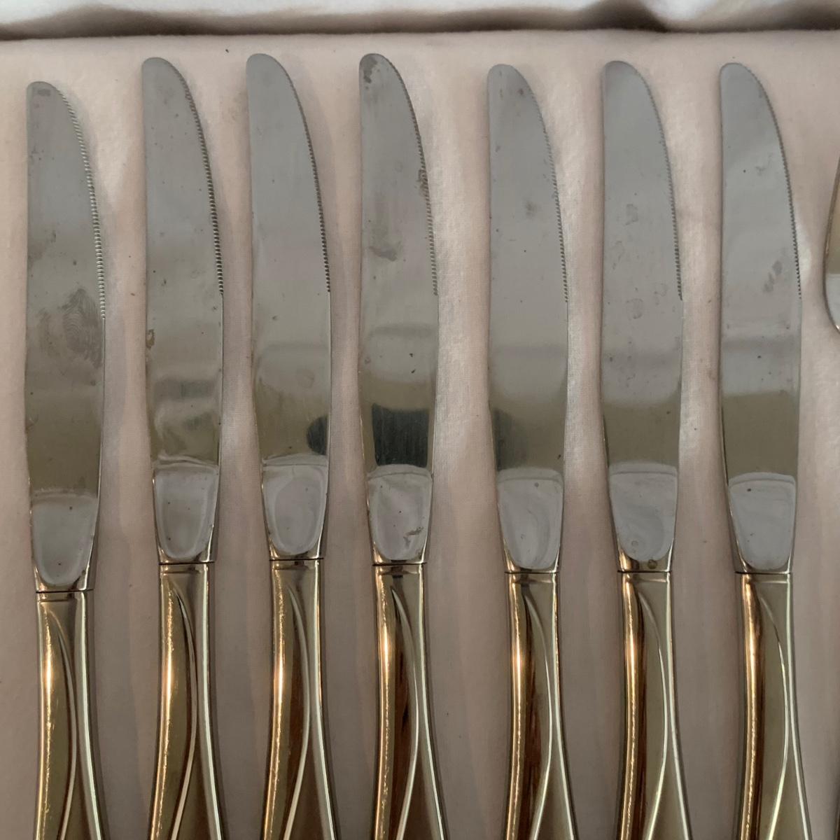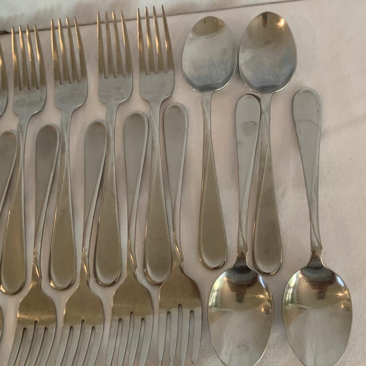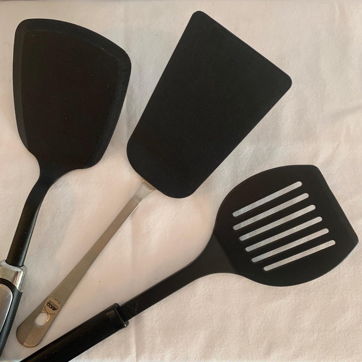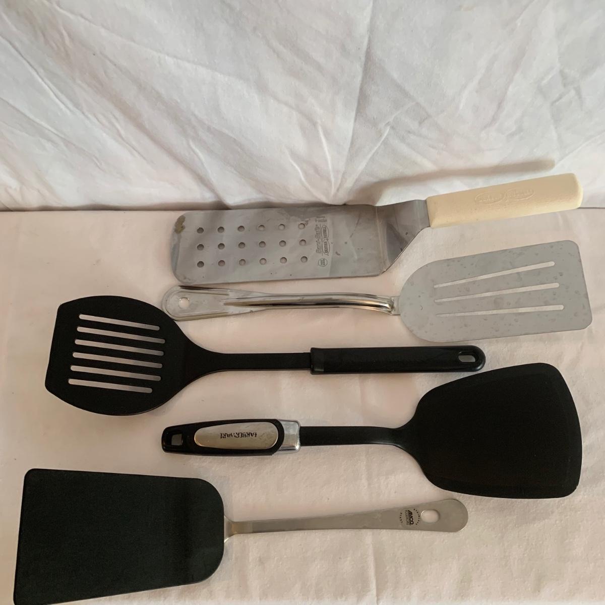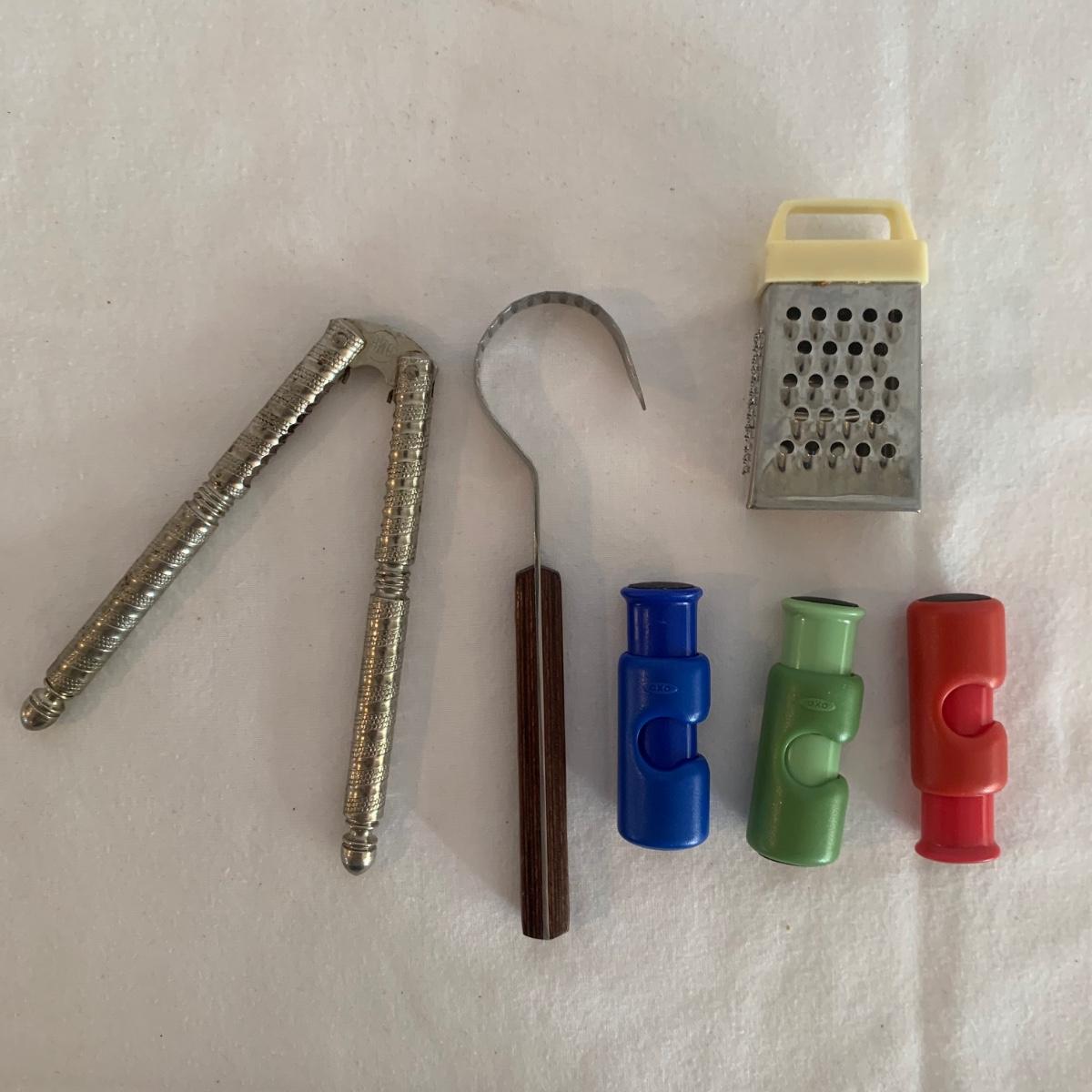 Many kitchen utensils and an Oneida cutlery set, a great kitchen starter kit! The Oneida cutlery set has seven knives, dinner forks, salad forks, eight larger spoons, and six smaller spoons. There is a small two person cutlery set with green plastic handles and four grapefruit spoons with bamboo handles. 25+ utensils are included, as well as two drawer organizers. The white Rubbermaid organizer is 12” x 16” x 2.5”H. Please see photos for utensils inventory.