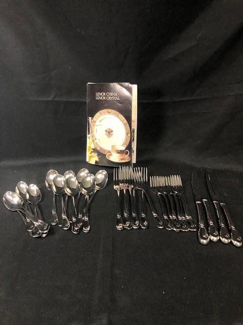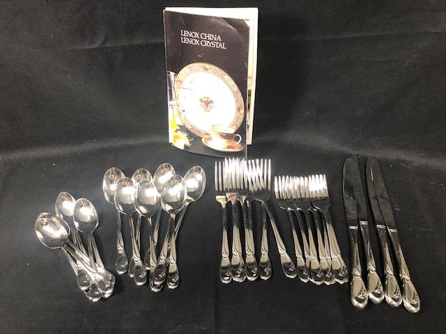 Oneida Deluxe Flatware. Not a complete set. Good Condition. Included is a Lenox crystal & china booklet.