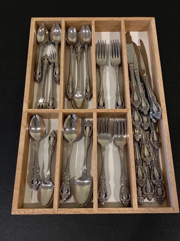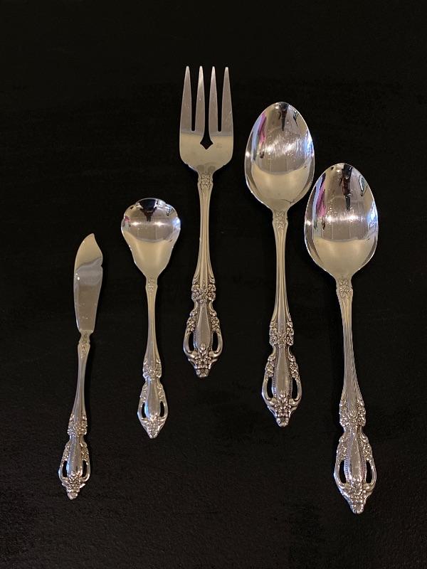 14 of each, Knives, Dinner Forks, Long Stem Tea Spoons, salad forks, soup spoons, cocktail forks, tea spoons, grapefruit spoons